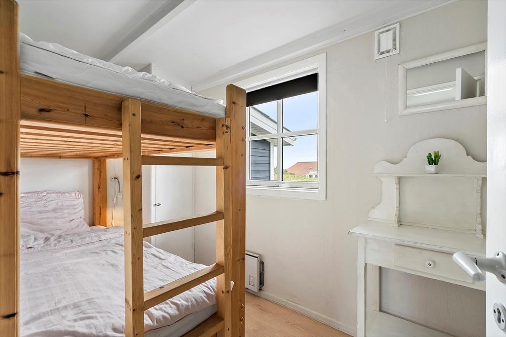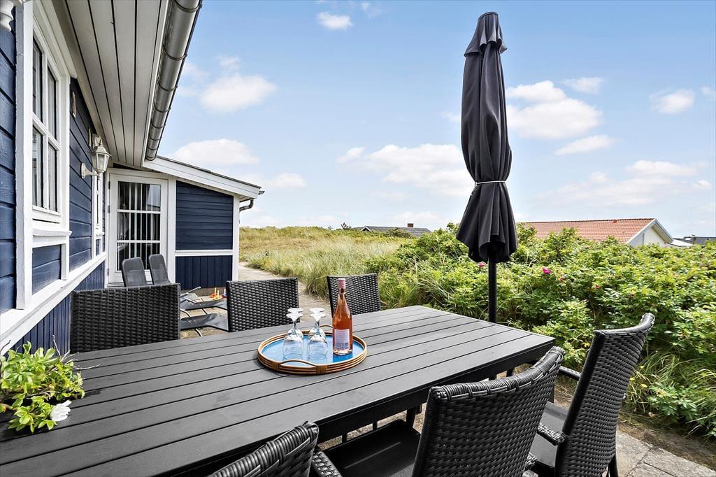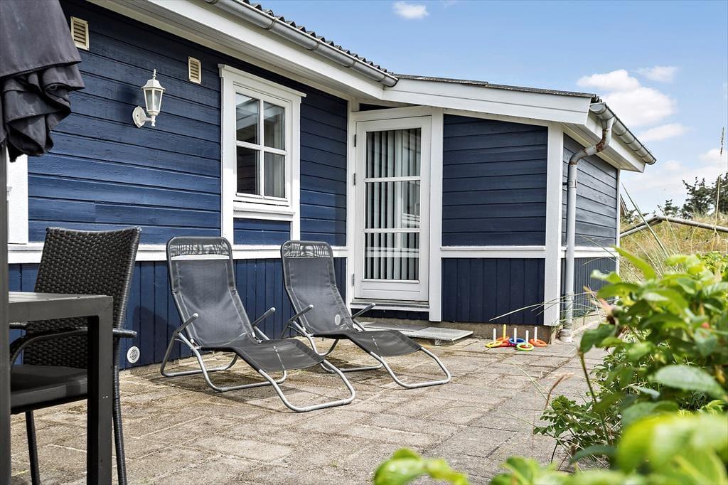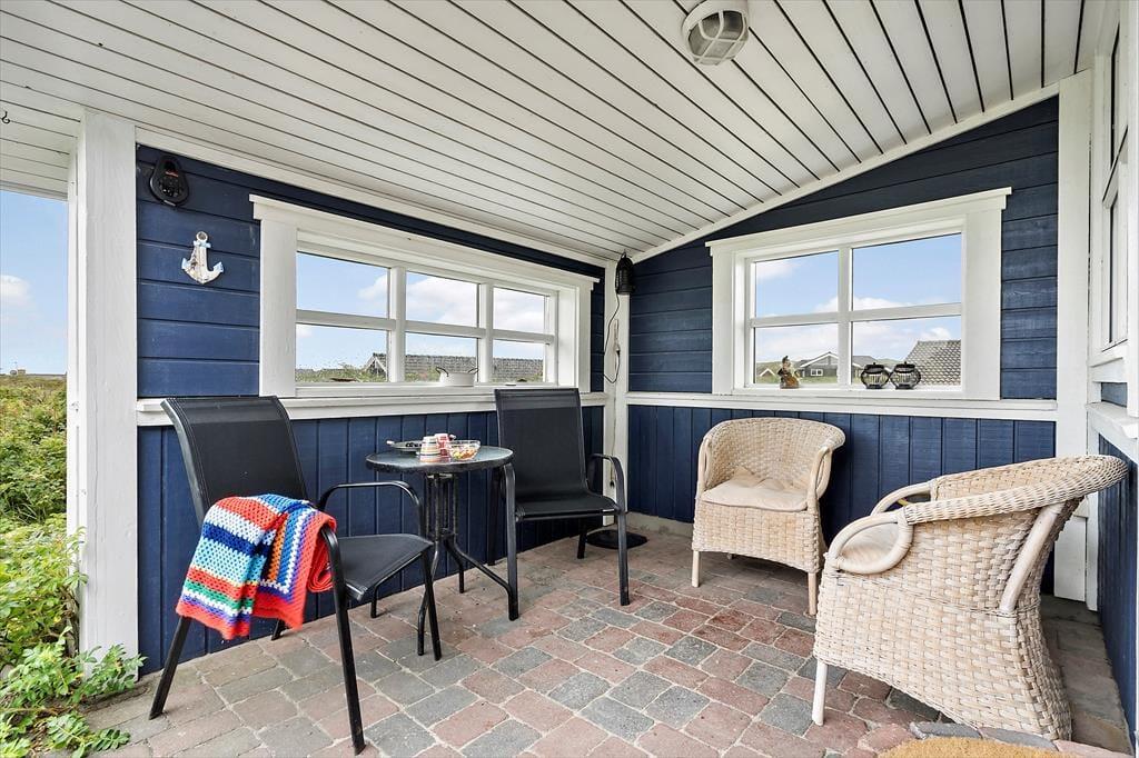 Sommerhusets terrassemiljø vil med garanti vække glæde, når solen står højt på den blå himmel, for det er et skønt sted at sidde og kigge ud over det naturskønne område. På østsiden af huset kan du drikke morgenkaffe i dagens første stråler, og senere kan du rykke om på den åbne sydterrasse – eller flytte driverlivet ind på det overdækkede område, der ligger godt i læ af vestenvinden. Til børnene er der sandkasse og gyngestativ på naturgrunden, og ellers har I jo også stranden lige i nærheden, hvis I har brug for mere plads at boltre jer på.