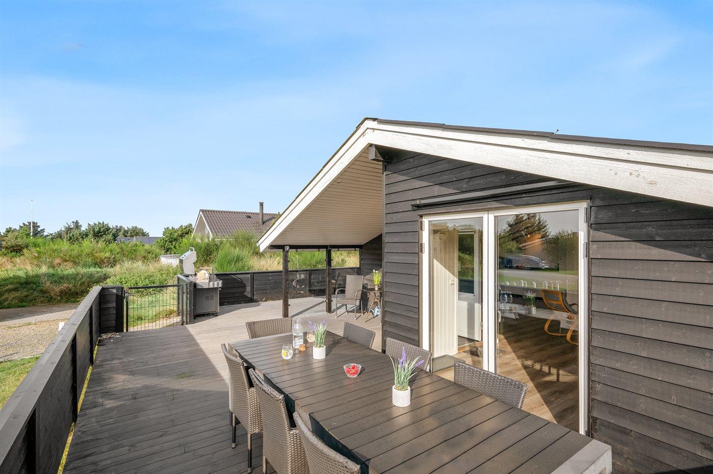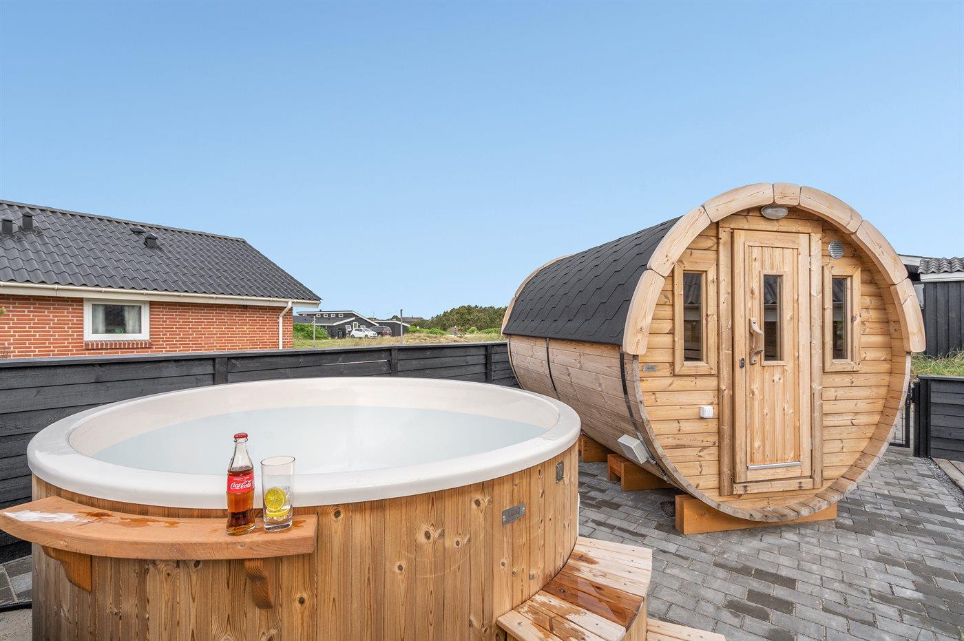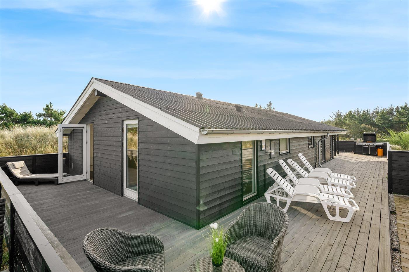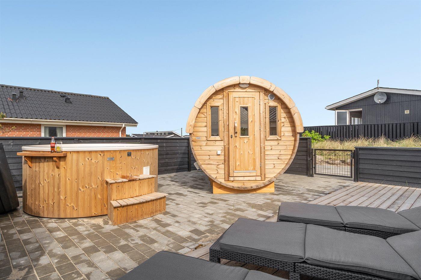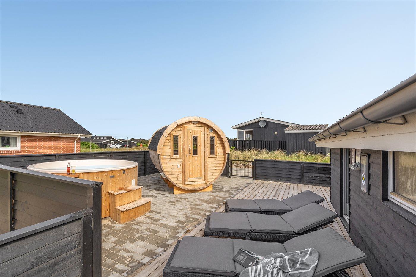 Fra stuen træder man ud på den dejlige 80 m² store lukkede terrasse, hvoraf 8 m² er overdækket. Her står en gasgrill, havemøbler og liggestole klar, så man kan udnytte de varme solskinsdage til fulde, om aftenen kan man slutte af med en lækker grillmiddag under åben himmel. Til de mindre børn er der gyngestativ. Den indhegnede terrasse har desuden en afdeling med elopvarmet vildmarksbad samt elopvarmet saunatønde med udsigt mod solnedgang over Vesterhavet.