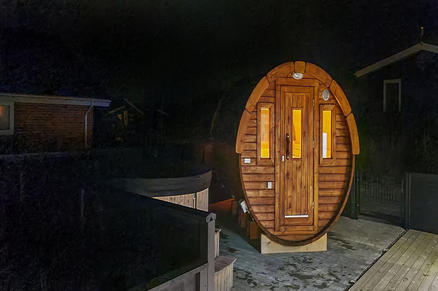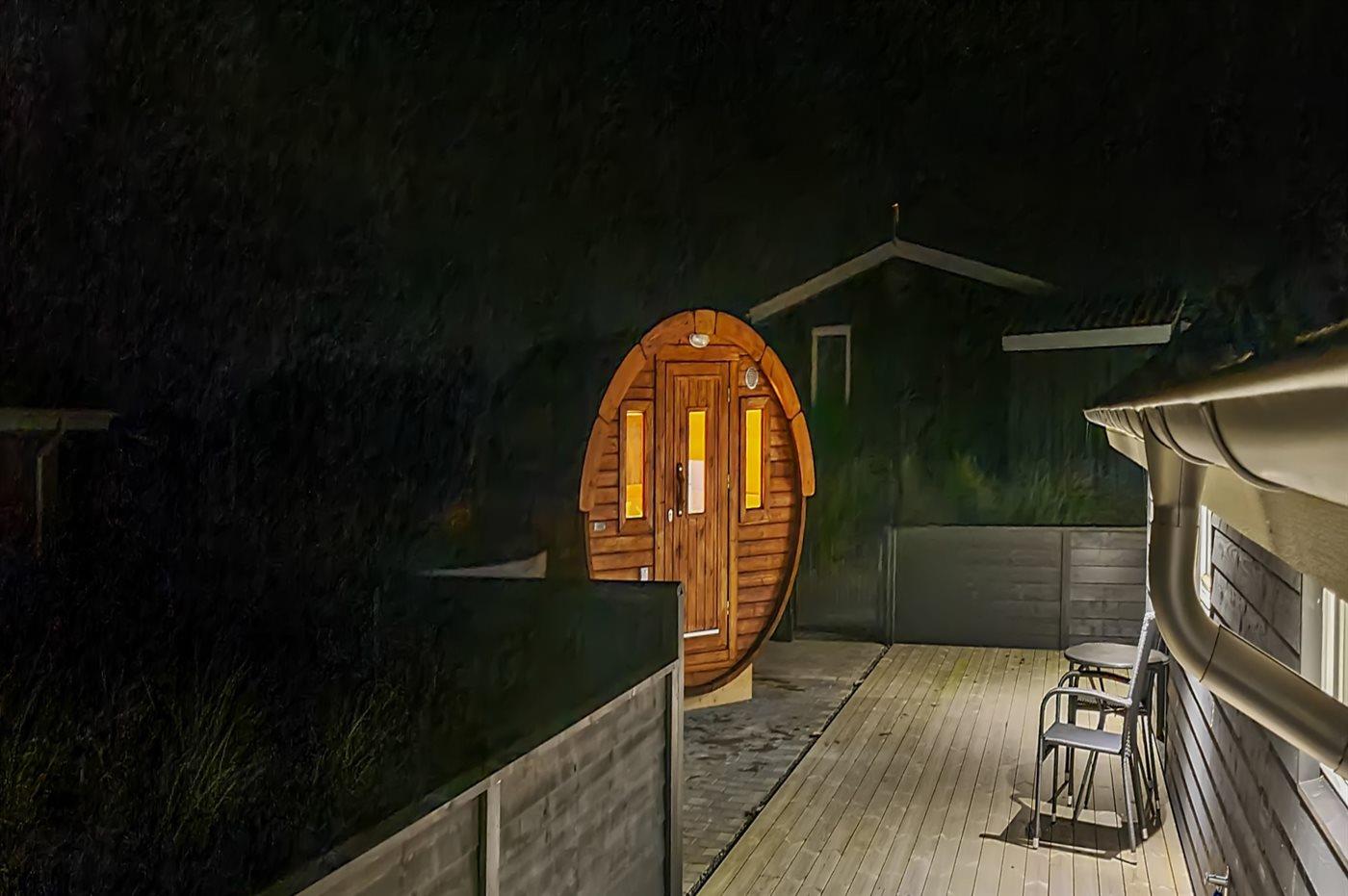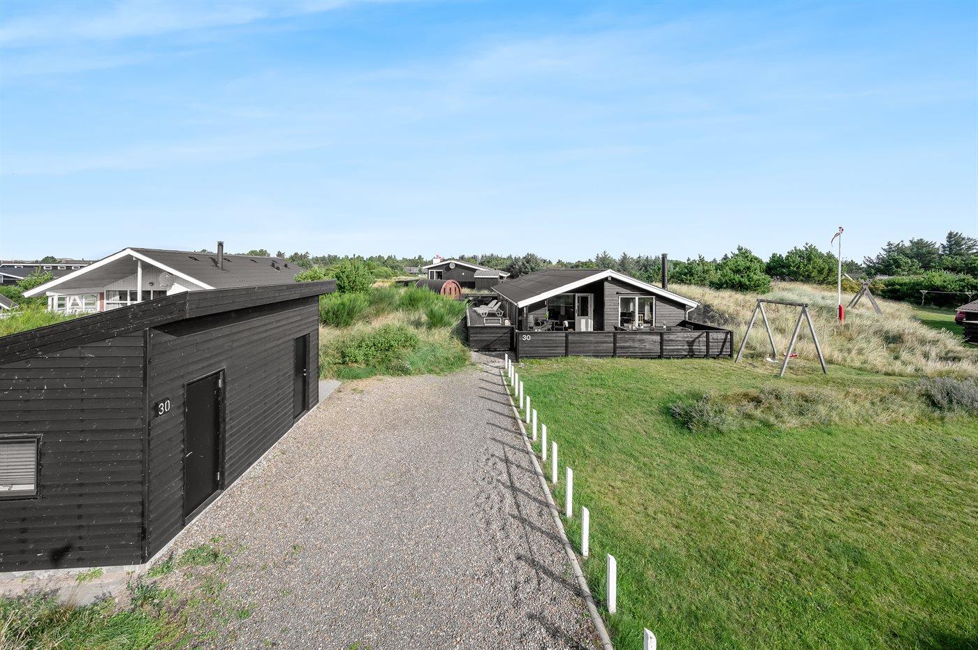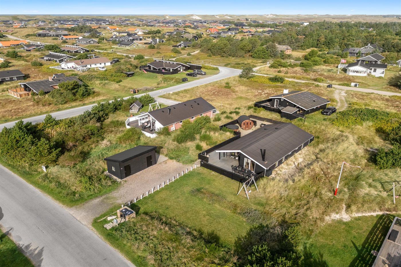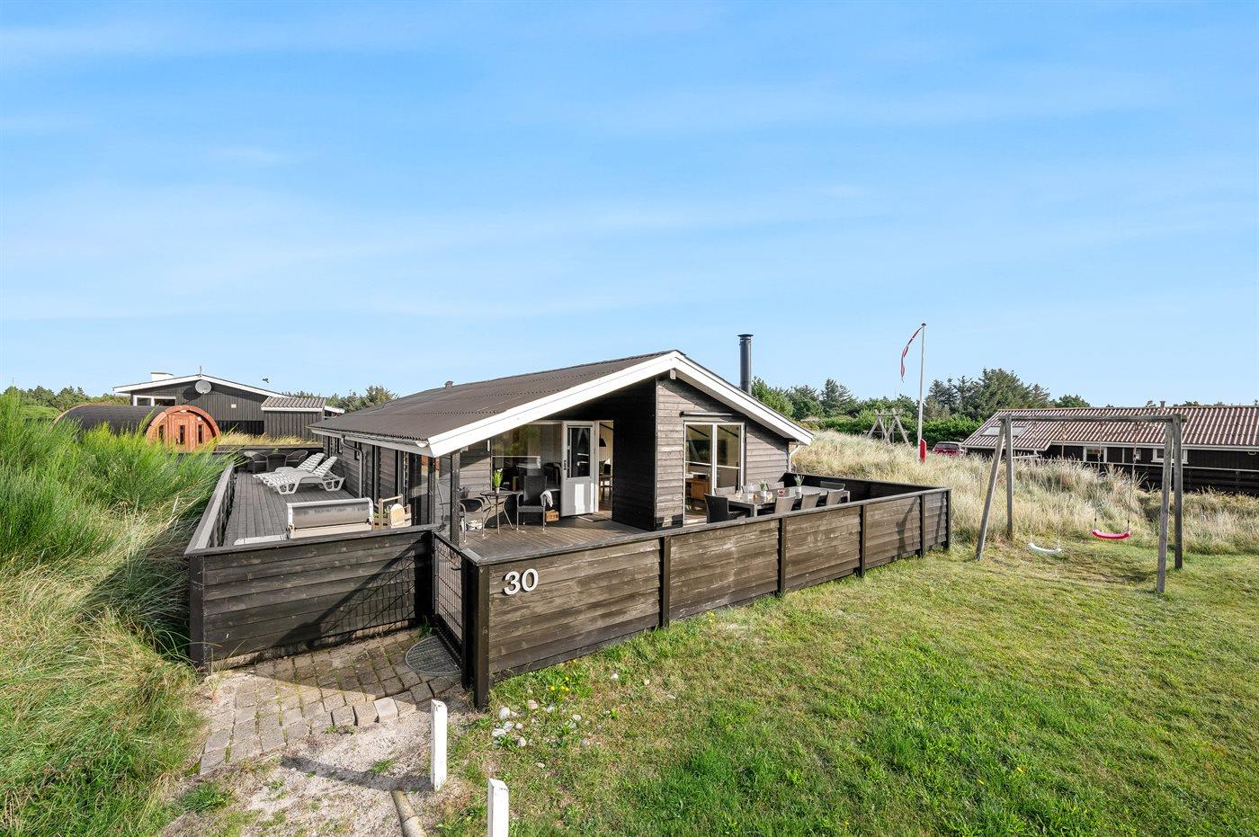 Fra stuen træder man ud på den dejlige 80 m² store lukkede terrasse, hvoraf 8 m² er overdækket. Her står en gasgrill, havemøbler og liggestole klar, så man kan udnytte de varme solskinsdage til fulde, om aftenen kan man slutte af med en lækker grillmiddag under åben himmel. Til de mindre børn er der gyngestativ. Den indhegnede terrasse har desuden en afdeling med elopvarmet vildmarksbad samt elopvarmet saunatønde med udsigt mod solnedgang over Vesterhavet.