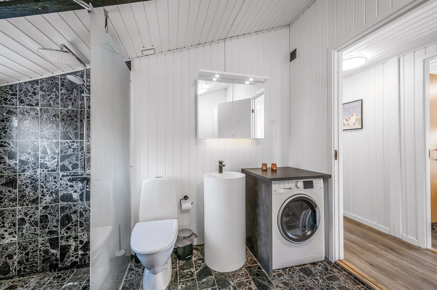 Boligen har ét badeværelse med 1 bruser og 1 toilet. Der er gulvvarme og håndklæderadiator på badeværelset. På badeværelset finder man også en vaskemaskine/tørretumbler, hvis behovet for at vaske tøj skulle opstå.
