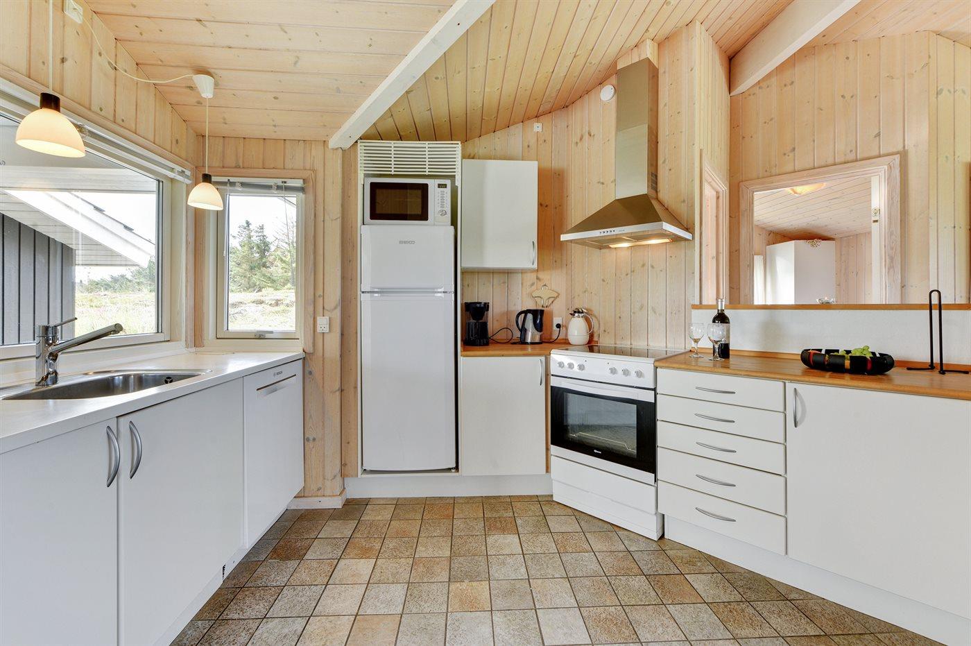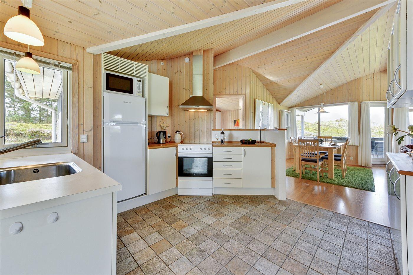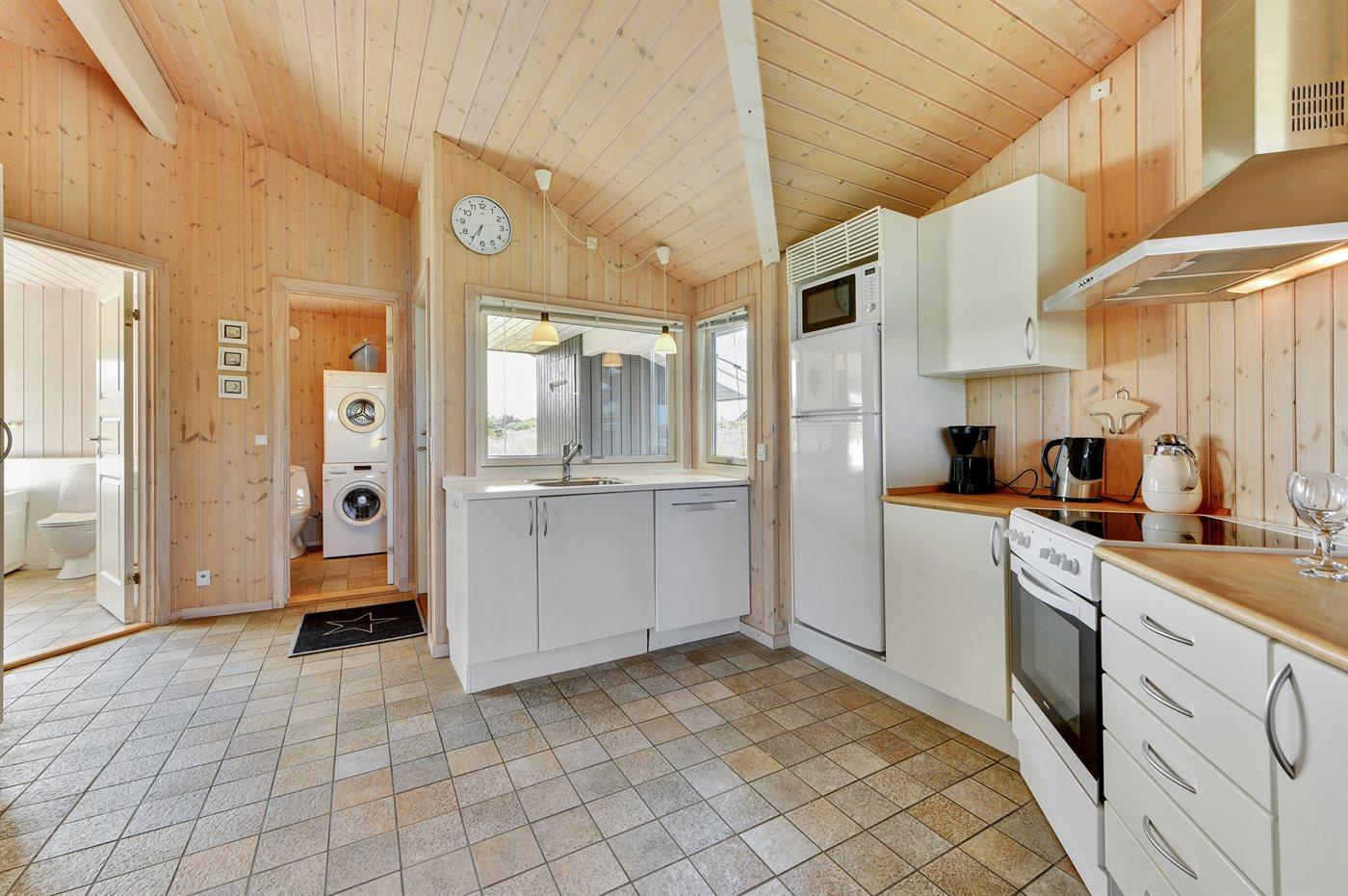 Køkkenet er udstyret med 1 køleskab. Der er 4 keramiske kogeplader, varmluftovn, mikrobølgeovn samt opvaskemaskine.
