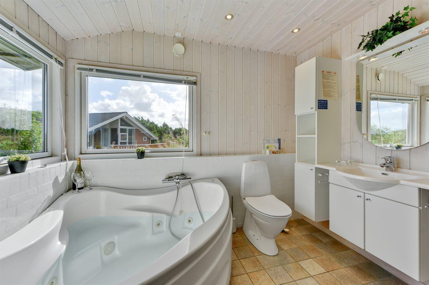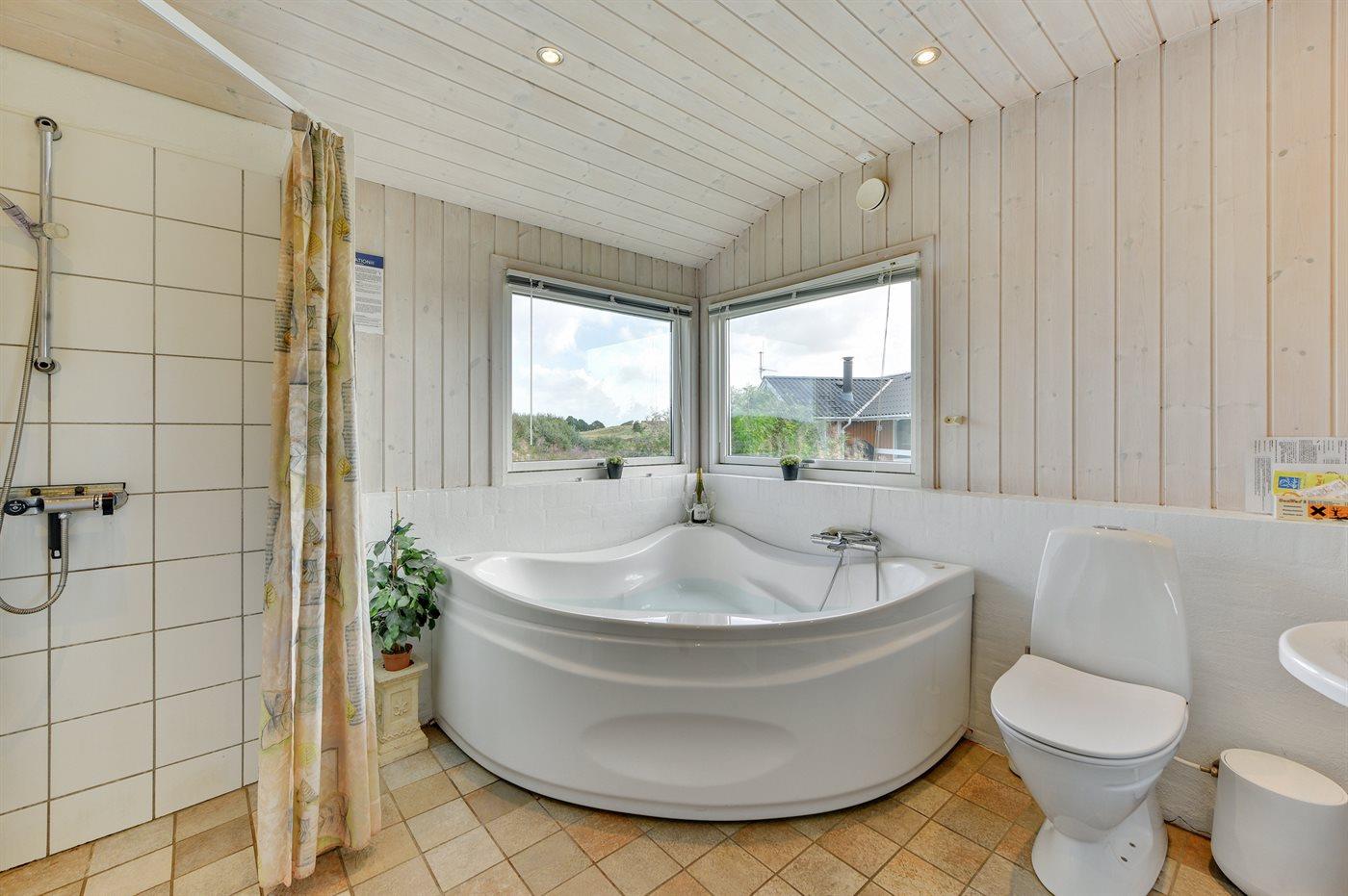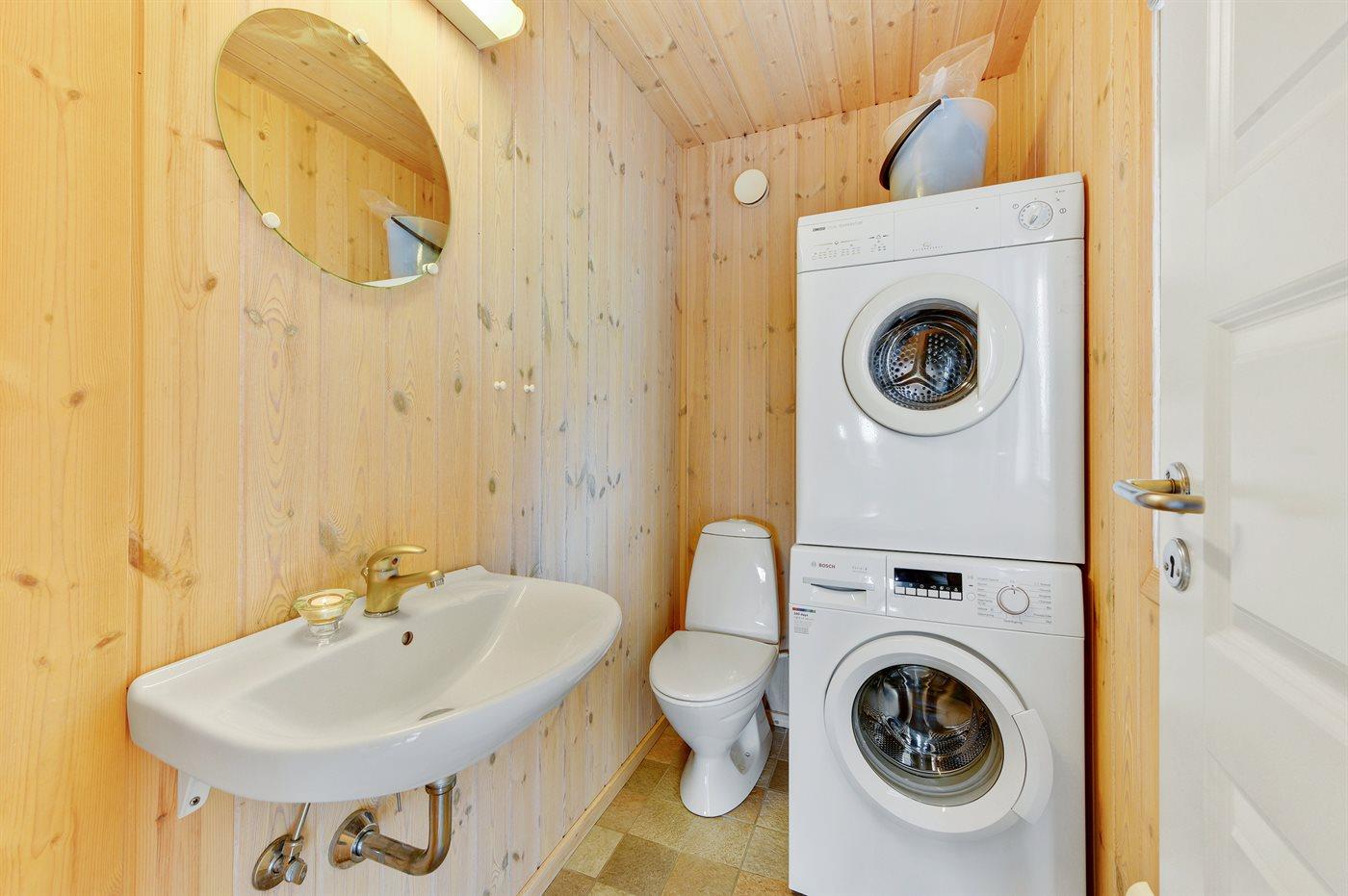Der er 1 badeværelse med bruseniche og 2 toiletter, heraf 1 gæstetoilet I saunaen er der mulighed for afslapning.