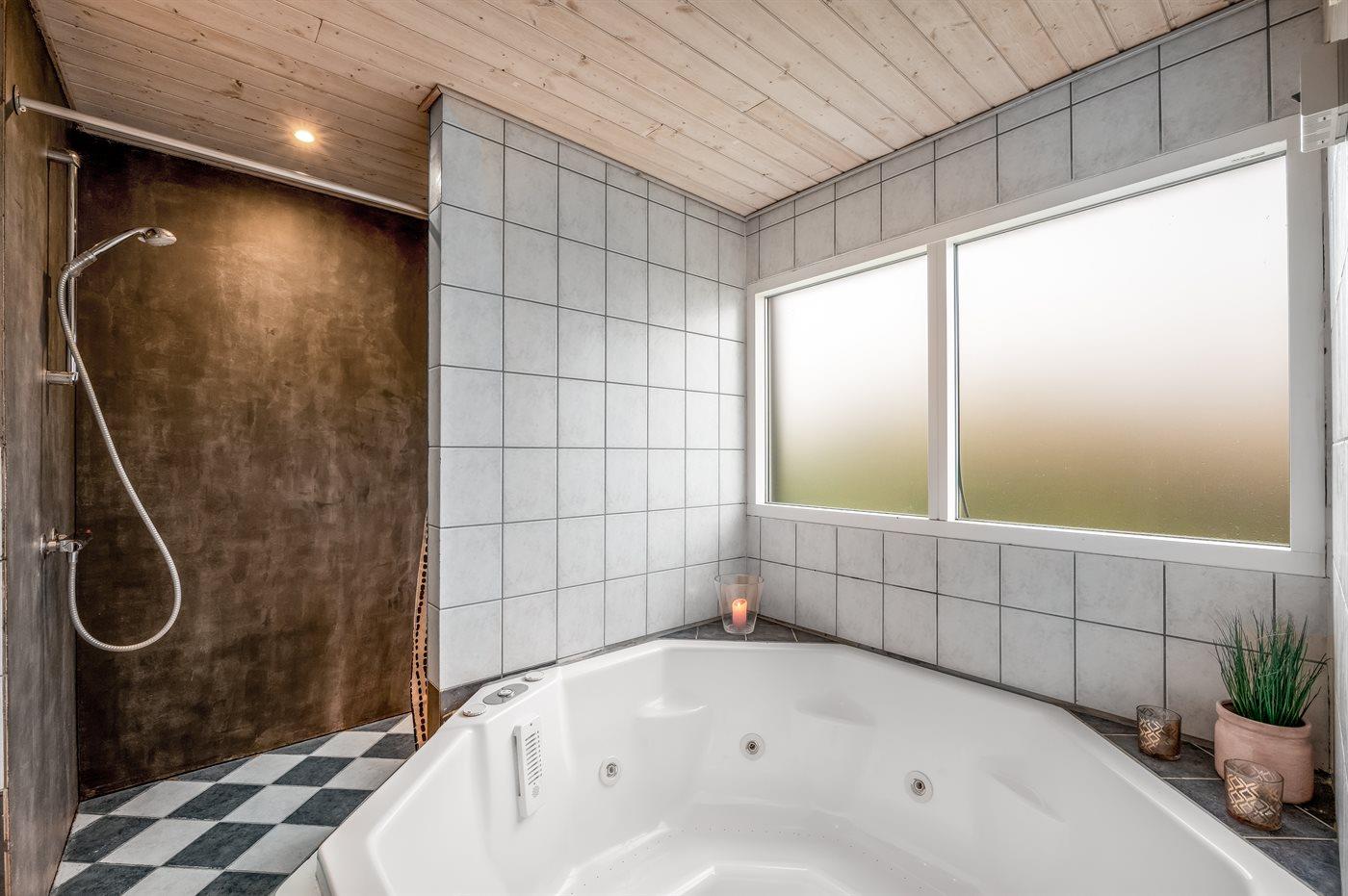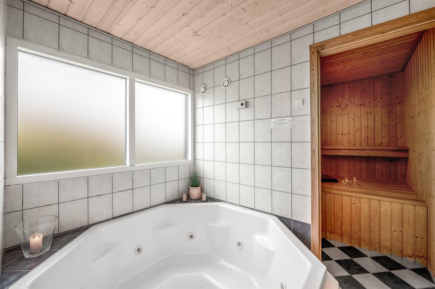 Der er 2 badeværelser med bruseniche og 2 toiletter. Der er gulvvarme på 2 badeværelser. I saunaen er der mulighed for afslapning.