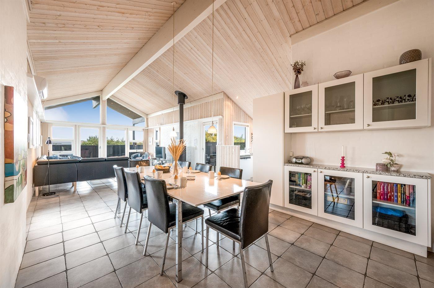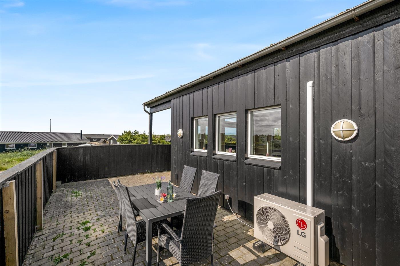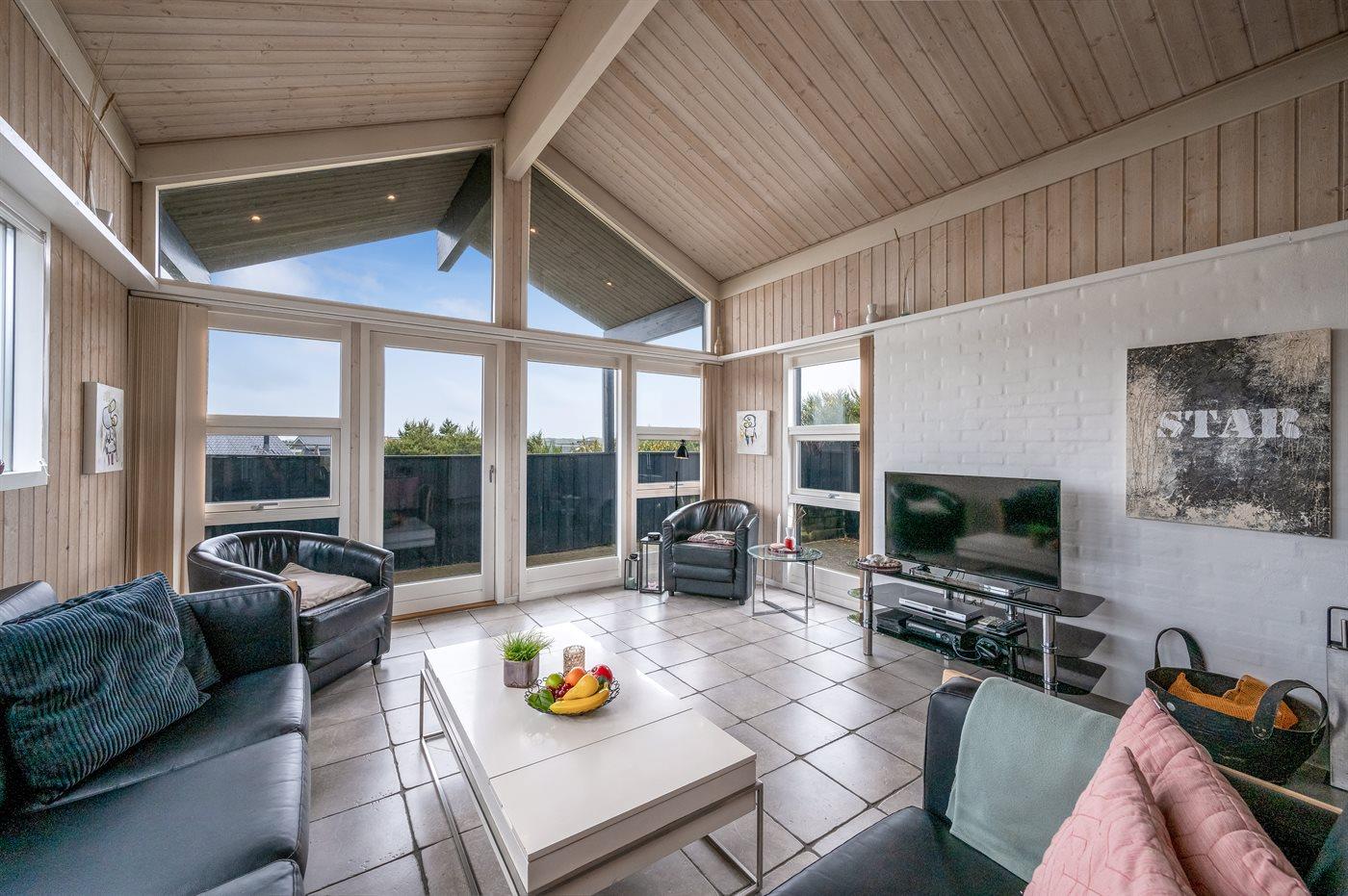 Dette dejlige og smagfuldt indrettede sommerhus ligger på en kuperet grund midt imellem Vesterhavet og Ringkøbing Fjord - i et naturskønt område med gode muligheder for cykel- og vandreture. På den store lukkede terrasse, hvor både små børn og dyr kan færdes sikkert, er der mulighed for at nyde solen fra morgen til aften.