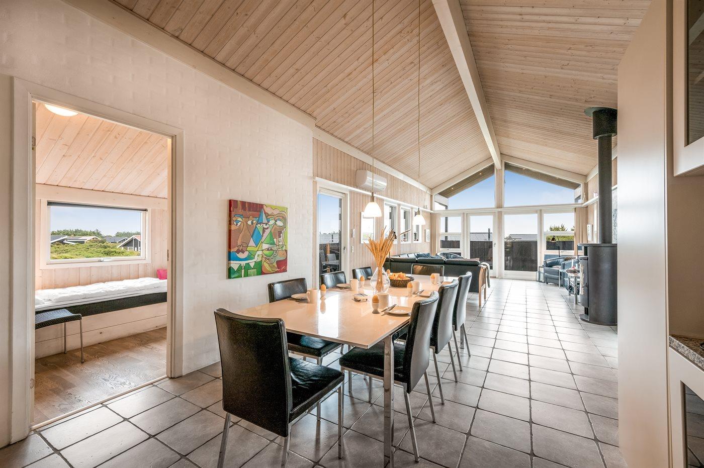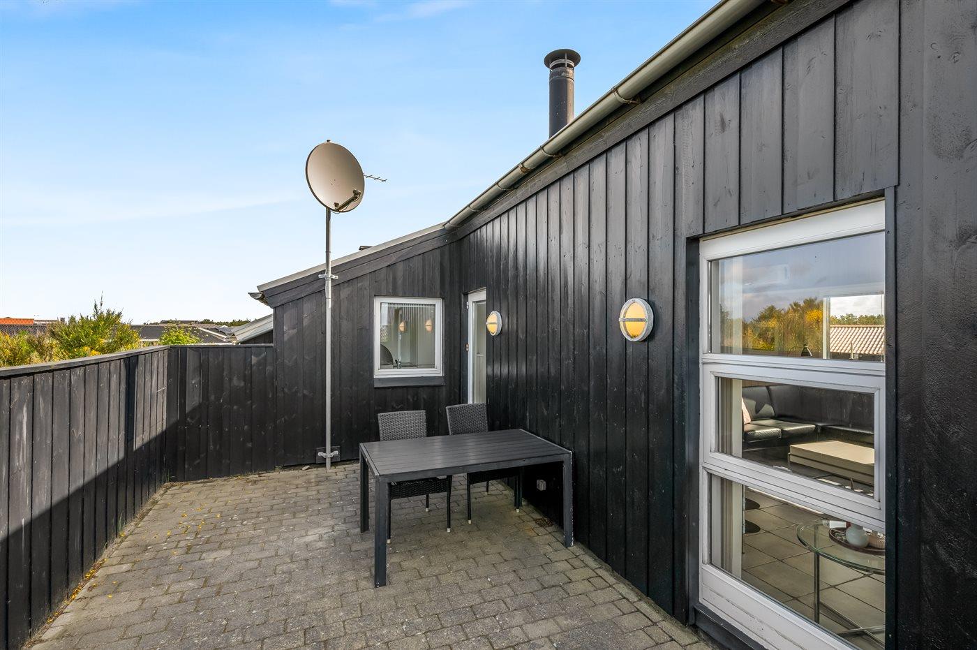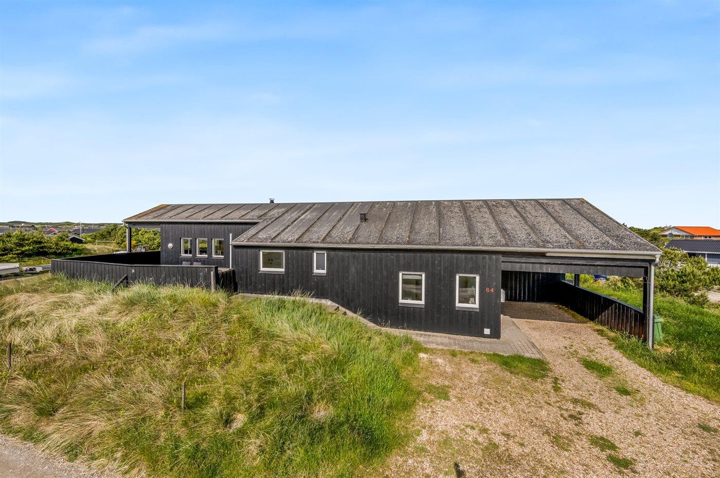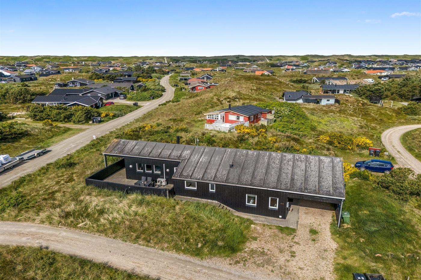 Dette dejlige og smagfuldt indrettede sommerhus ligger på en kuperet grund midt imellem Vesterhavet og Ringkøbing Fjord - i et naturskønt område med gode muligheder for cykel- og vandreture. På den store lukkede terrasse, hvor både små børn og dyr kan færdes sikkert, er der mulighed for at nyde solen fra morgen til aften.