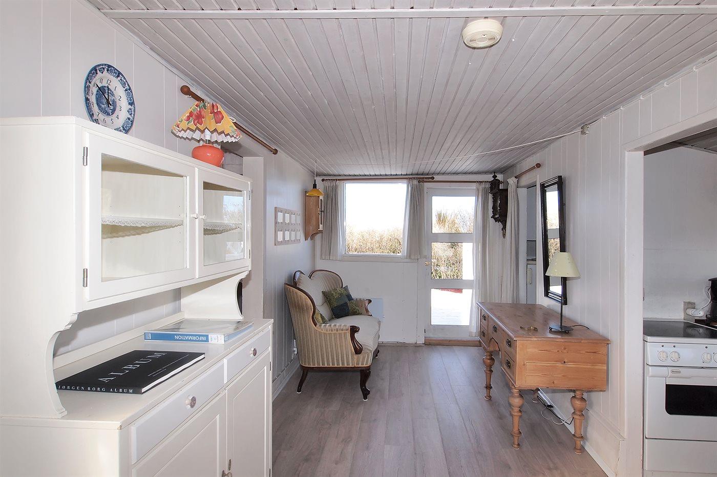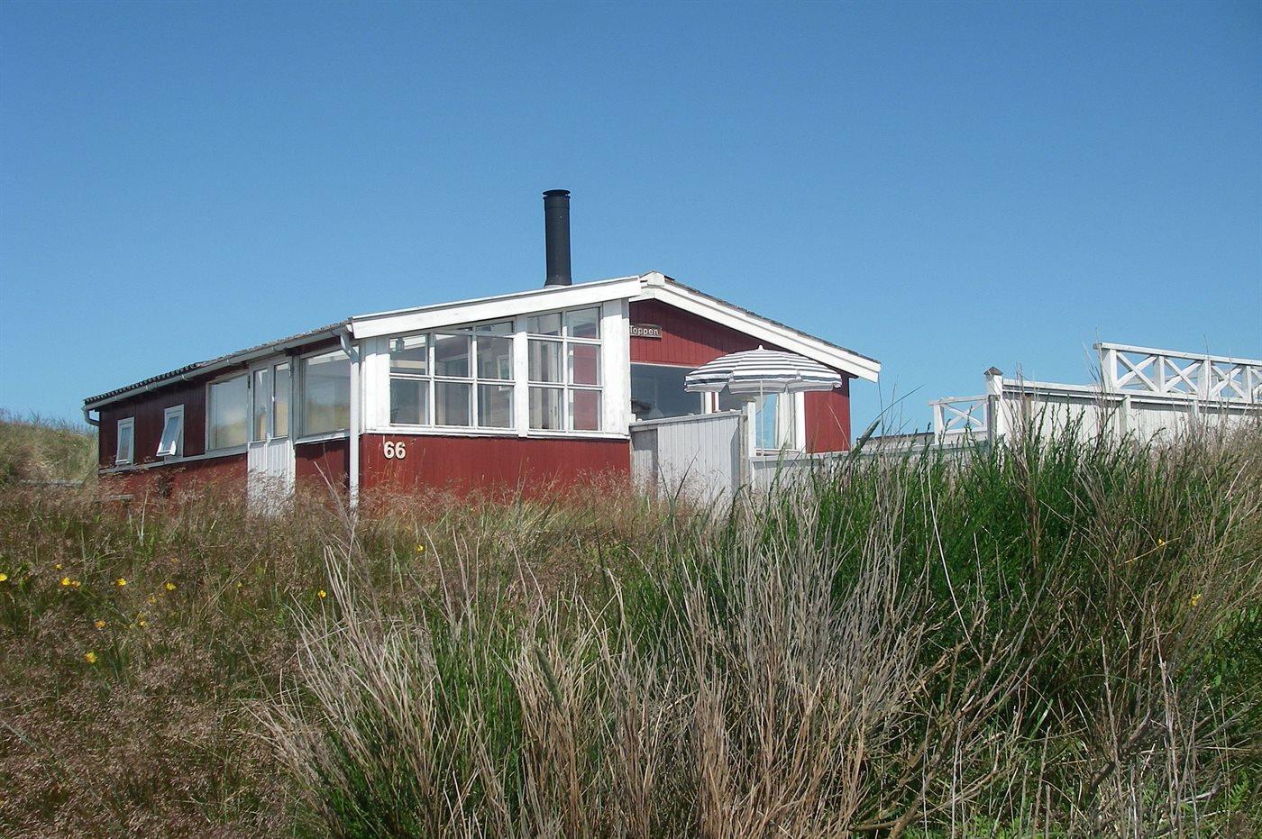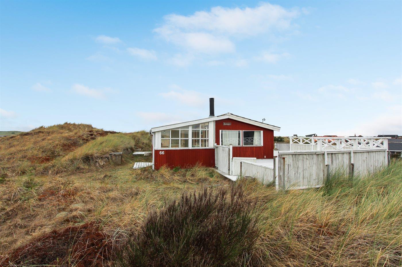 sommerhus i træ fra 1948, beliggende på dejlig, let kuperet klitgrund. Til huset hører 2 åbne terrasser samt udestue. Lyse trælofter og trævægge. Gulvtæpper overalt, dog vinyl i køkkenet. Lille badeværelse med bruseniche. Køkken med bl.a. fryser og mikrobølgeovn. Opholdsstue med brændeovn, DVD-afspiller, CD-afspiller og TV med parabol (digital). Desuden gratis internetforbindelse til rådighed (100/100 Mbit - computer skal medbringes). Husets sovepladser fordeler sig på 1 værelse med dobbeltseng og 1 værelse med køjeseng.