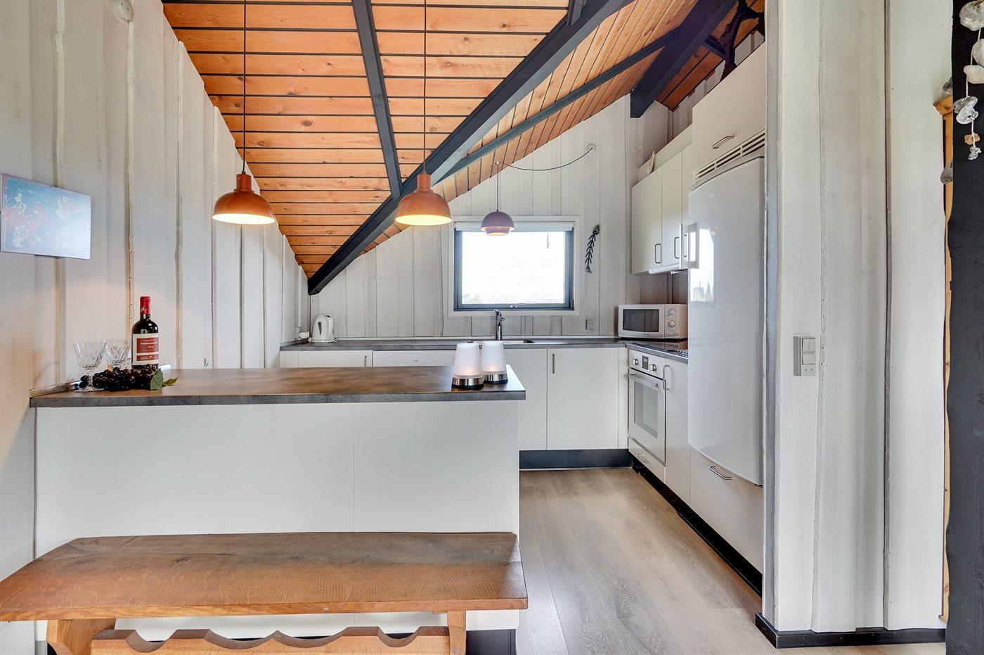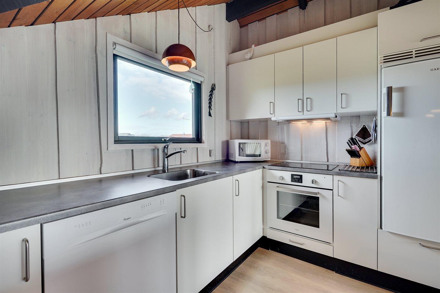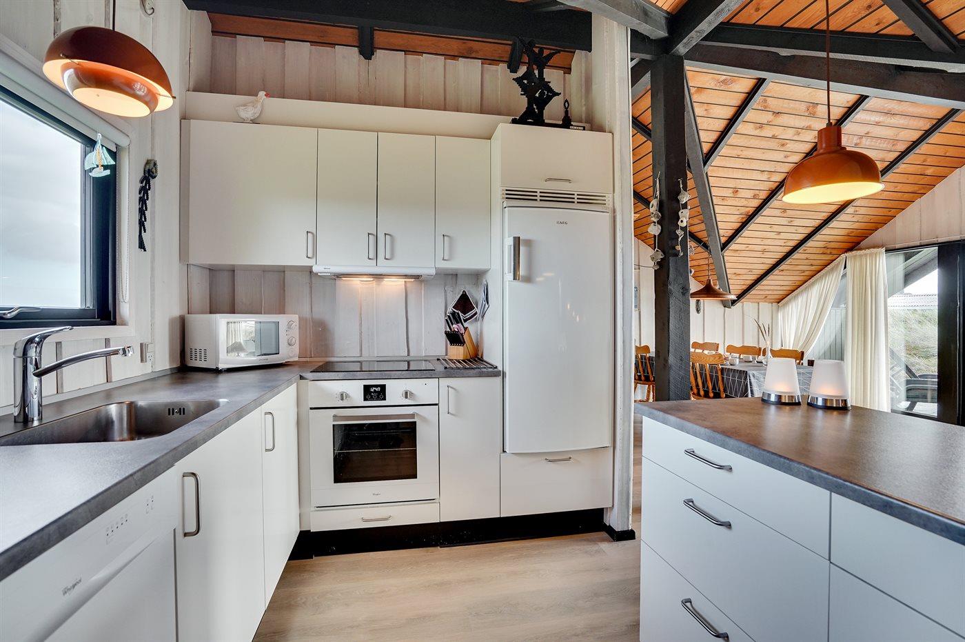 Køkkenet er udstyret med 1 køleskab. Der er 4 keramiske kogeplader, varmluftovn, mikrobølgeovn samt opvaskemaskine.