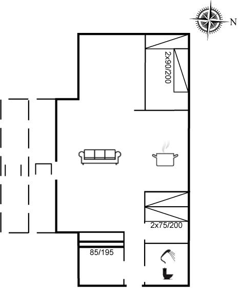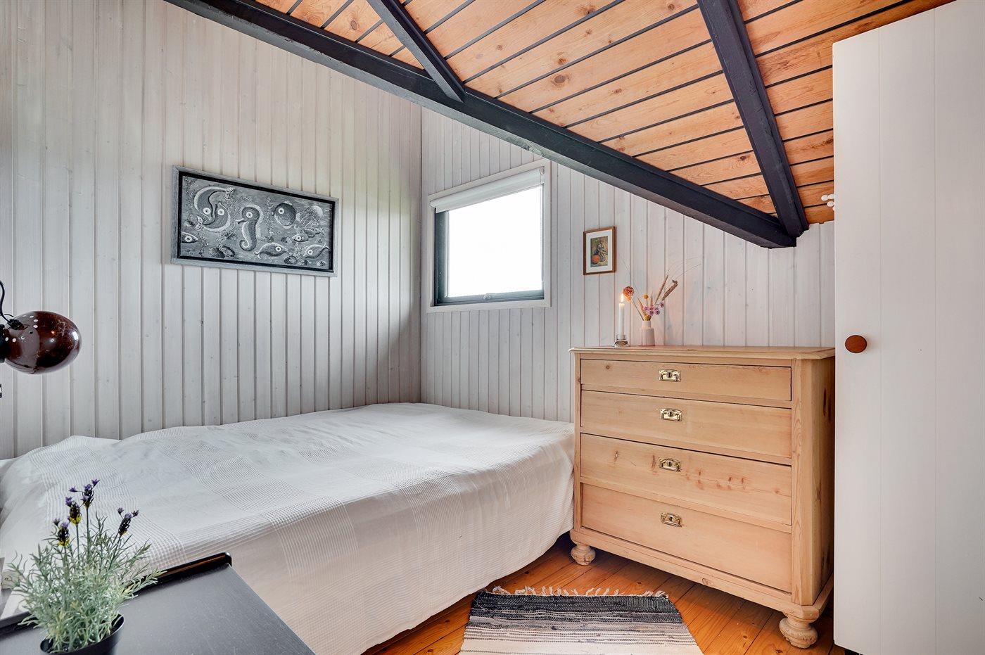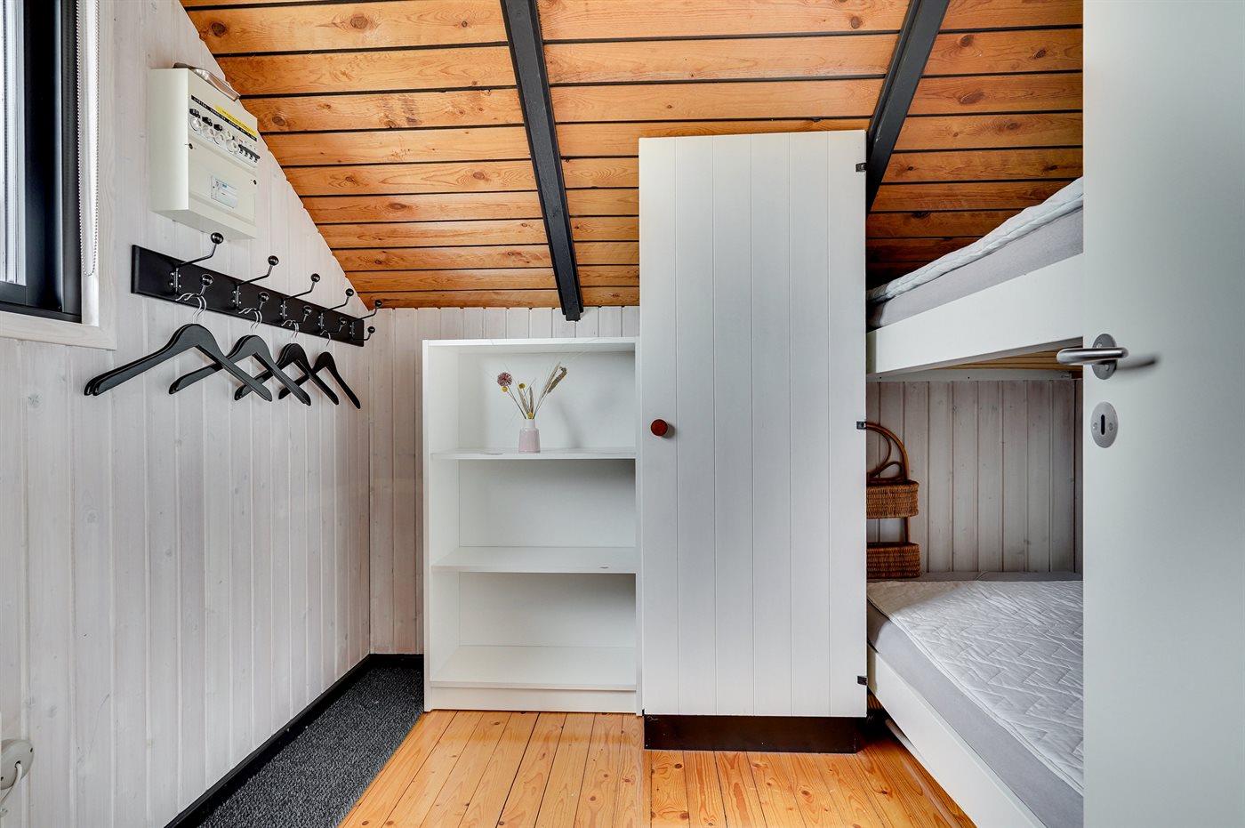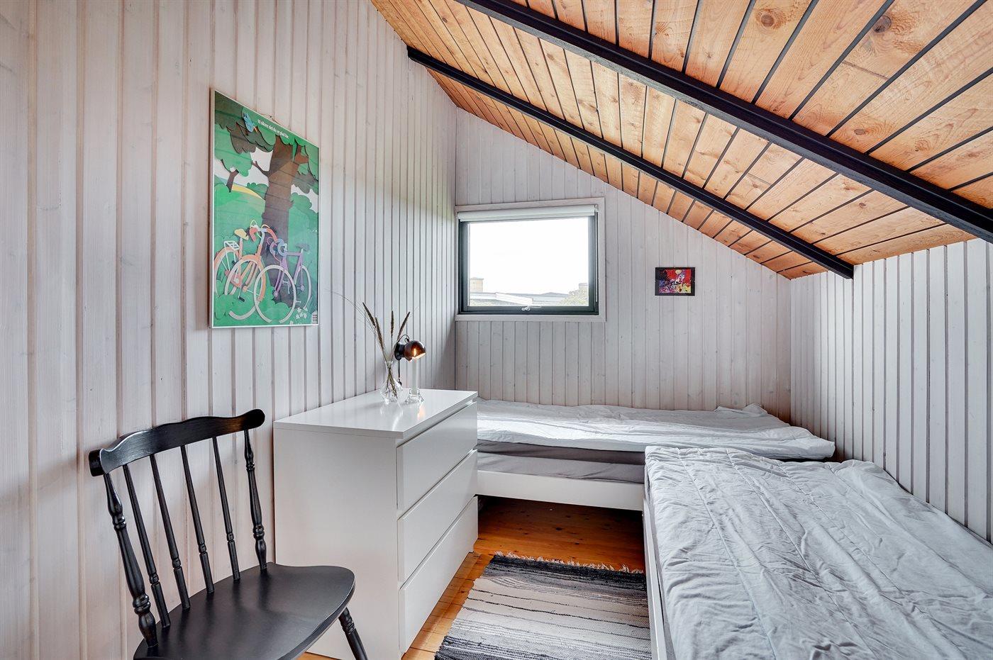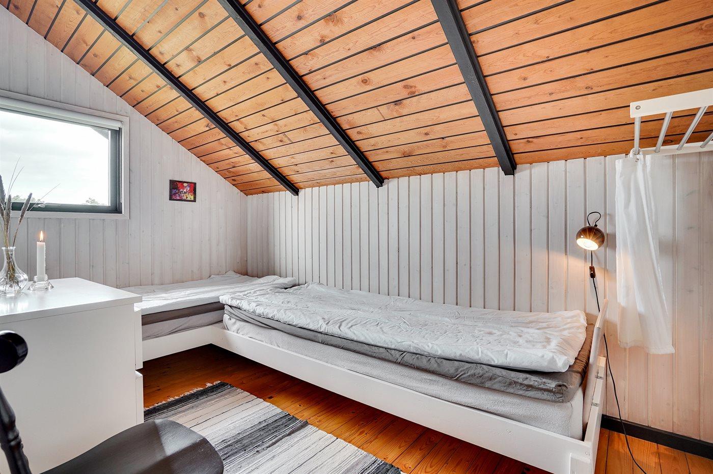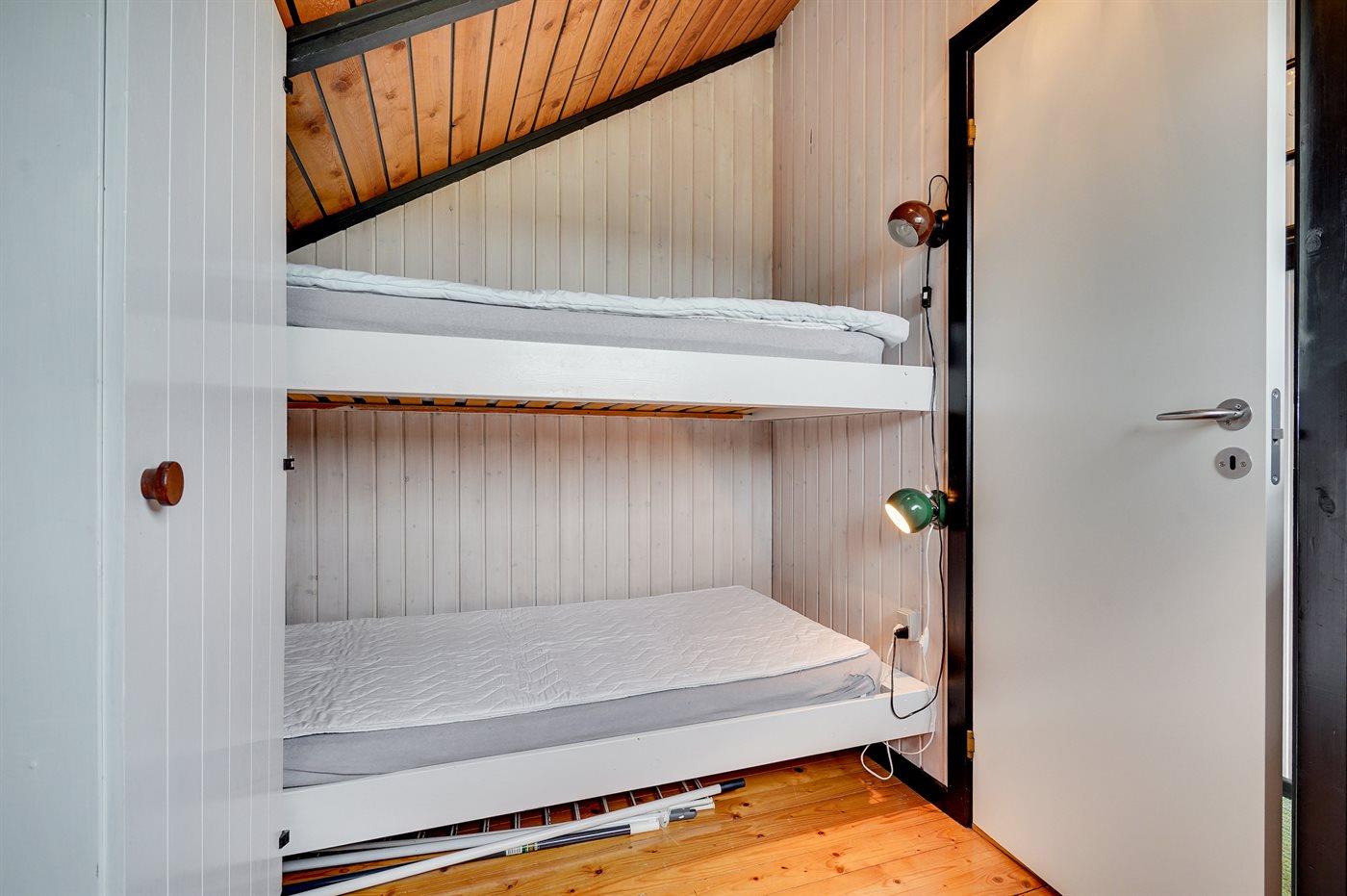 Der er i alt 3 soveværelser. Sovepladserne fordeler sig på: 2 sovepladser i dobbeltseng. 2 sovepladser i enkeltsenge.1 soveplads i køjeseng.