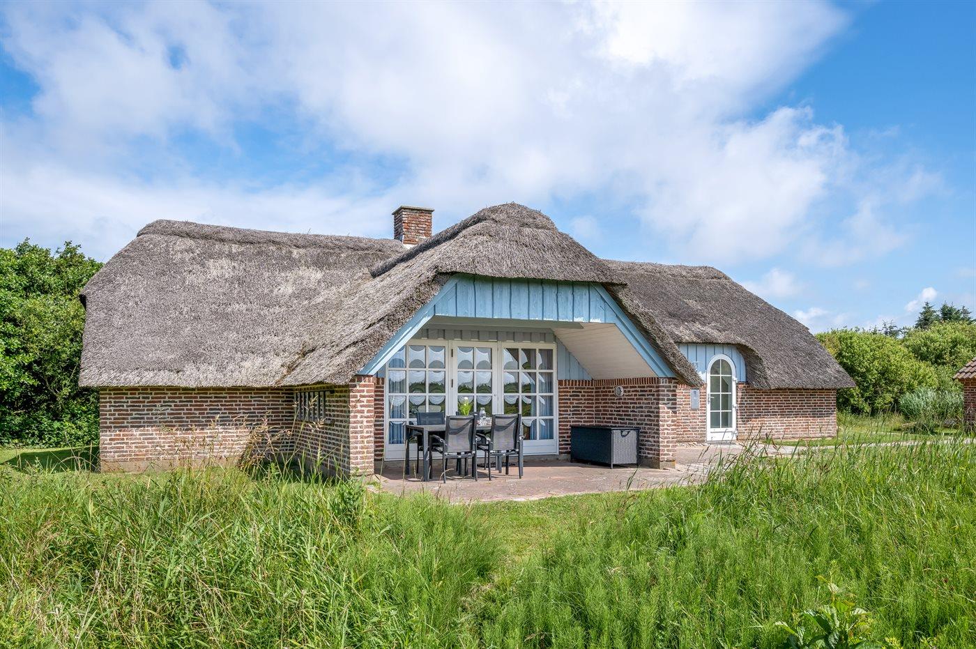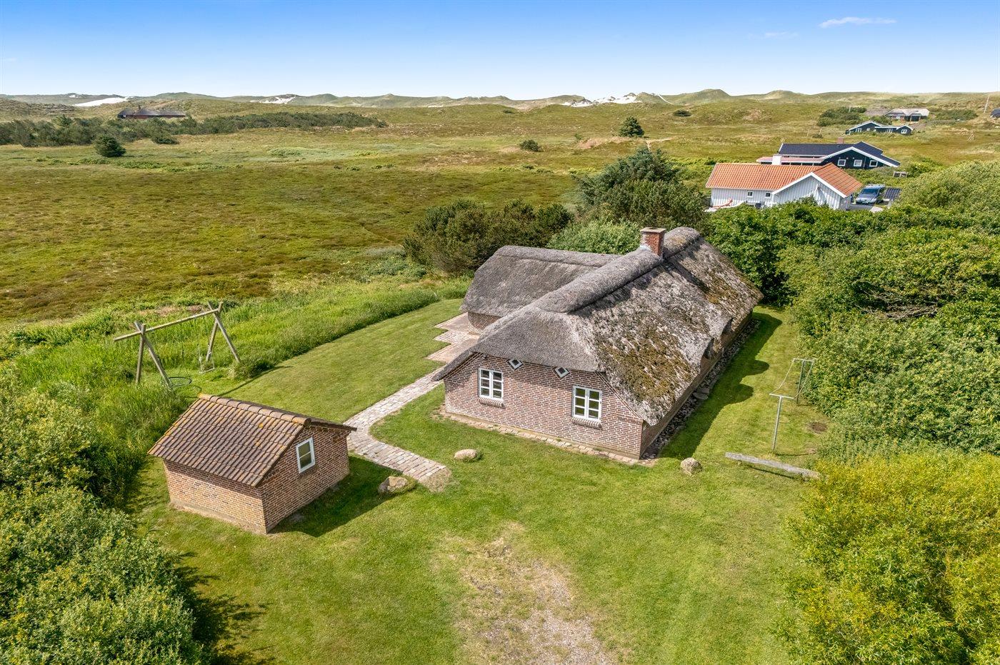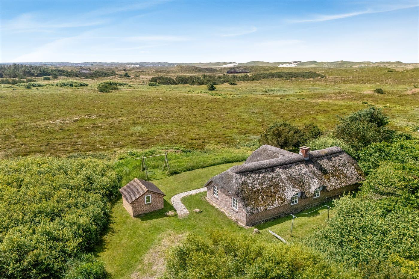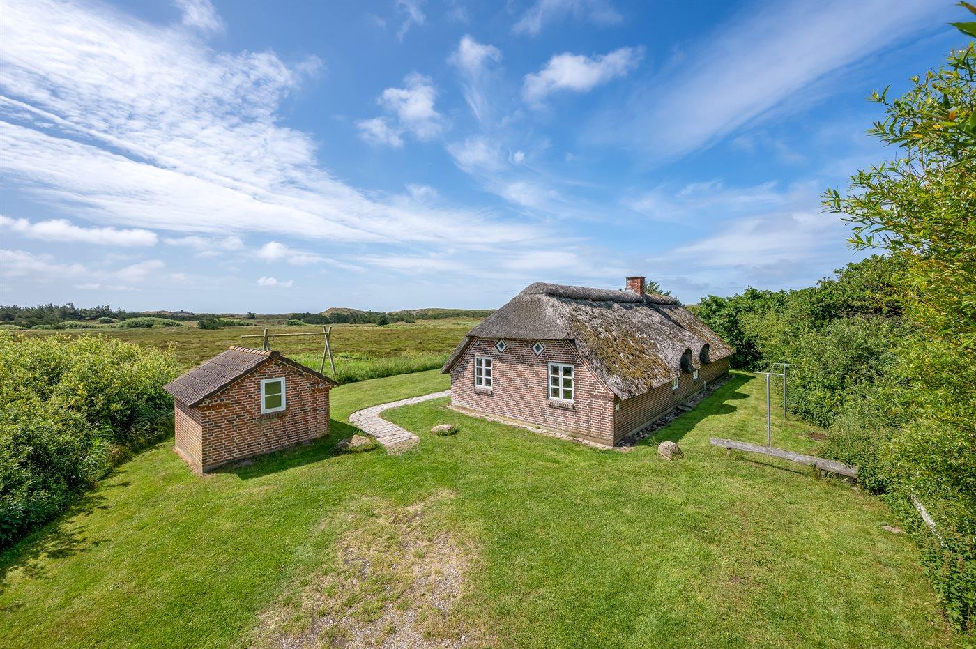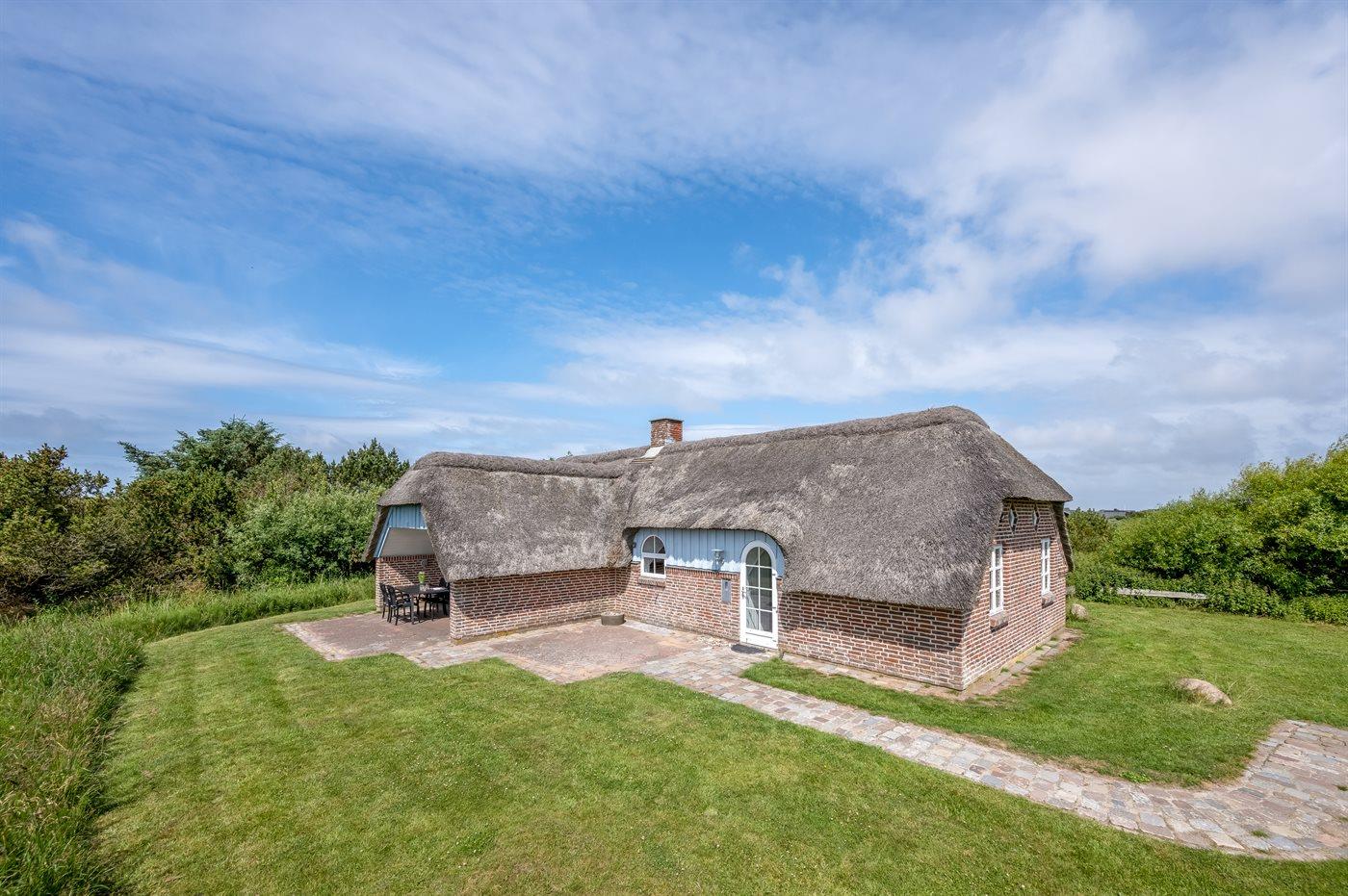 Hyggeligt sommerhus med stråtag og ugenert udsigt over klitlandskab i rolige omgivelser ved Hvide Sande.
