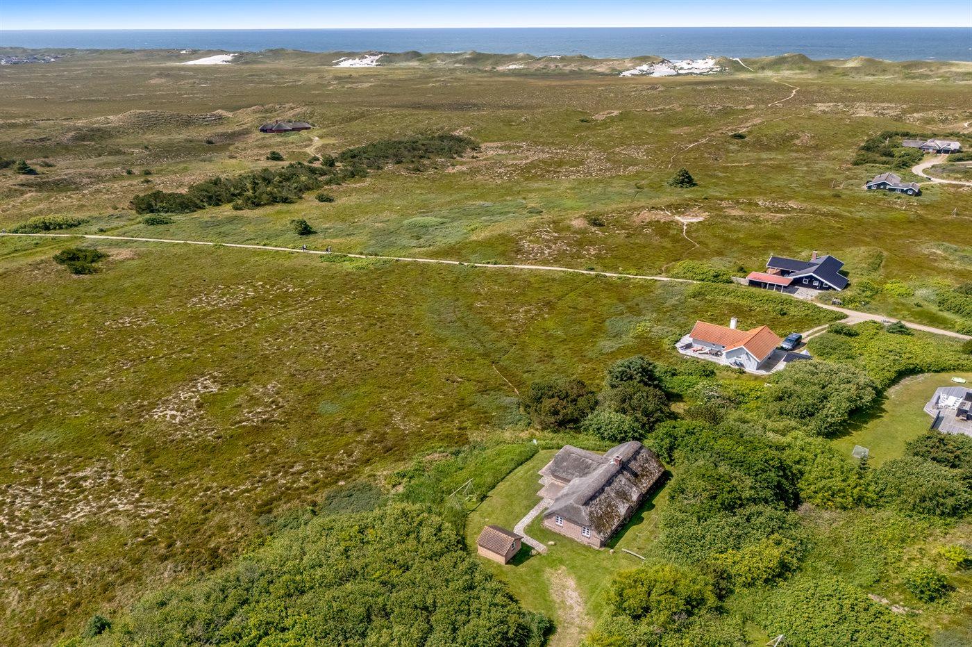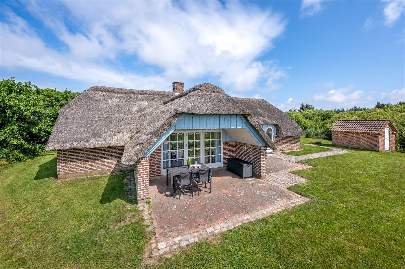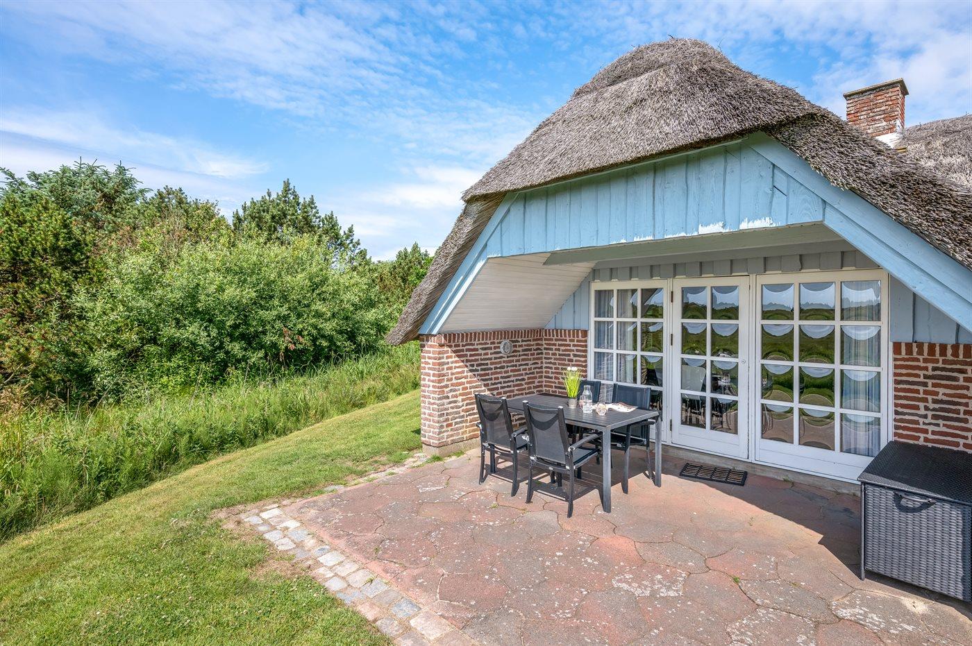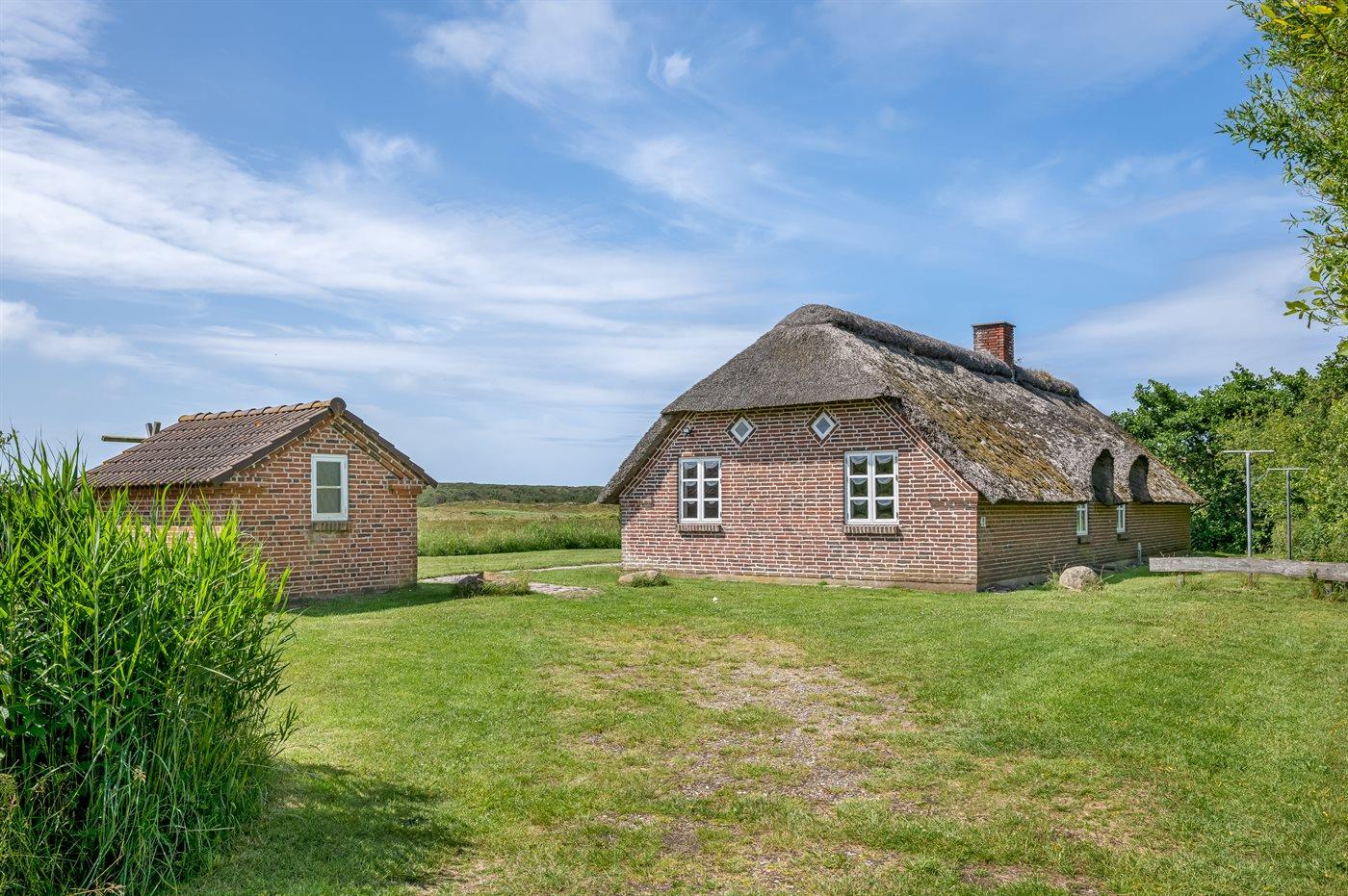 Hyggeligt sommerhus med stråtag og ugenert udsigt over klitlandskab i rolige omgivelser ved Hvide Sande.