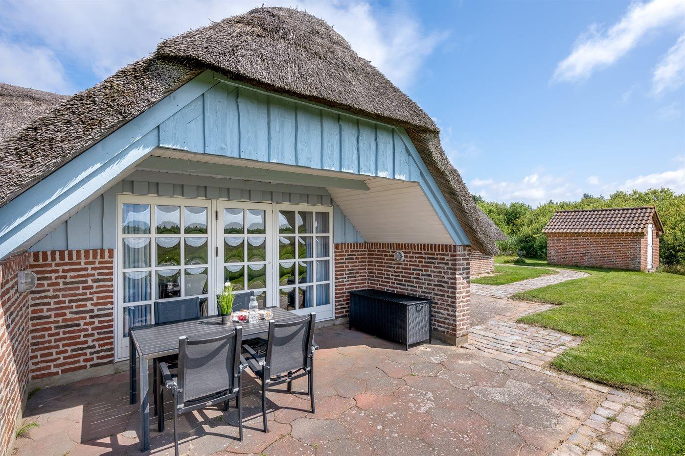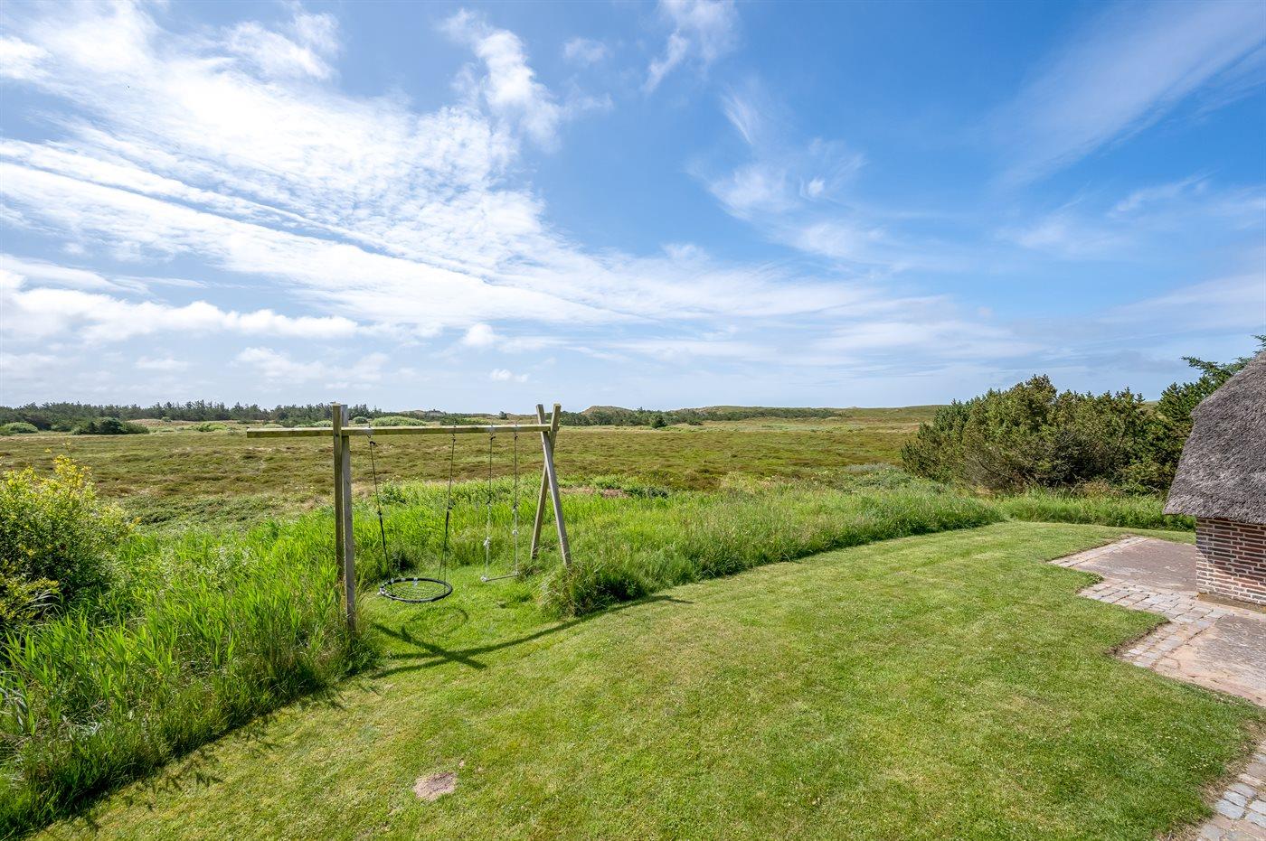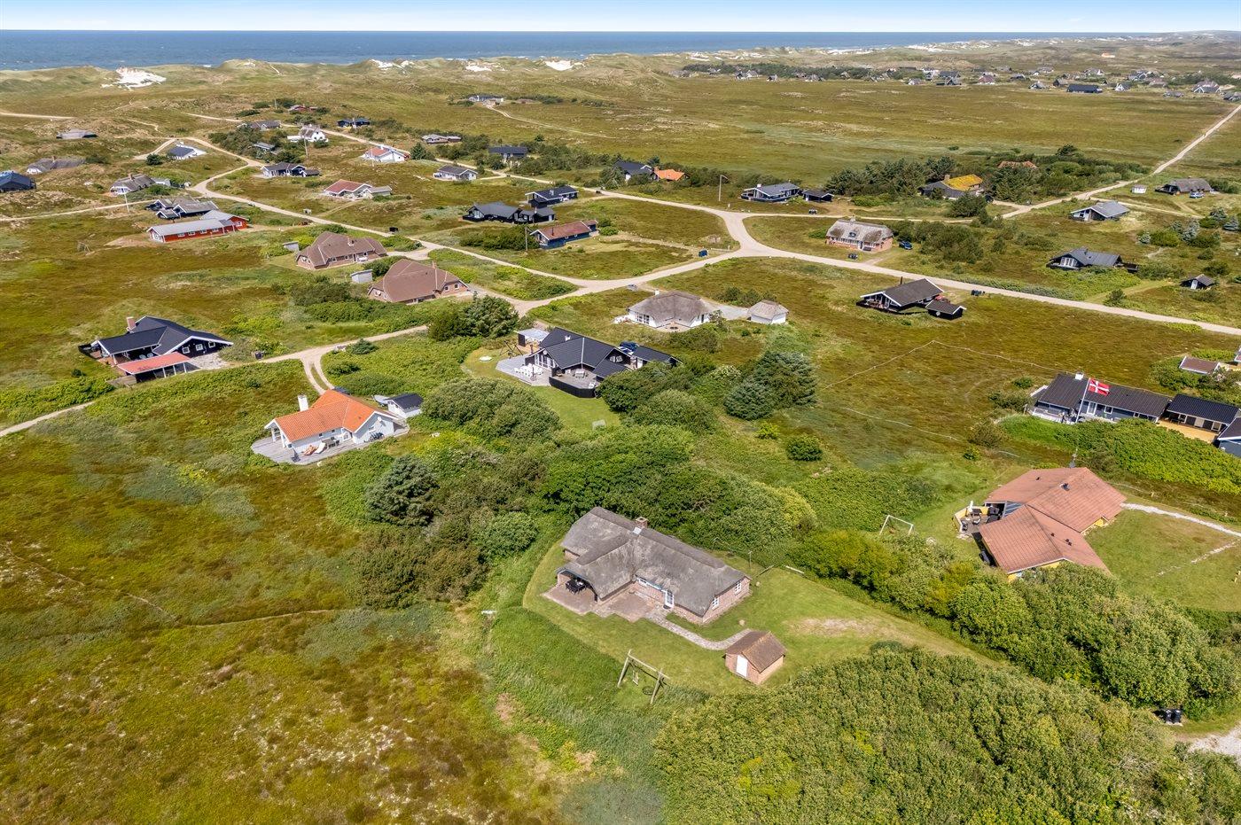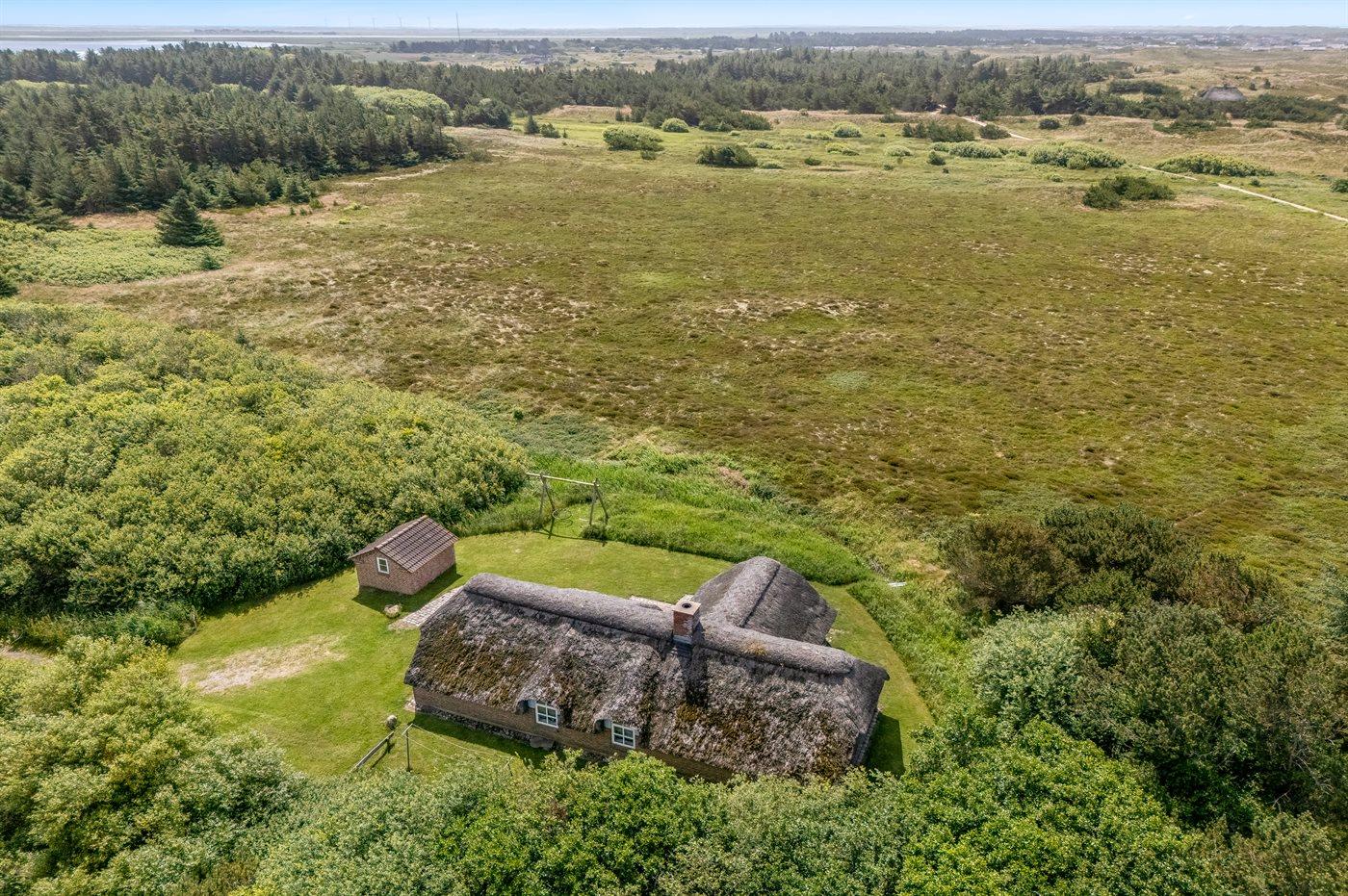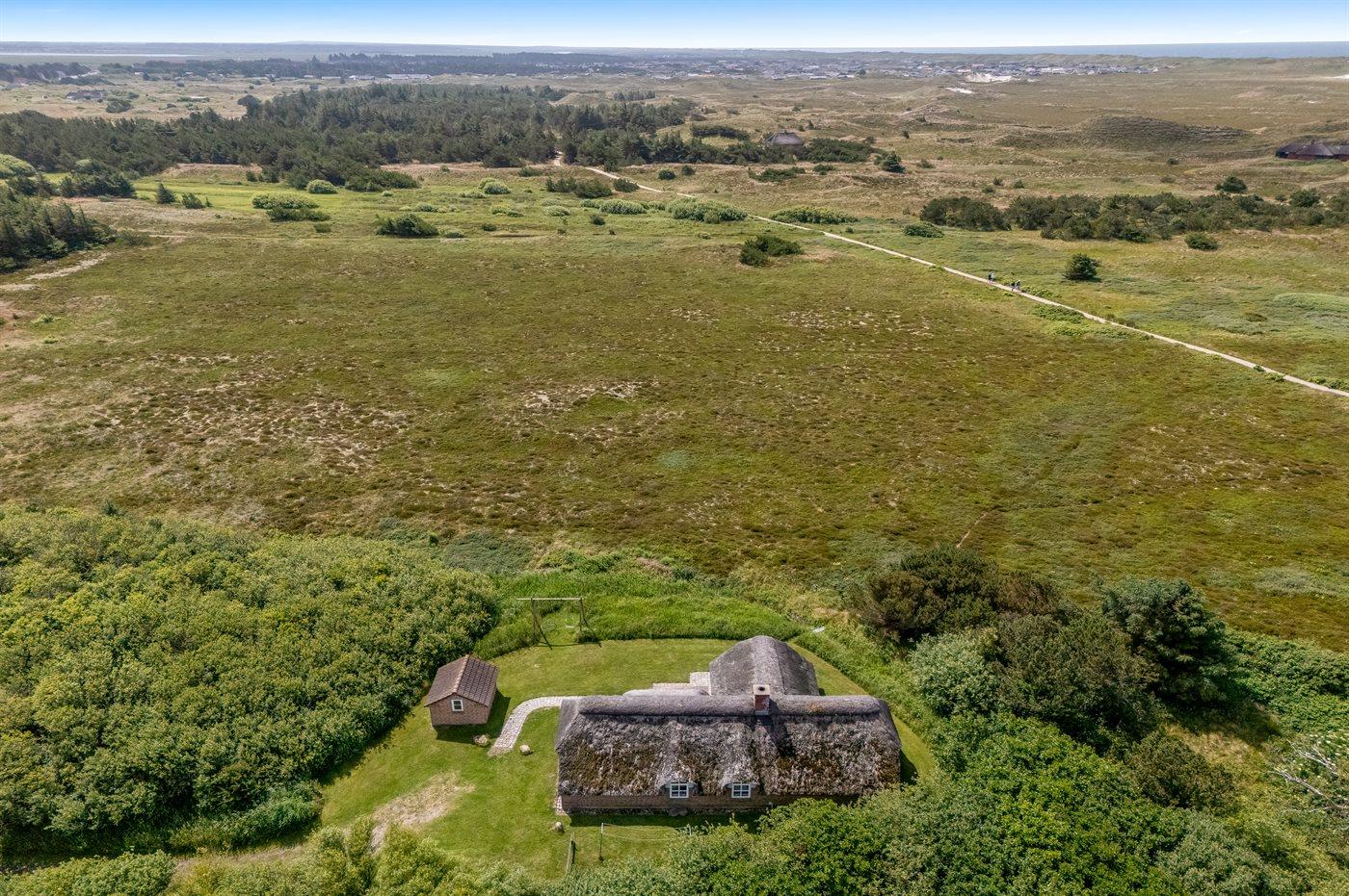 Hyggeligt sommerhus med stråtag og ugenert udsigt over klitlandskab i rolige omgivelser ved Hvide Sande.