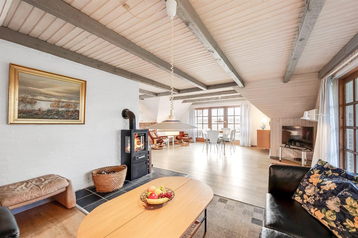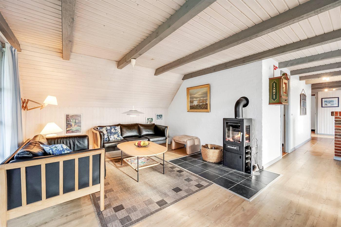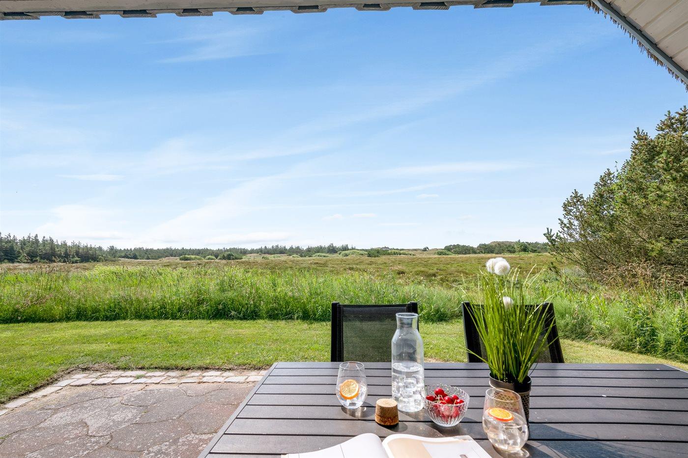 Hyggeligt og rummeligt sommerhus i sten med stråtag beliggende på dejlig naturgrund bevokset med lyng og lille vandløb. Huset er beliggende i fredelige omgivelser og har såvel åbent som overdækket terrasseareal med havemøbler. Fra den delvist overdækkede terrasse er der en dejlig og ugenert udsigt over klitlandskabet. Flisegulve i køkken og badeværelse, gulvtæpper i stuen og på værelserne. Badeværelse med bruseniche, vaskemaskine og gulvvarme. Gæstetoilet. Velfungerende køkken med bl.a. mikrobølgeovn og opvaskemaskine. Der er indlagt gulvvarme i køkkenet. Hyggelig opholdsstue med brændeovn og TV med parabol (digital). Fra opholdsstuen er der desuden adgang til den delvist overdækkede terrasse. Der er gynge til børnene. 2 soveværelser med dobbeltseng samt 1 værelse med 2 enkeltsenge. Af yderligere udstyr kan gratis, trådløs internetforbindelse (computer skal medbringes) og varmepumpe nævnes. Et godt og hyggeligt sommerhus i rolige omgivelser.