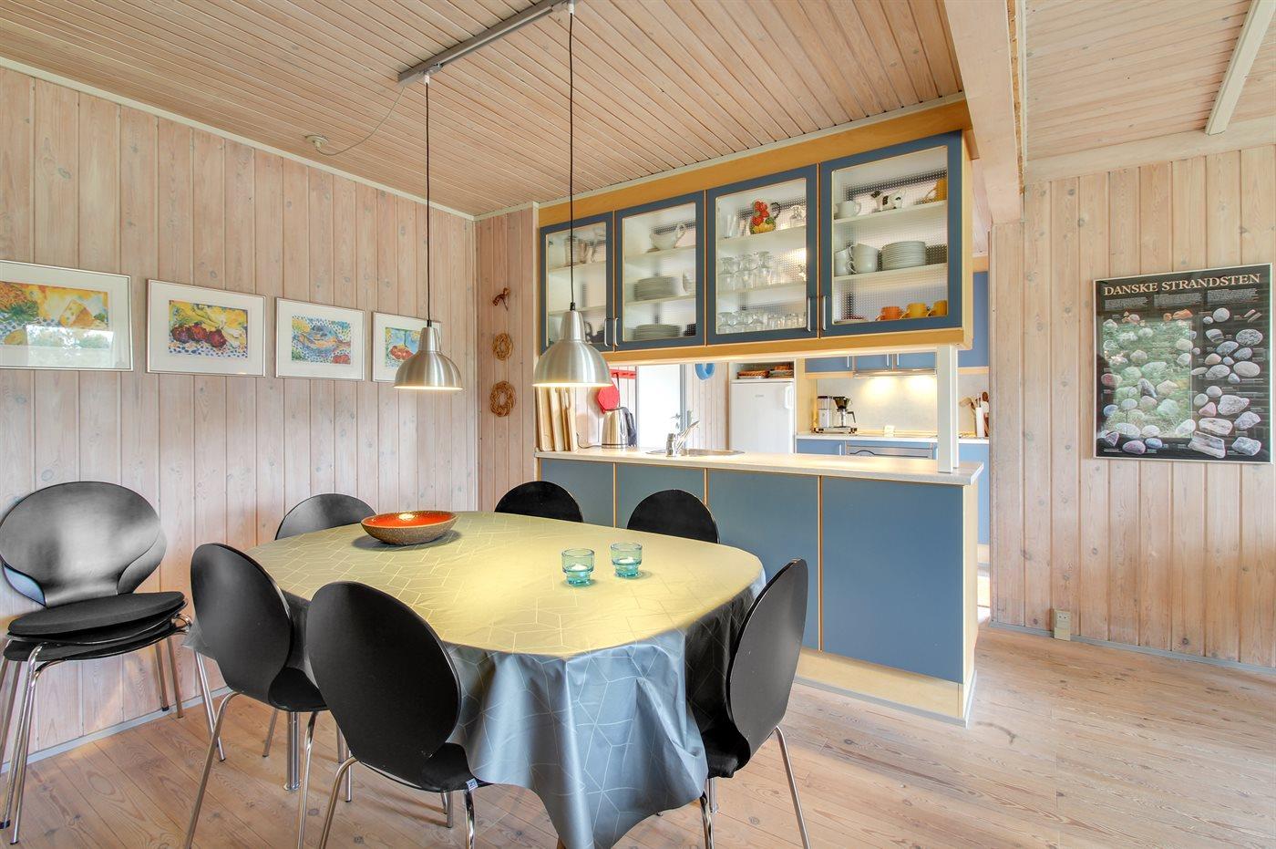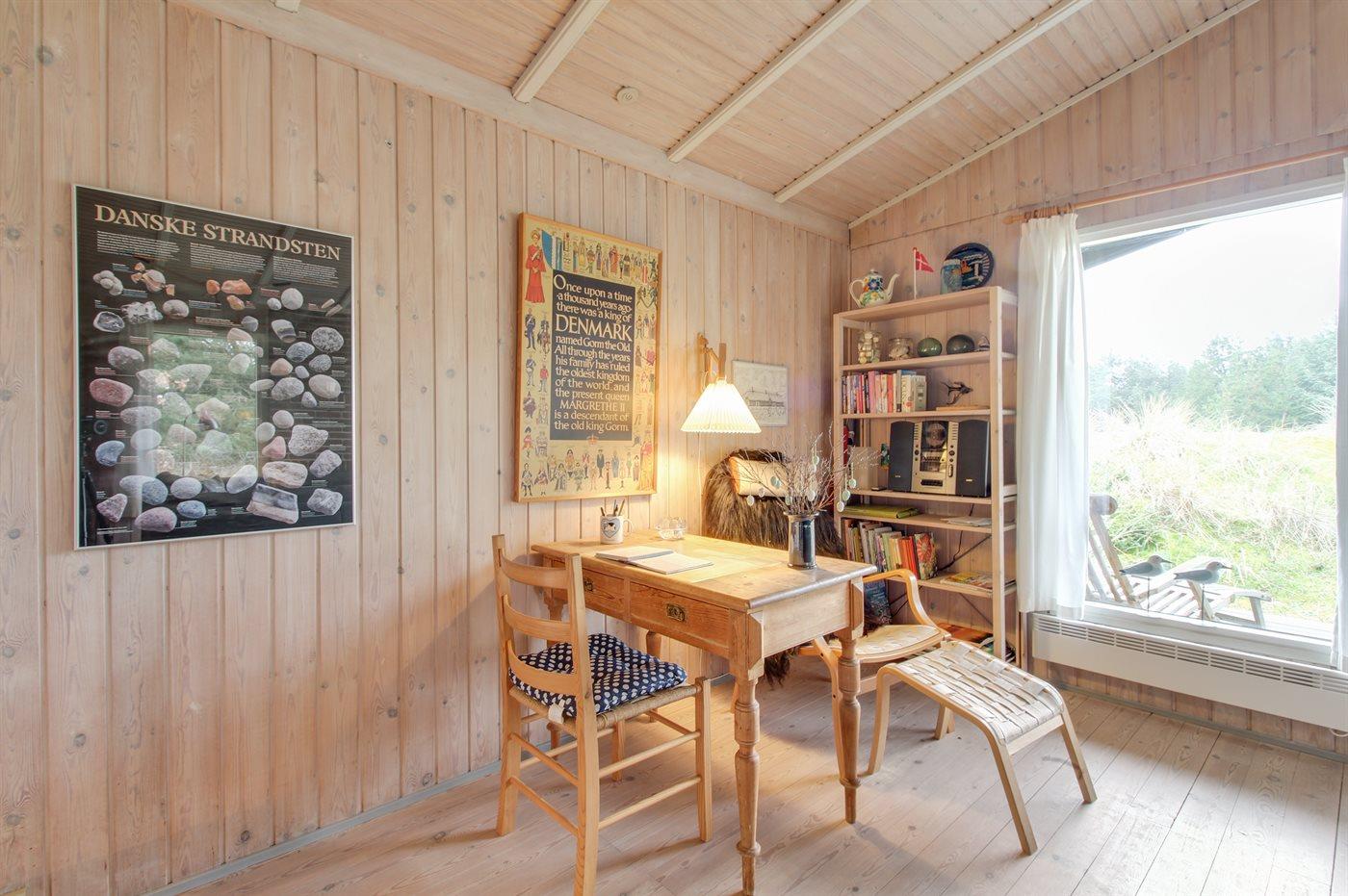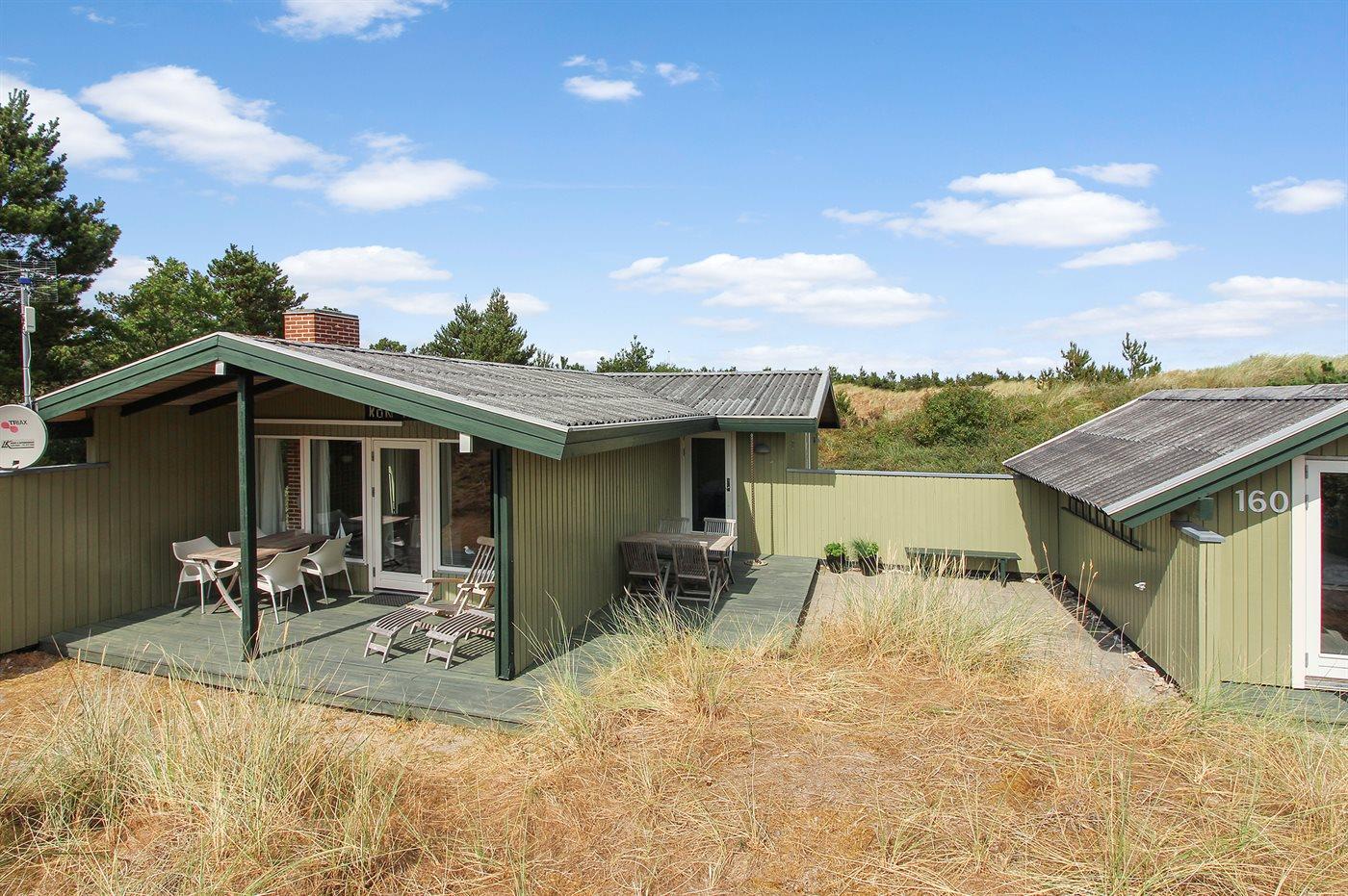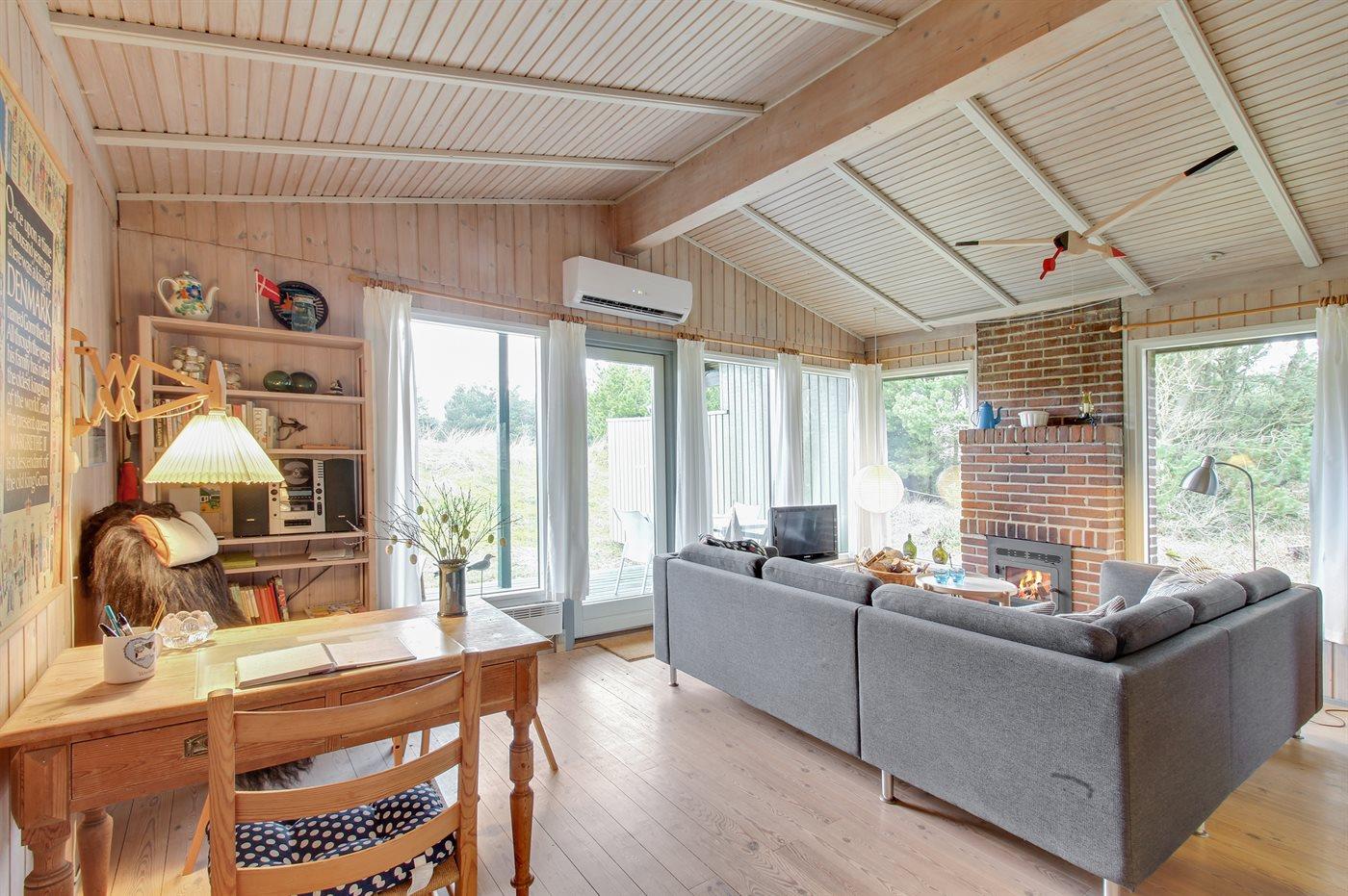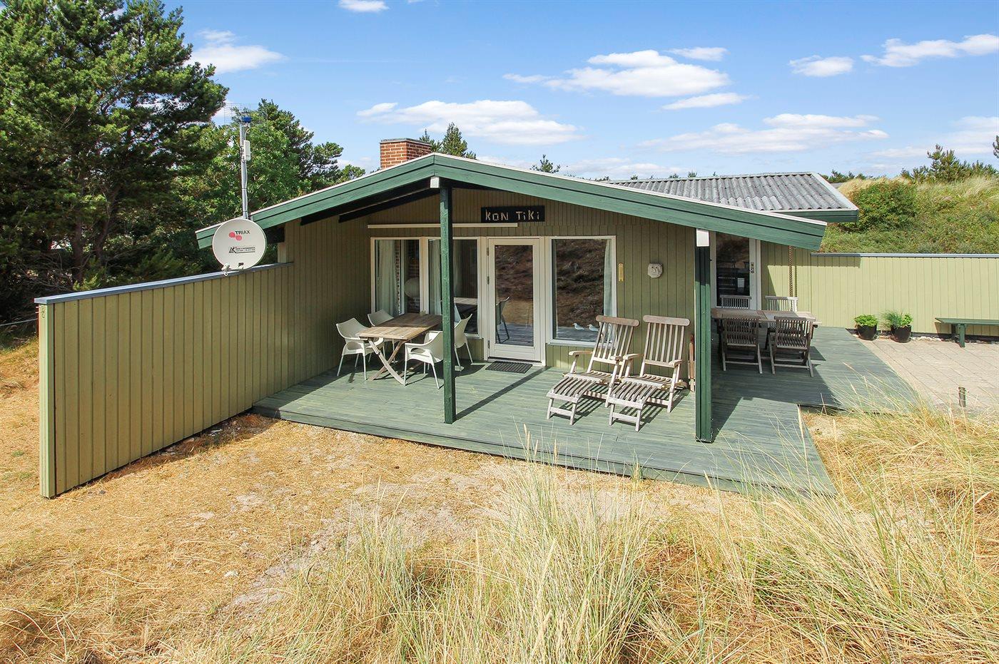 Dette dejlige og velholdte sommerhus ligger på en kuperet natur-/klitgrund med beplantning i rolige omgivelser. Til huset hører et dejligt såvel åbent som overdækket terrasseareal med diverse havemøbler. Indvendig er der gulvtæpper, dog trægulv i køkken og stue. Trævægge og -lofter. Badeværelse med bruseniche. Det pæne køkken indeholder bl.a. mikrobølgeovn, komfur med keramiske kogeplader og opvaskemaskine. Opholdsstuen er udstyret med CD-afspiller, TV med parabol (digital), DVD-afspiller samt brændeovn. Husets 6 soveplader er fordelt på 1 værelse med dobbeltseng, 1 værelse med køjeseng samt stort anneks med 2 sovepladser. Af yderligere udstyr kan gratis, trådløs internetforbindelse samt høj barnestol nævnes og der er installeret energibesparende varmepumpe (luft til luft). Et dejligt sommerhus.