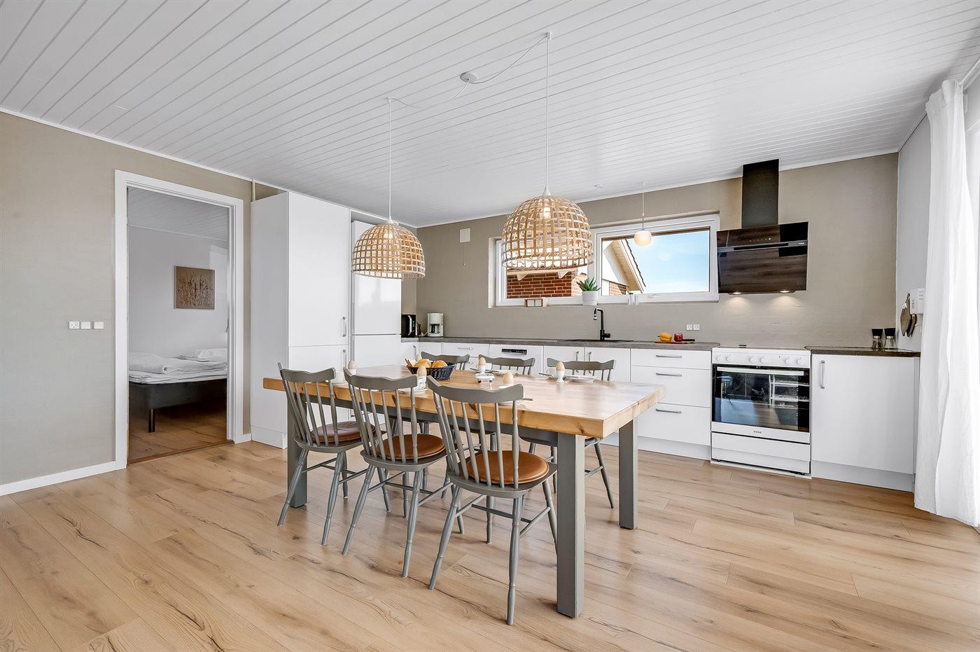 Køkkenet er udstyret med 1 køleskab. Der er 4 elkogeplader, bageovn, mikrobølgeovn samt opvaskemaskine.