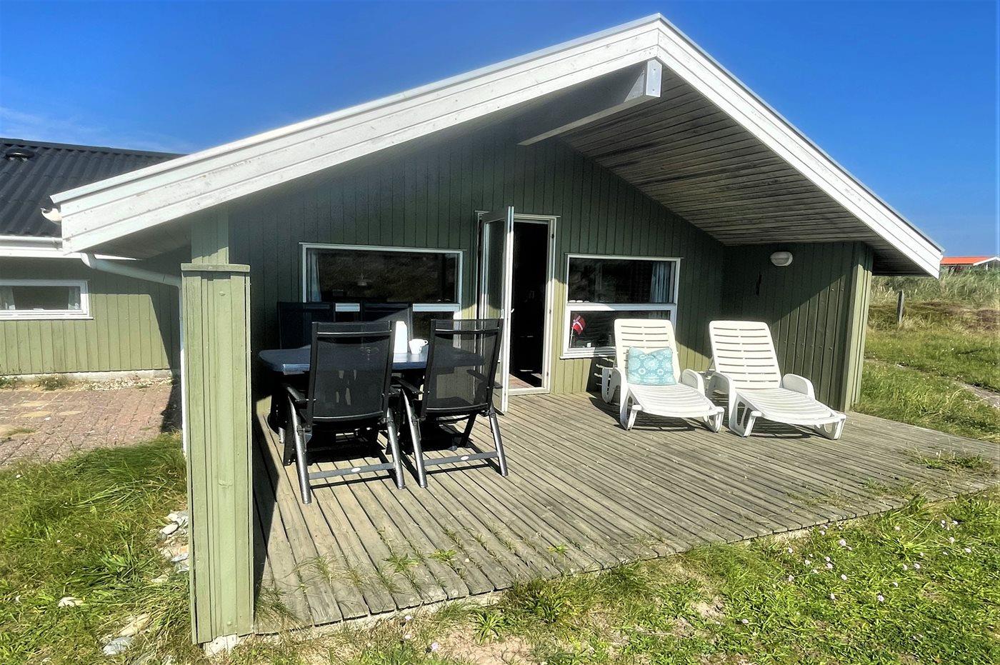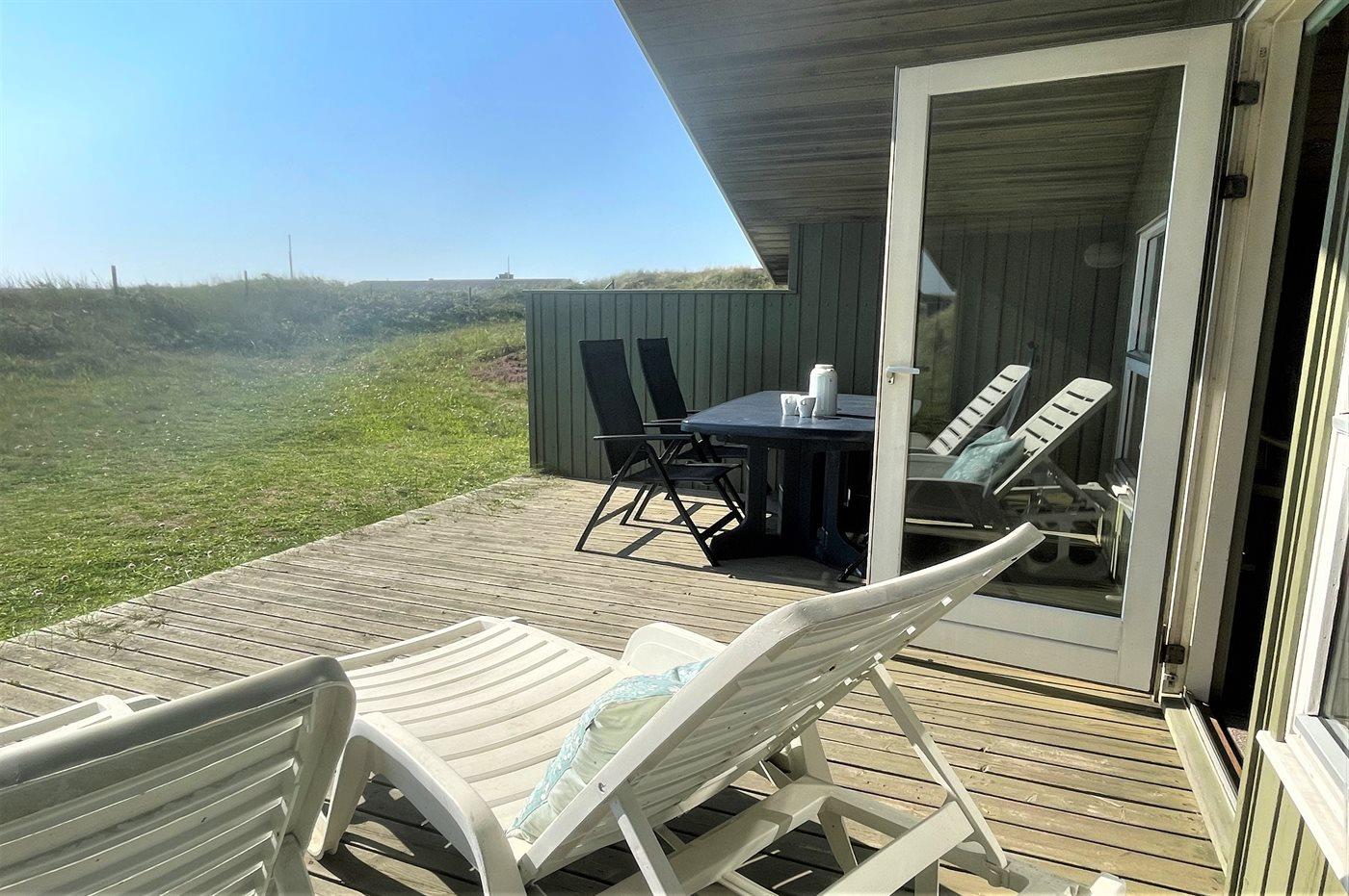 På kuperet klitgrund ligger dette hyggelige sommerhus i træ fra 1992. Huset har både åbent og overdækket terrasseareal med havemøbler.