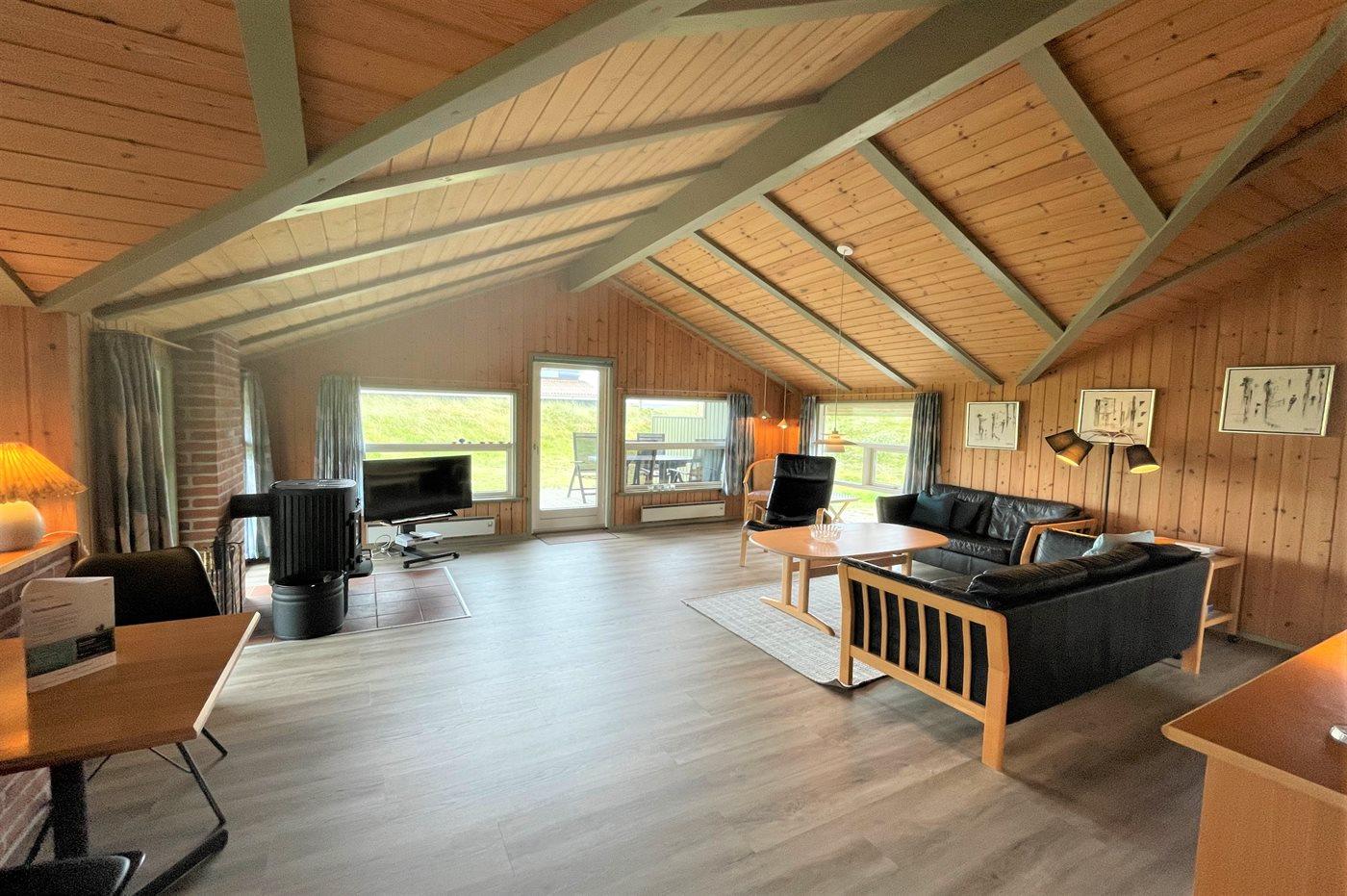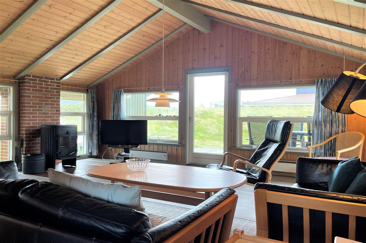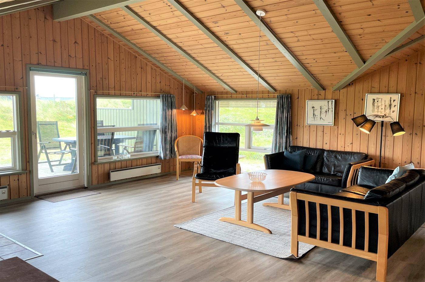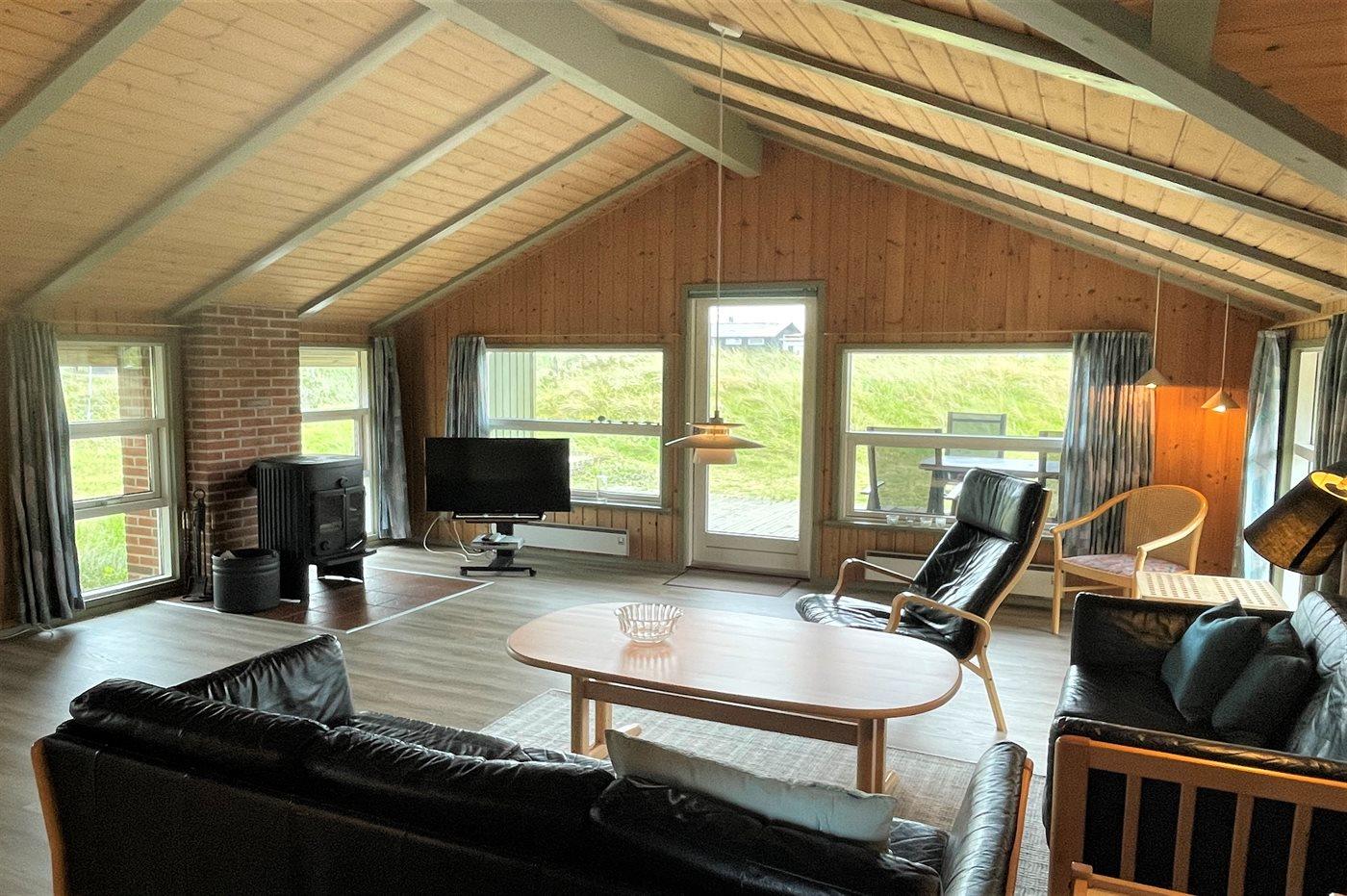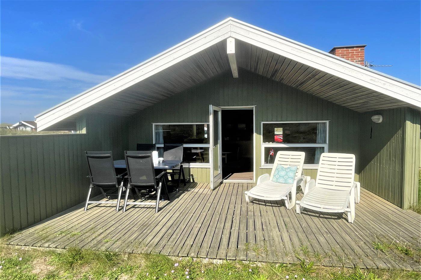 Hyggeligt sommerhus i Hvide Sande med sauna, brændeovn og dejlige terrasser tæt ved havet.