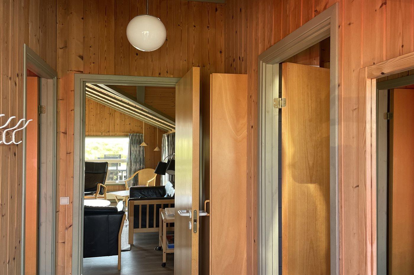 I feriehuset er der trævægge og -lofter. Laminat-/vinylgulve, dog klinkegulv i køkken og gang. Badeværelse er med bruseniche, gulvvarme og vaskemaskine samt adgang til husets sauna. Funktionelt køkken med fryser og mikrobølgeovn. Der er en dejlig stor opholdsstue med brændeovn og TV med parabol (digital). Desuden gratis, trådløs internetforbindelse til rådighed (computer skal medbringes). Husets 6 sovepladser er fordelt på 3 værelser; 2 værelser med dobbeltseng og 1 værelse med køjeseng. Det er tilladt at medbringe 2 husdyr.
