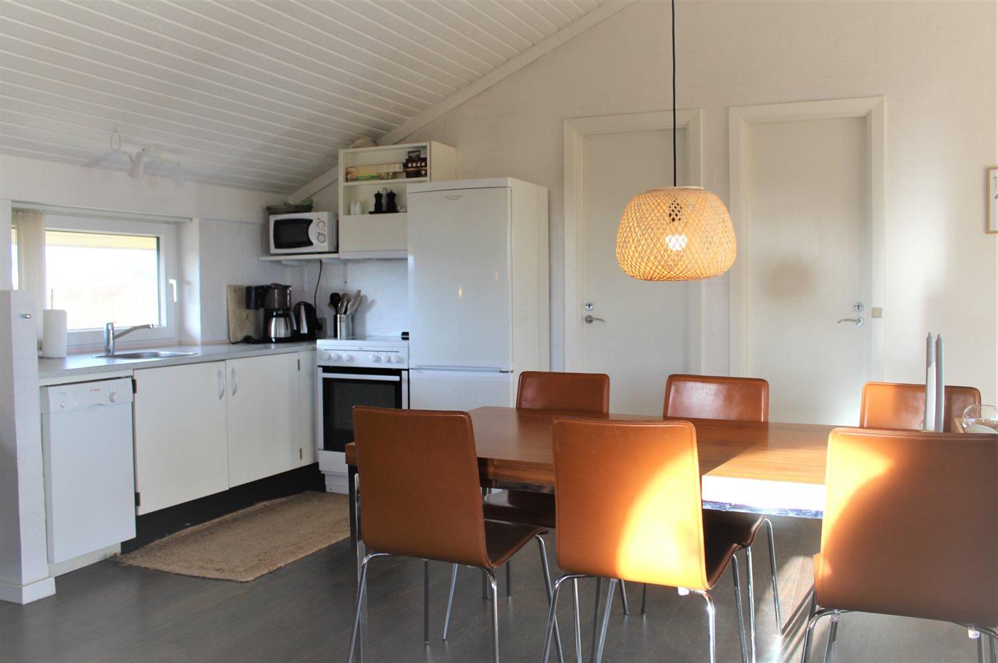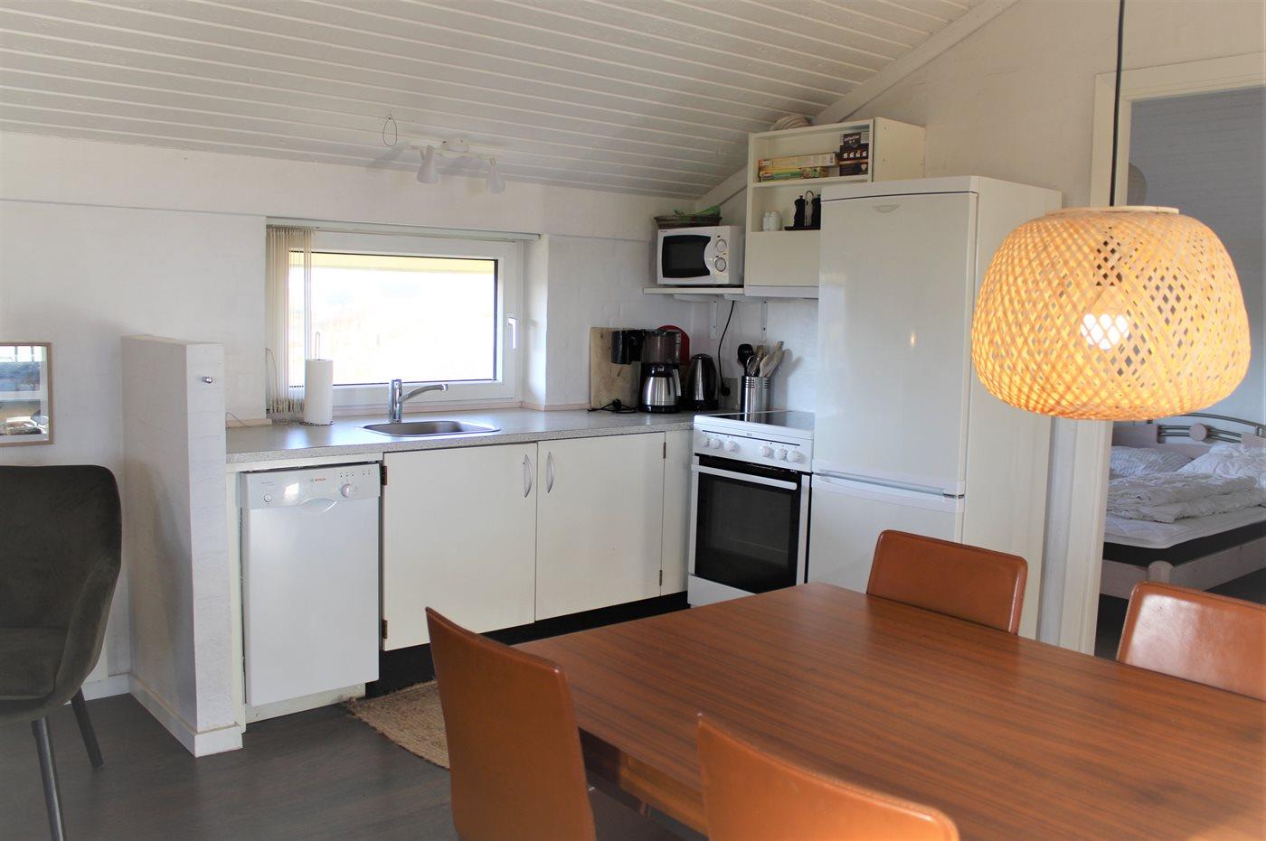 Køkkenet er udstyret med 1 køleskab. Der er 4 keramiske kogeplader, bageovn, mikrobølgeovn samt opvaskemaskine.