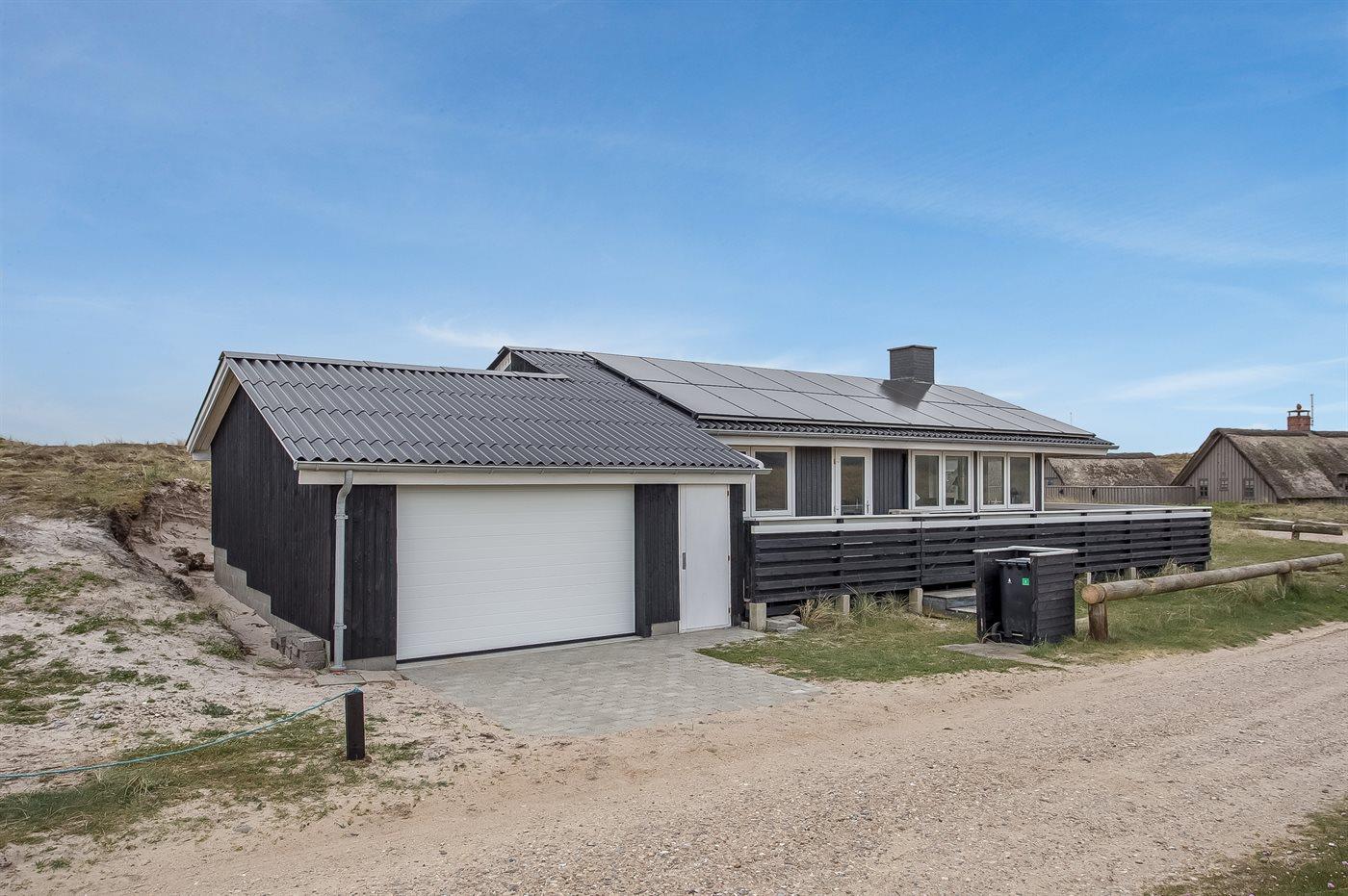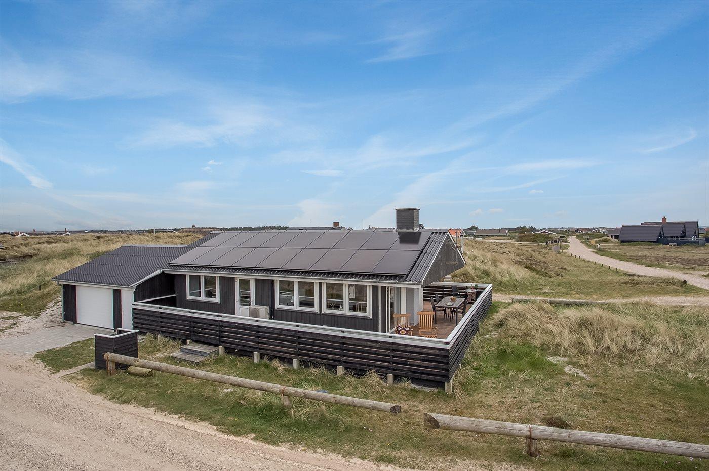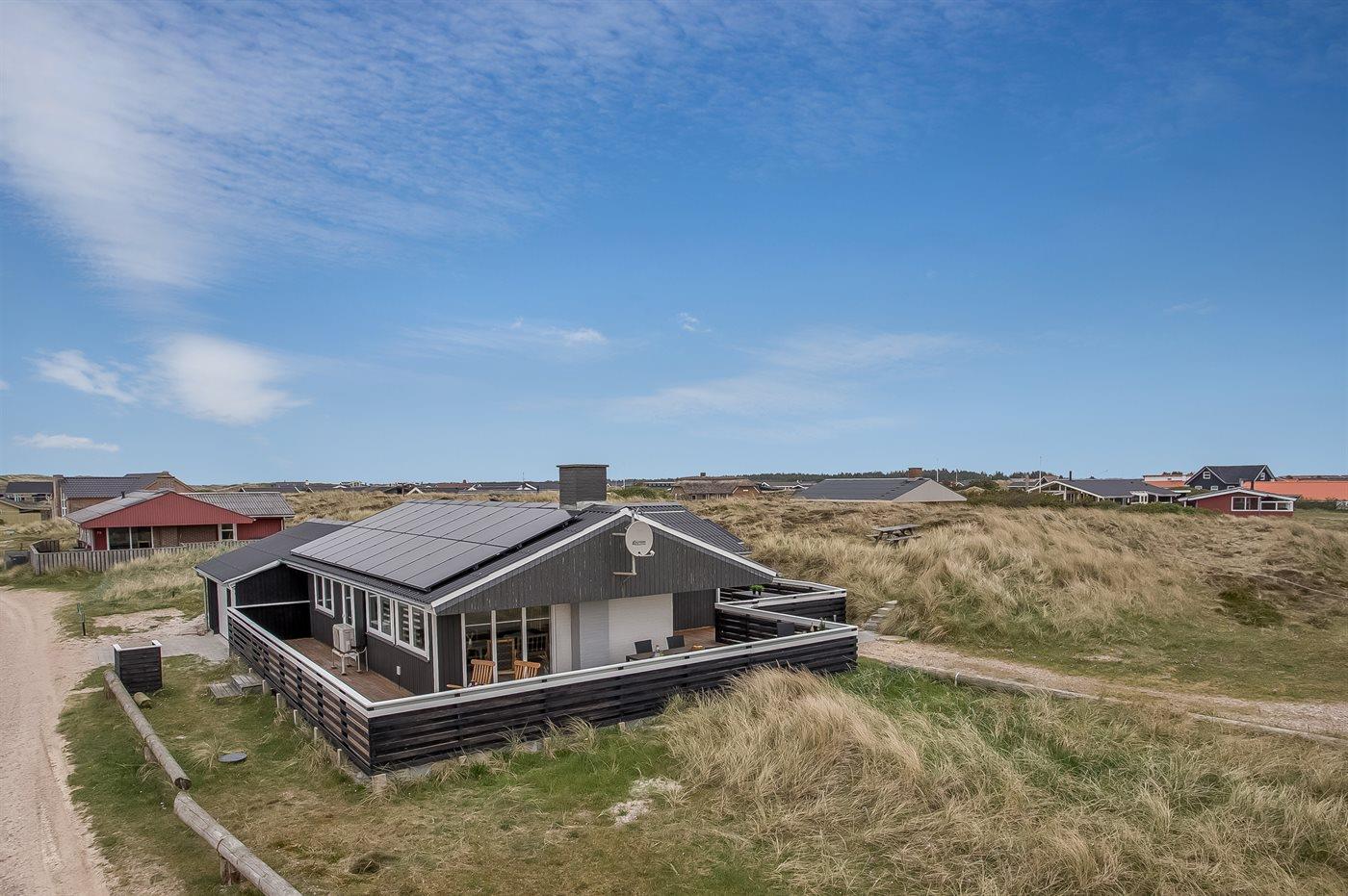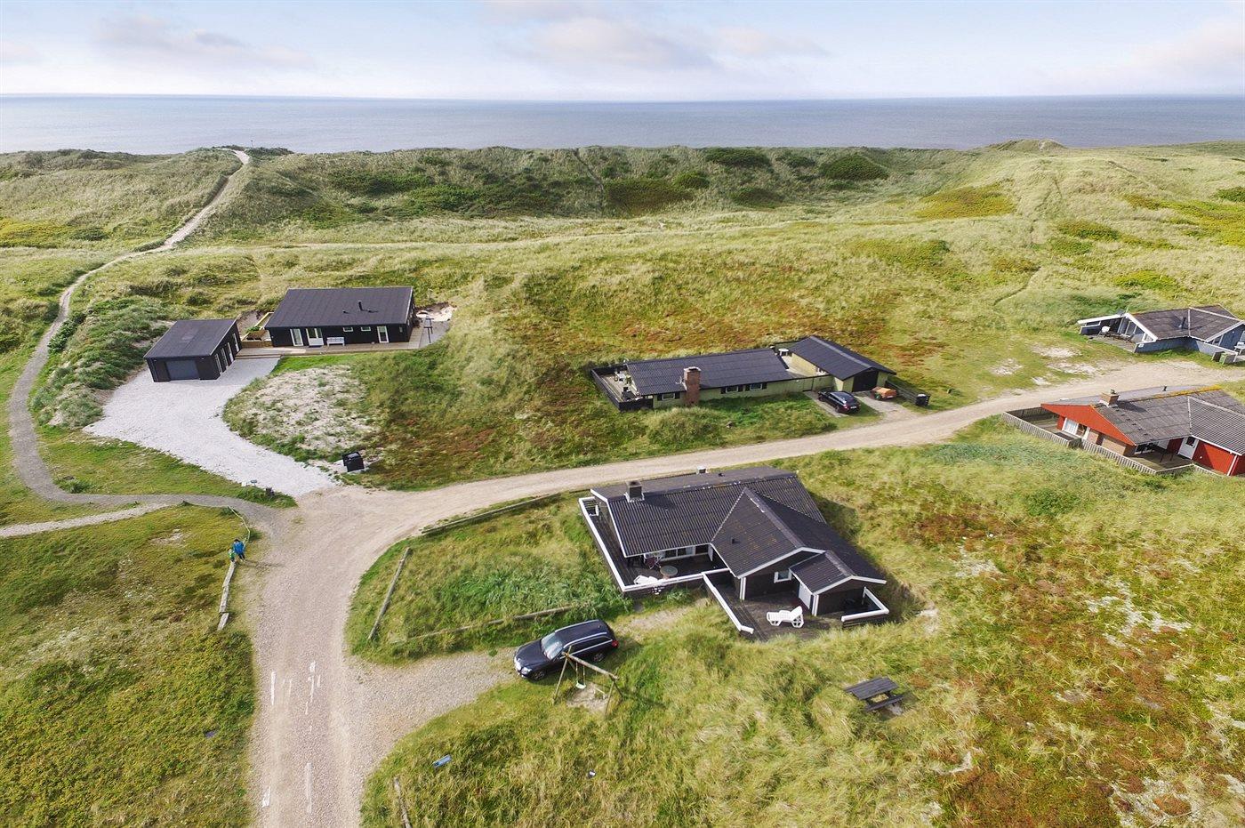 Ferieboligen er beliggende på en 1400 m² stor klitgrund. Der er 175 m til havet. Der er 1200 m til fjorden. Nærmeste forretning er beliggende i en afstand af 1900 m. Til ferieboligen hører 80 m² lukket terrasseareal – heraf er 60 m² åbent og 20 m² overdækket. Der er redskabsrum (8 m²). Grill til rådighed. Der er garage til rådighed (30 m²). Der er installeret stik til opladning af elbil. Type 2 stik. Parkering ved ferieboligen.