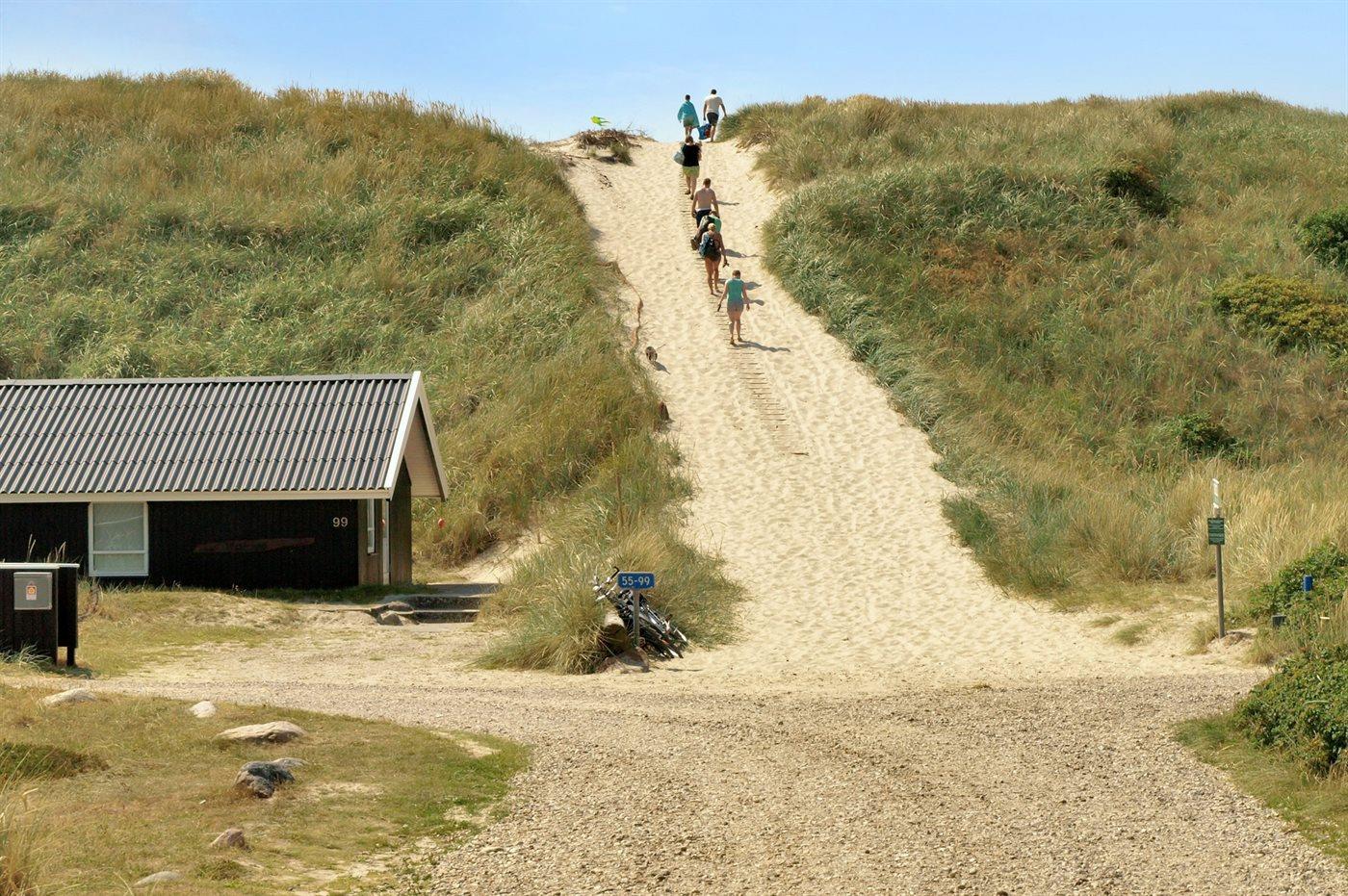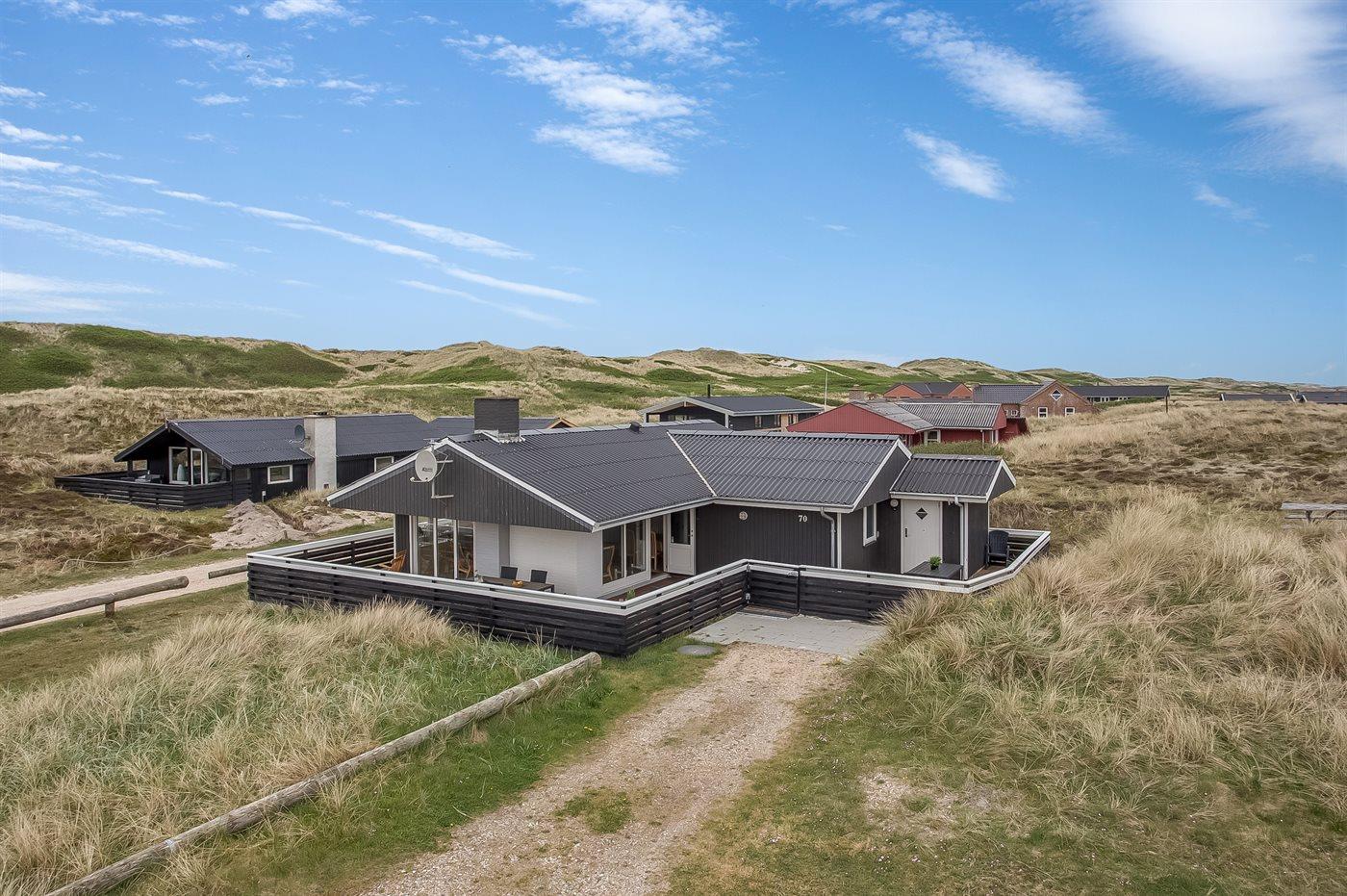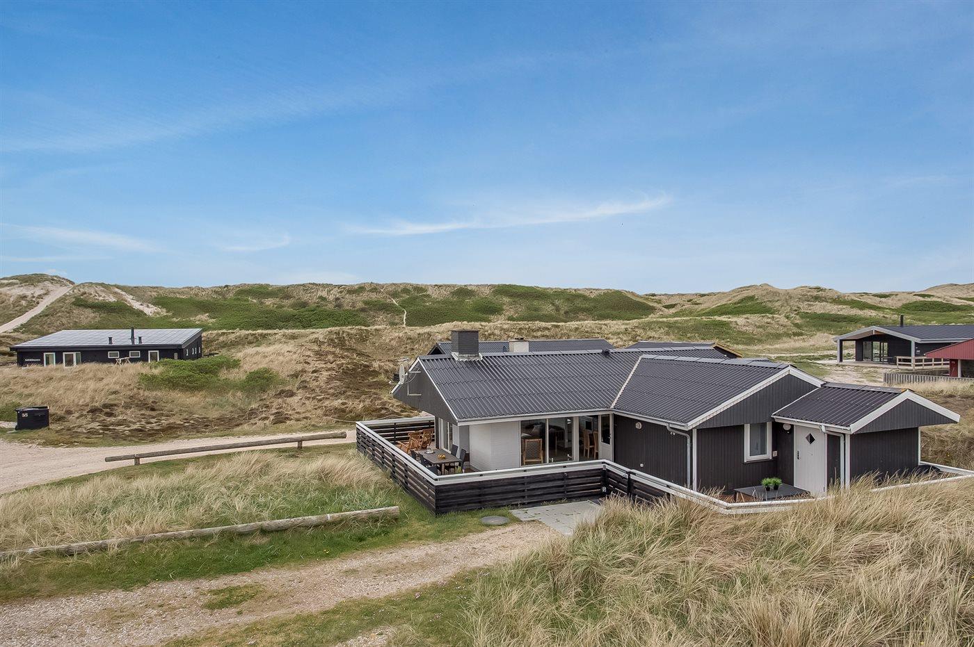 Ferieboligen er beliggende på en 1400 m² stor klitgrund. Der er 175 m til havet. Der er 1200 m til fjorden. Nærmeste forretning er beliggende i en afstand af 1900 m. Til ferieboligen hører 80 m² lukket terrasseareal – heraf er 60 m² åbent og 20 m² overdækket. Der er redskabsrum (8 m²). Grill til rådighed. Der er garage til rådighed (30 m²). Der er installeret stik til opladning af elbil. Type 2 stik. Parkering ved ferieboligen.
