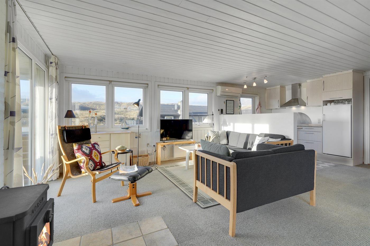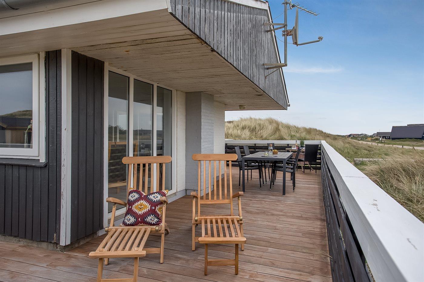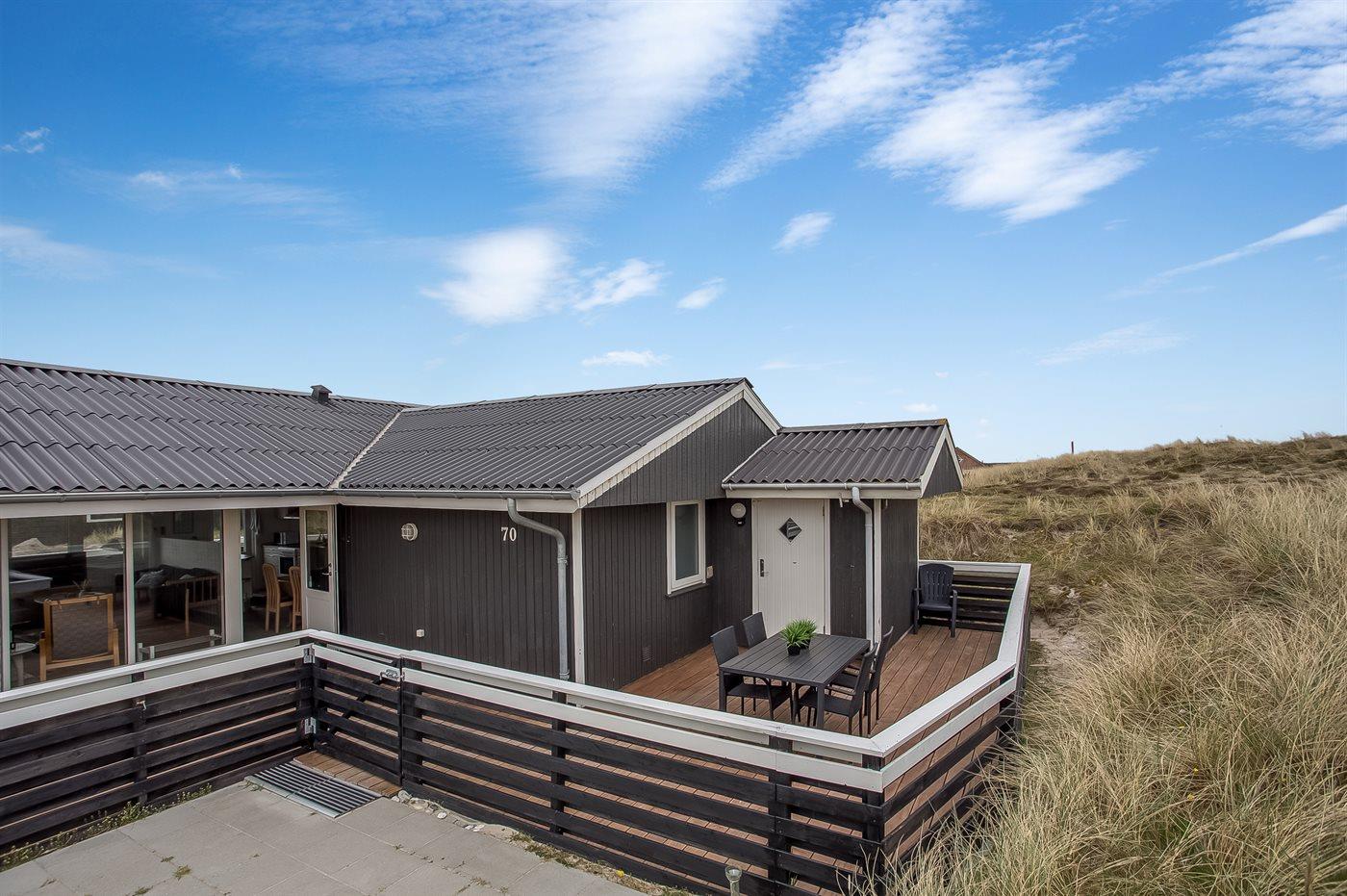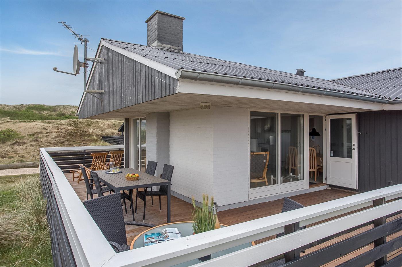 Ferieboligen er beliggende på en 1400 m² stor klitgrund. Der er 175 m til havet. Der er 1200 m til fjorden. Nærmeste forretning er beliggende i en afstand af 1900 m. Til ferieboligen hører 80 m² lukket terrasseareal – heraf er 60 m² åbent og 20 m² overdækket. Der er redskabsrum (8 m²). Grill til rådighed. Der er garage til rådighed (30 m²). Der er installeret stik til opladning af elbil. Type 2 stik. Parkering ved ferieboligen.