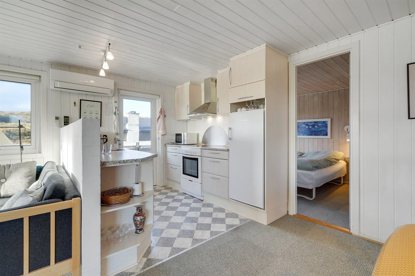 Køkkenet er udstyret med 1 køleskab (197 liter). Der er 4 keramiske kogeplader, varmluftovn, mikrobølgeovn samt opvaskemaskine.