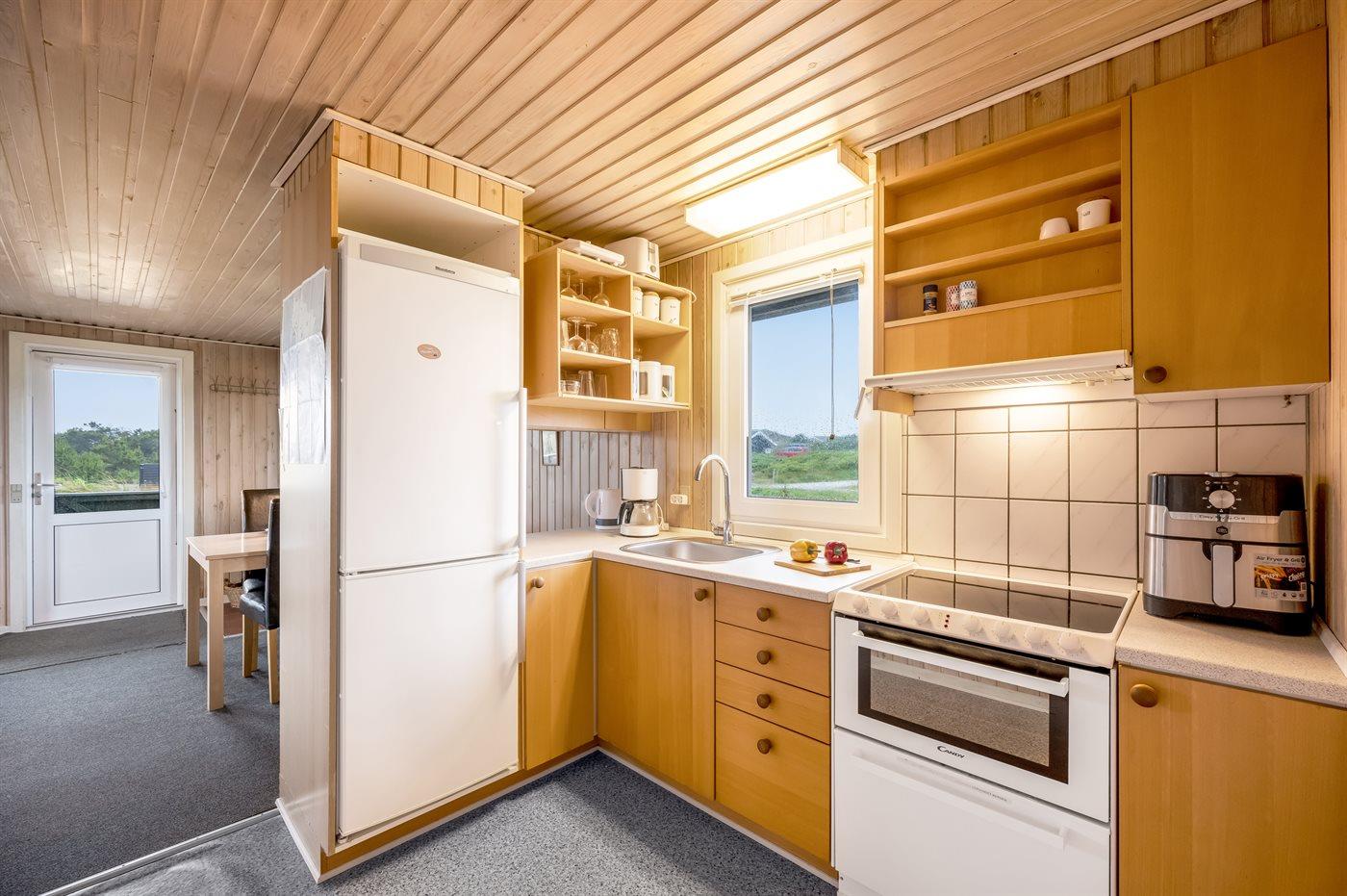 Køkkenet er udstyret med 1 køleskab. Der er 4 keramiske kogeplader, varmluftovn, mikrobølgeovn, Airfryer samt opvaskemaskine.