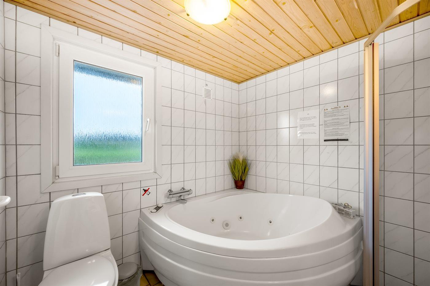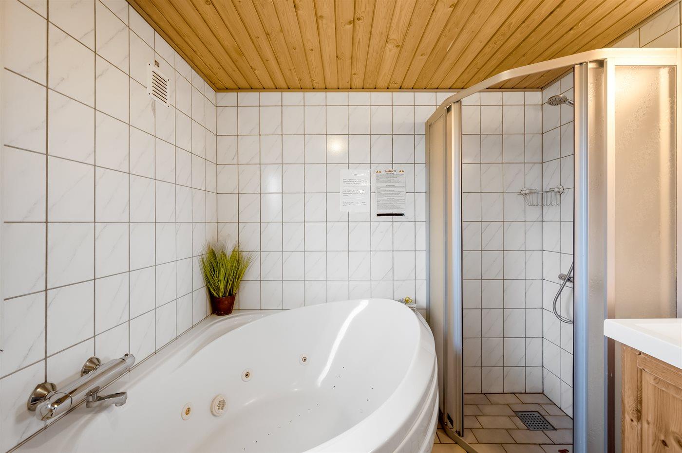 Der er 1 badeværelse med bruseniche og 1 toilet.. Der er gulvvarme på 1 badeværelse. I saunaen er der mulighed for afslapning.