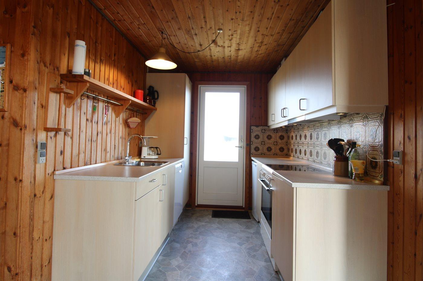 Køkkenet er udstyret med 1 køleskab. Der er 4 keramiske kogeplader, bageovn samt opvaskemaskine.