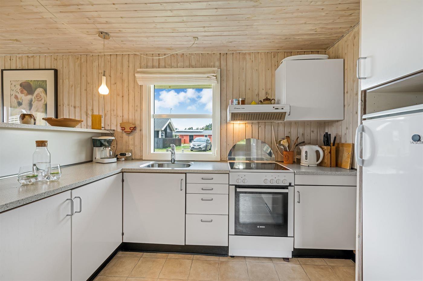 Køkkenet er udstyret med 1 køleskab. Der er 4 elkogeplader, bageovn.
