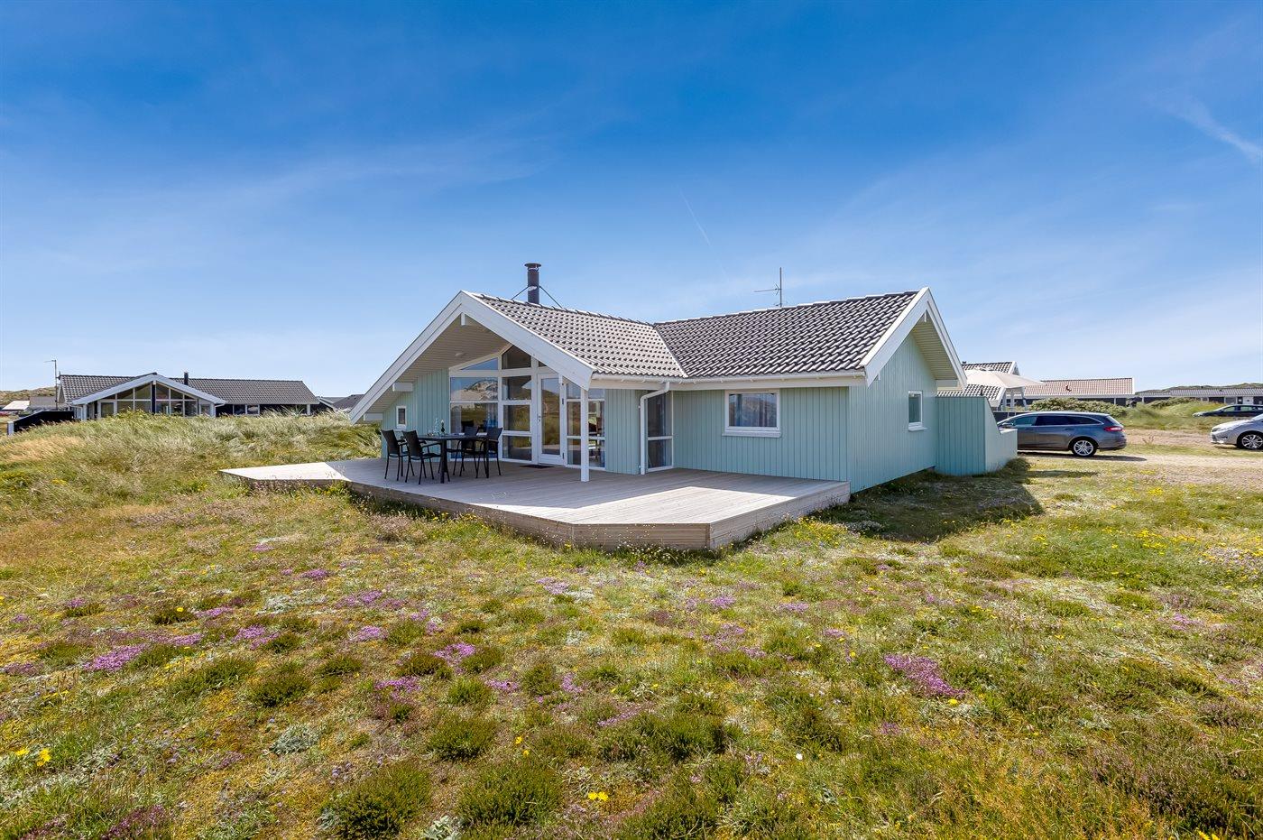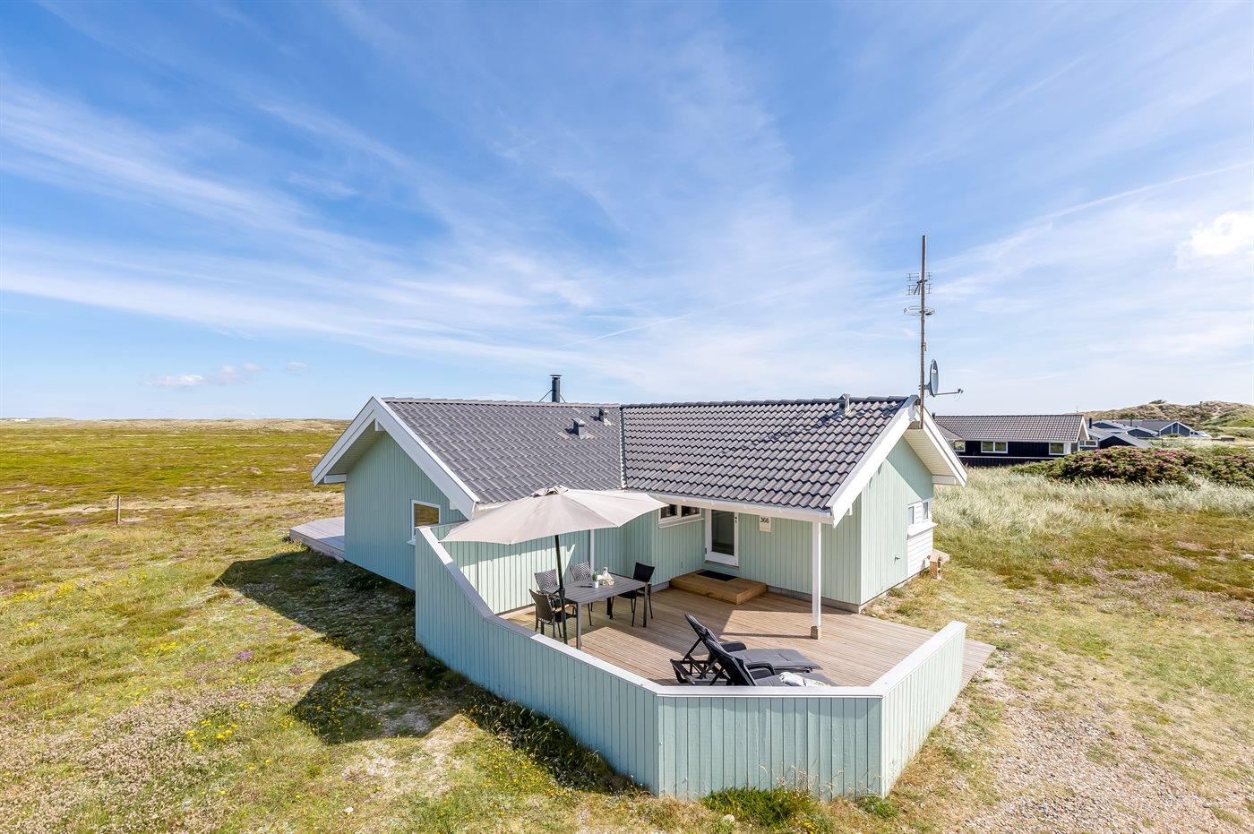 Et skønt luksussommerhus i træ med spa og sauna - beliggende på natur-/klitgrund kun 150 m fra Vesterhavet. Til huset hører stort terrasseareal, både åbent og overdækket, med havemøbler. Fantastisk panoramaudsigt fra såvel terrasse som hus til fredet natur/-klitområde.
