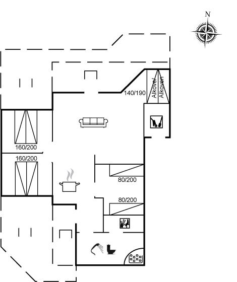 Der er i alt 3 soveværelser. Sovepladserne fordeler sig på: 4 sovepladser i dobbeltsenge. 2 sovepladser i enkeltsenge. 2 sovepladser i alkove. 2 af disse sovepladser befinder sig i stuen.