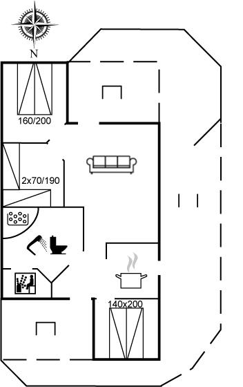 Der er i alt 3 soveværelser. Sovepladserne fordeler sig på: 4 sovepladser i dobbeltsenge. 2 sovepladser i enkeltsenge. Derudover er der 1 stk. barneseng.