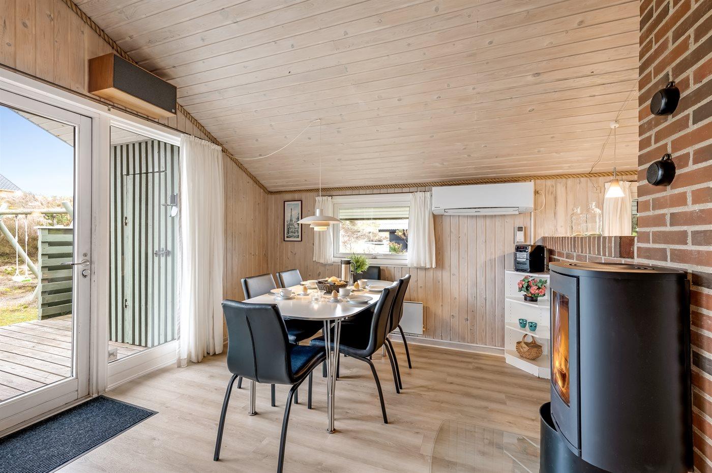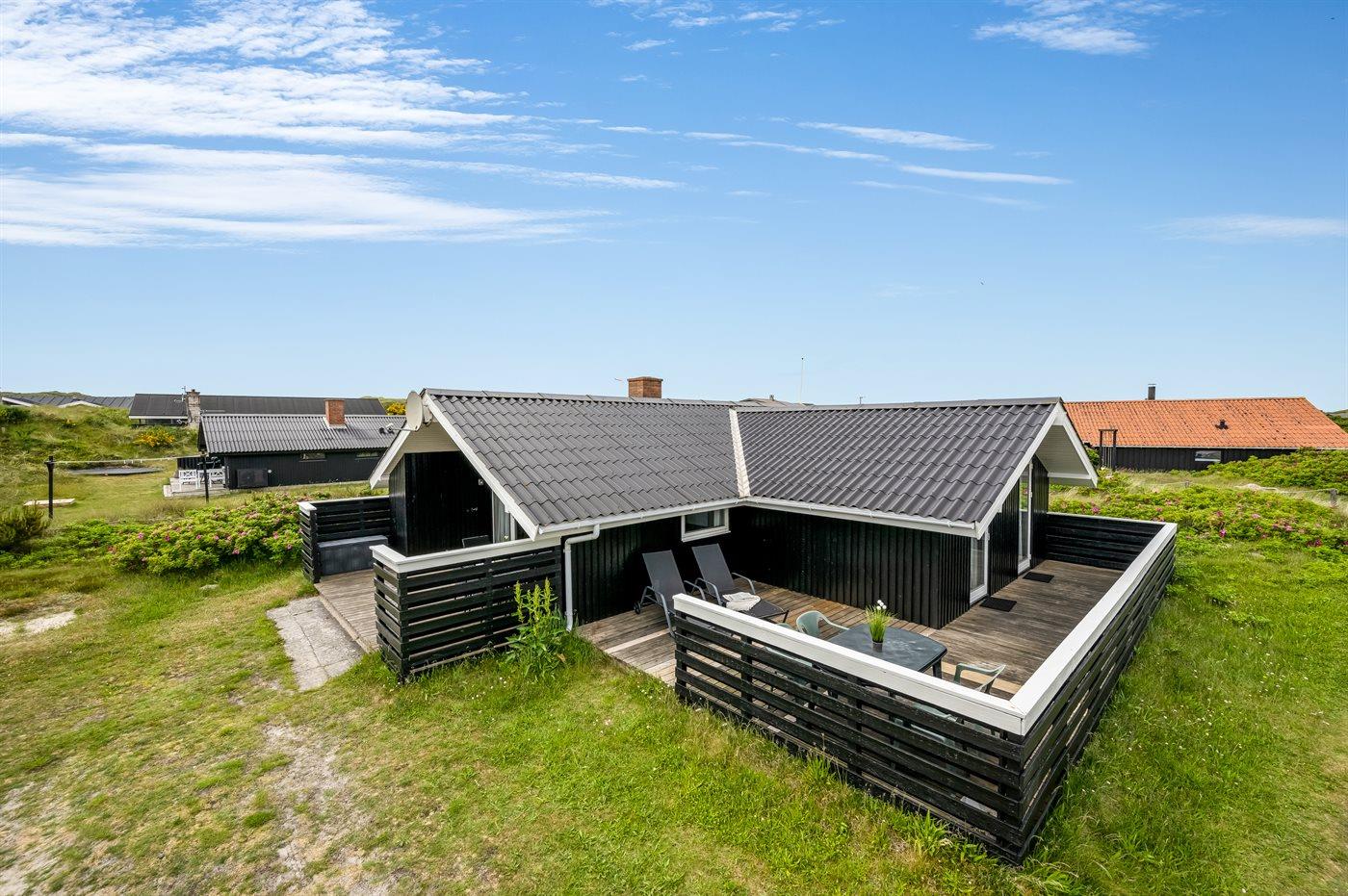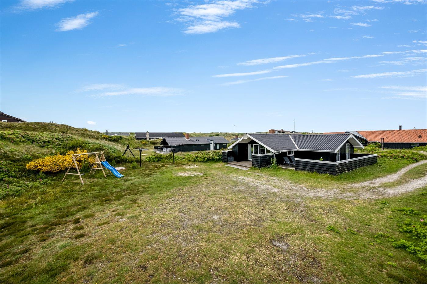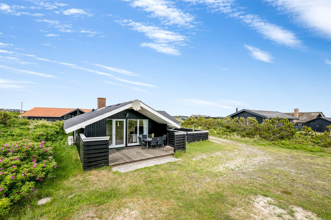 På en dejlig, kuperet klitgrund kun 200 m fra Vesterhavet ligger dette dejlige og velholdte sommerhus af træ, bygget i 1985 og moderniseret i 2008. Åbent og overdækket terrasseareal med diverse havemøbler og gode læforhold. Trævægge og -lofter samt gulvtæppe overalt - dog vinylgulv i køkkenet. Badeværelse med bruseniche og gulvvarme. Køkken med bl.a. opvaskemaskine, mikrobølgeovn og fryser. Hyggelig opholdsstue med brændeovn og fladskærms-TV med parabol (digital). 3 værelser; 1 med dobbeltseng, 1 med 2 enkeltsenge og 1 med køjeseng. Desuden vaskemaskine samt tørretumbler til rådighed og der er installeret energibesparende varmepumpe. Til børnene er der sandkasse, gynge, barneseng og høj barnestol. Et godt beliggende sommerhus.