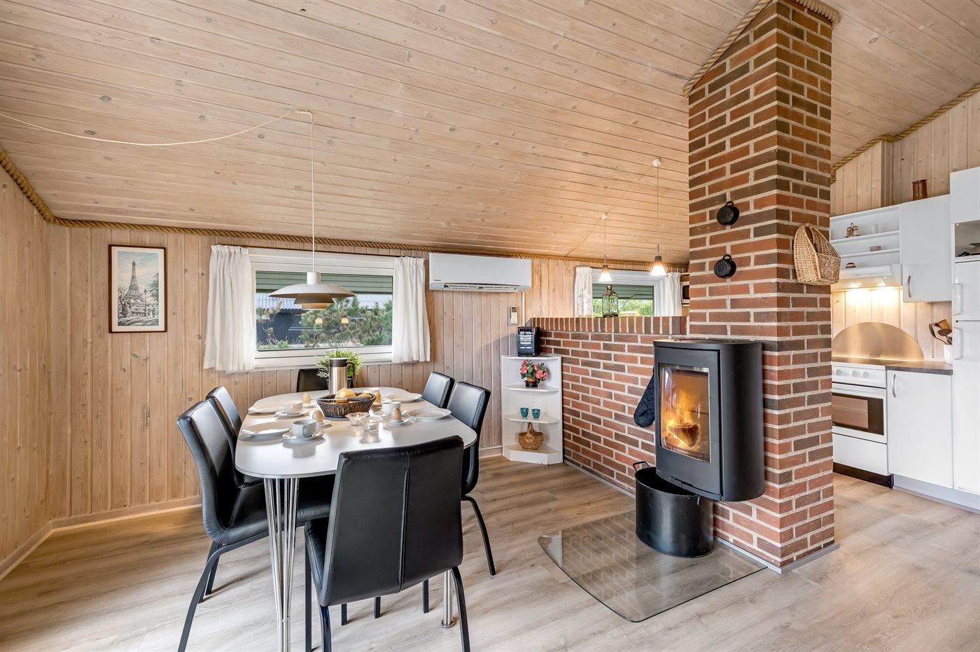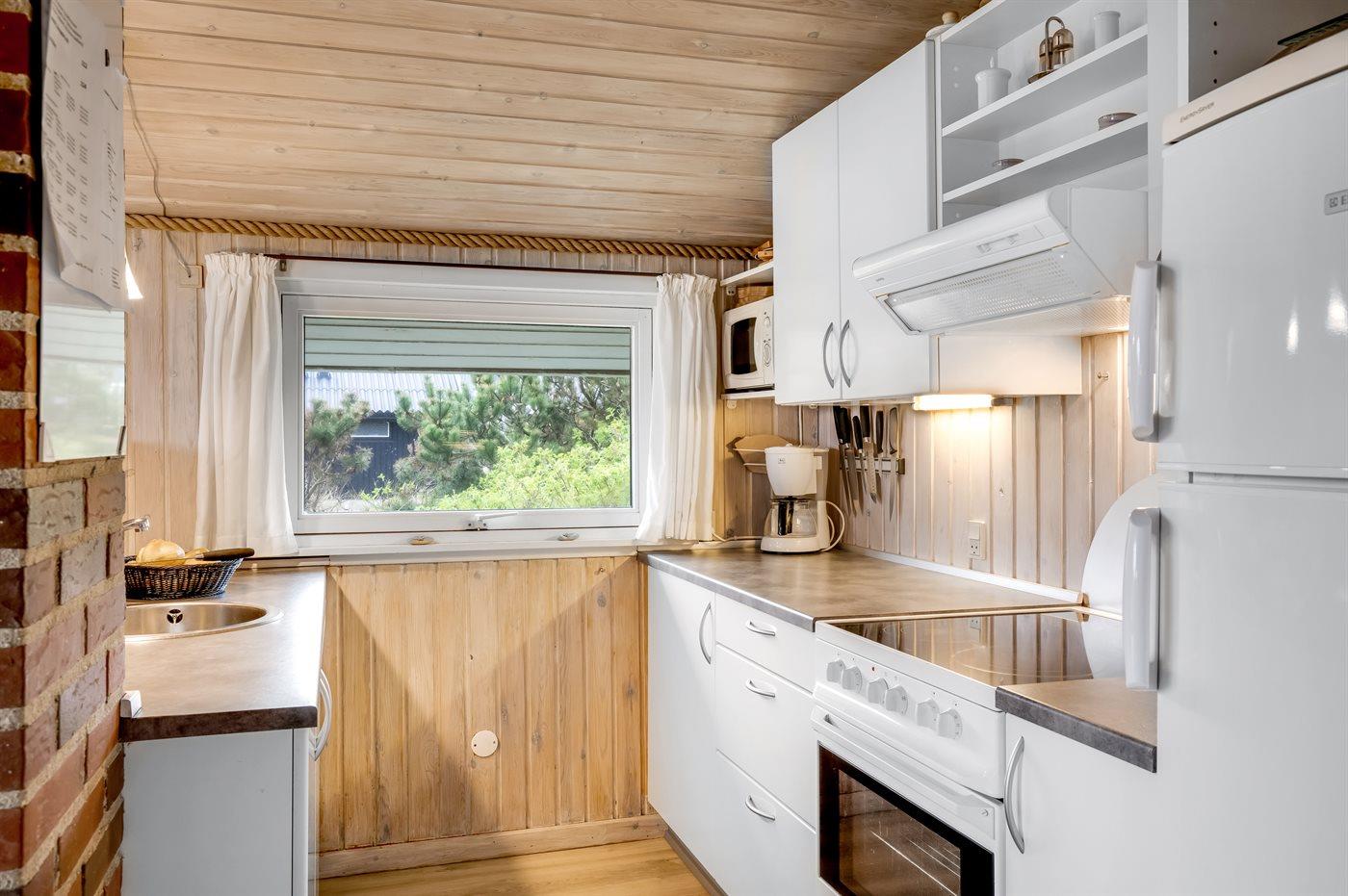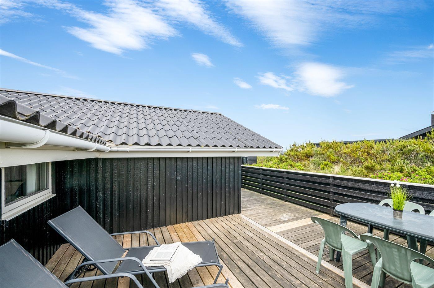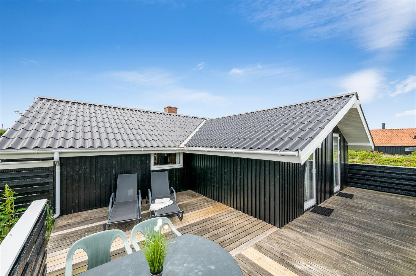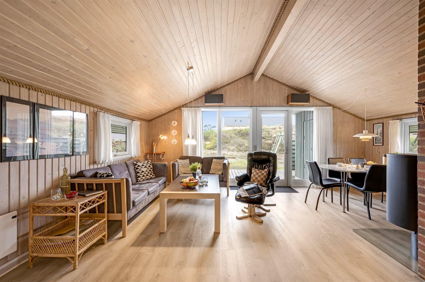 På en dejlig, kuperet klitgrund kun 200 m fra Vesterhavet ligger dette dejlige og velholdte sommerhus af træ, bygget i 1985 og moderniseret i 2008. Åbent og overdækket terrasseareal med diverse havemøbler og gode læforhold. Trævægge og -lofter samt gulvtæppe overalt - dog vinylgulv i køkkenet. Badeværelse med bruseniche og gulvvarme. Køkken med bl.a. opvaskemaskine, mikrobølgeovn og fryser. Hyggelig opholdsstue med brændeovn og fladskærms-TV med parabol (digital). 3 værelser; 1 med dobbeltseng, 1 med 2 enkeltsenge og 1 med køjeseng. Desuden vaskemaskine samt tørretumbler til rådighed og der er installeret energibesparende varmepumpe. Til børnene er der sandkasse, gynge, barneseng og høj barnestol. Et godt beliggende sommerhus.