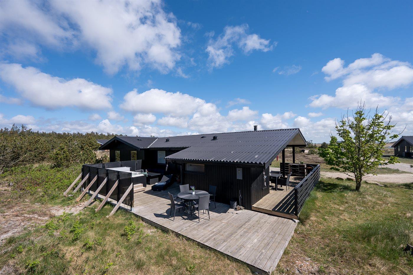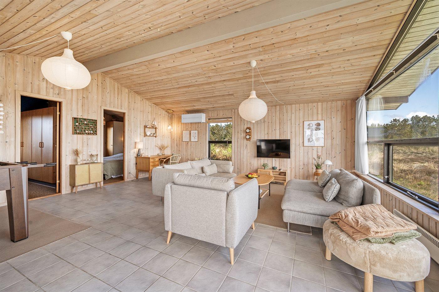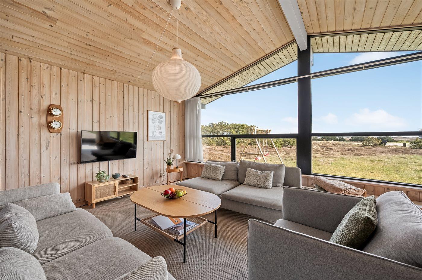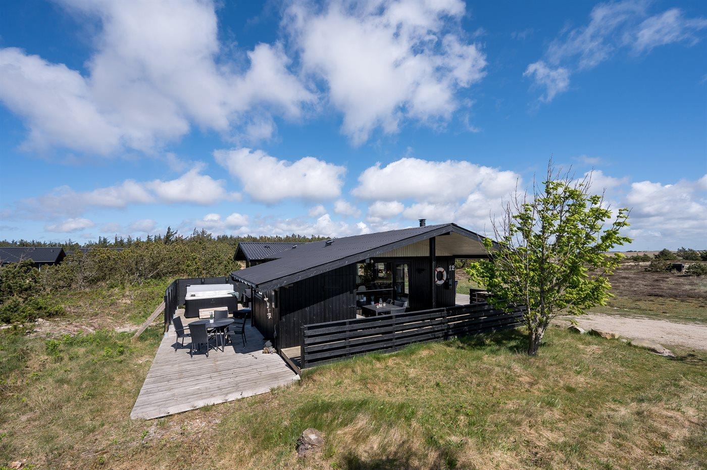 Et dejligt velholdt og godt indrettet sommerhus i træ, beliggende på en stort lyngklædt natur/-klitgrund. Gennem de store vinduer i stuen, er der en fantastisk udsigt over naturområdet med fjorden i baggrunden.