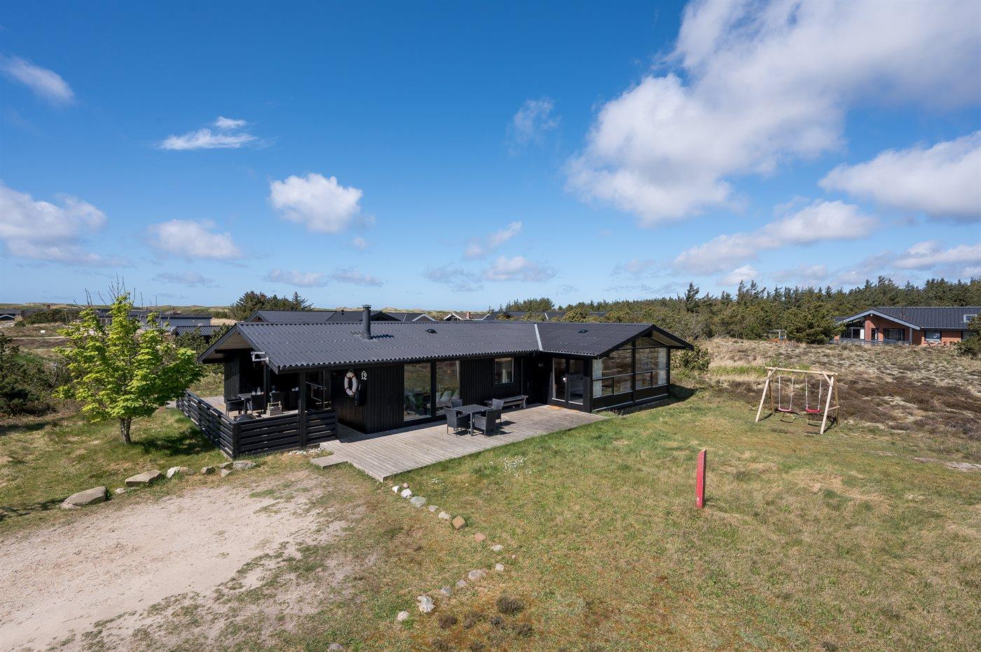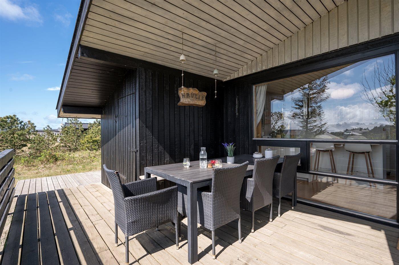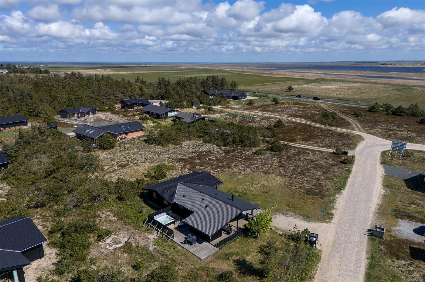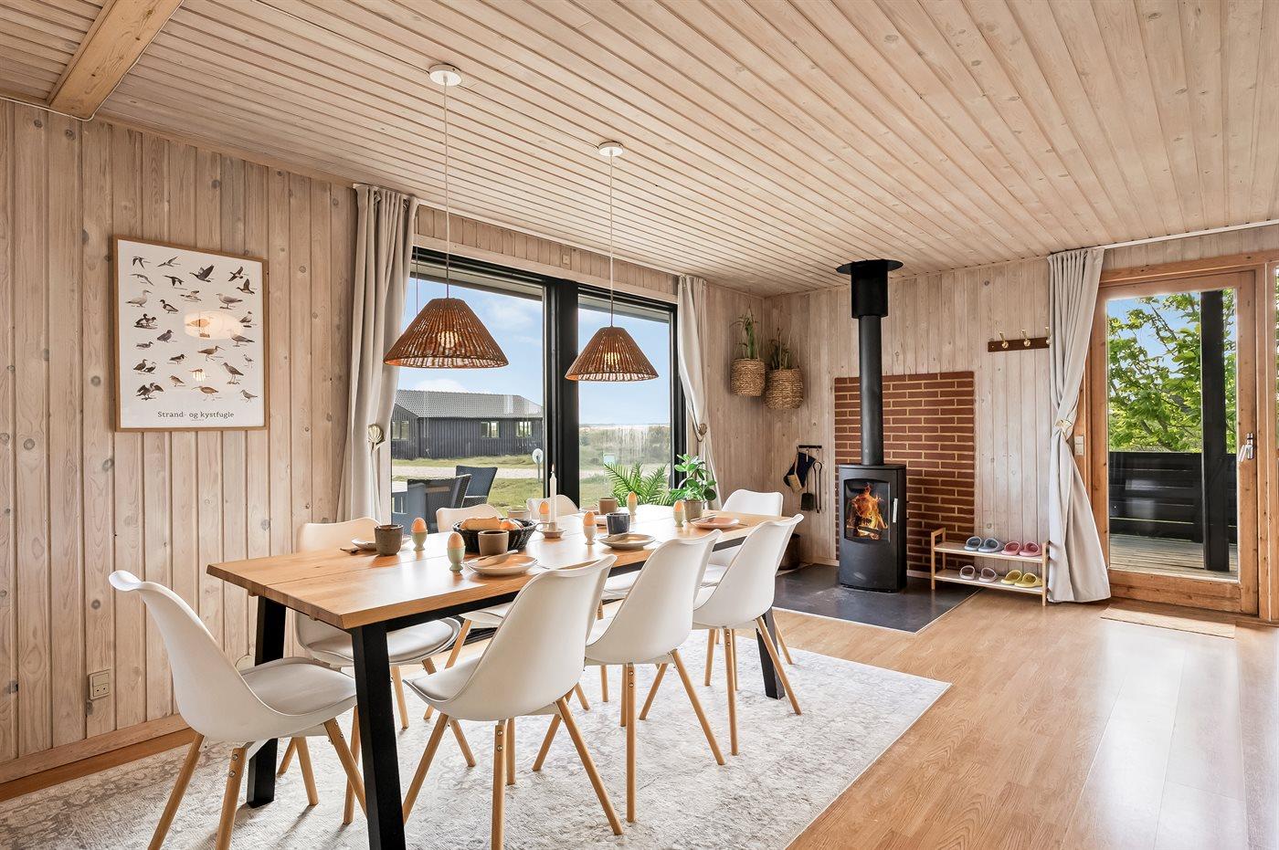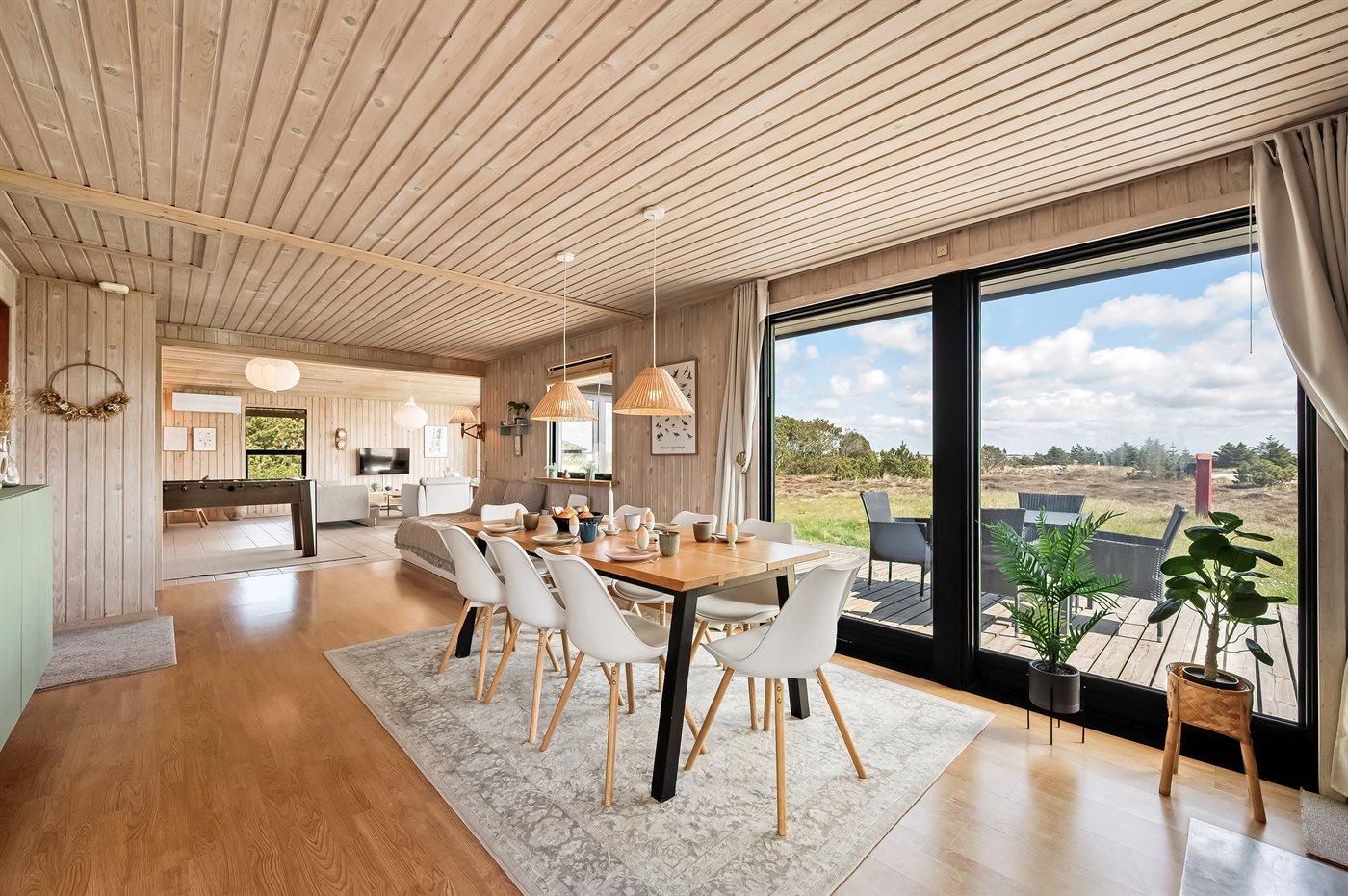 Et dejligt velholdt og godt indrettet sommerhus i træ, beliggende på en stort lyngklædt natur/-klitgrund. Gennem de store vinduer i stuen, er der en fantastisk udsigt over naturområdet med fjorden i baggrunden.