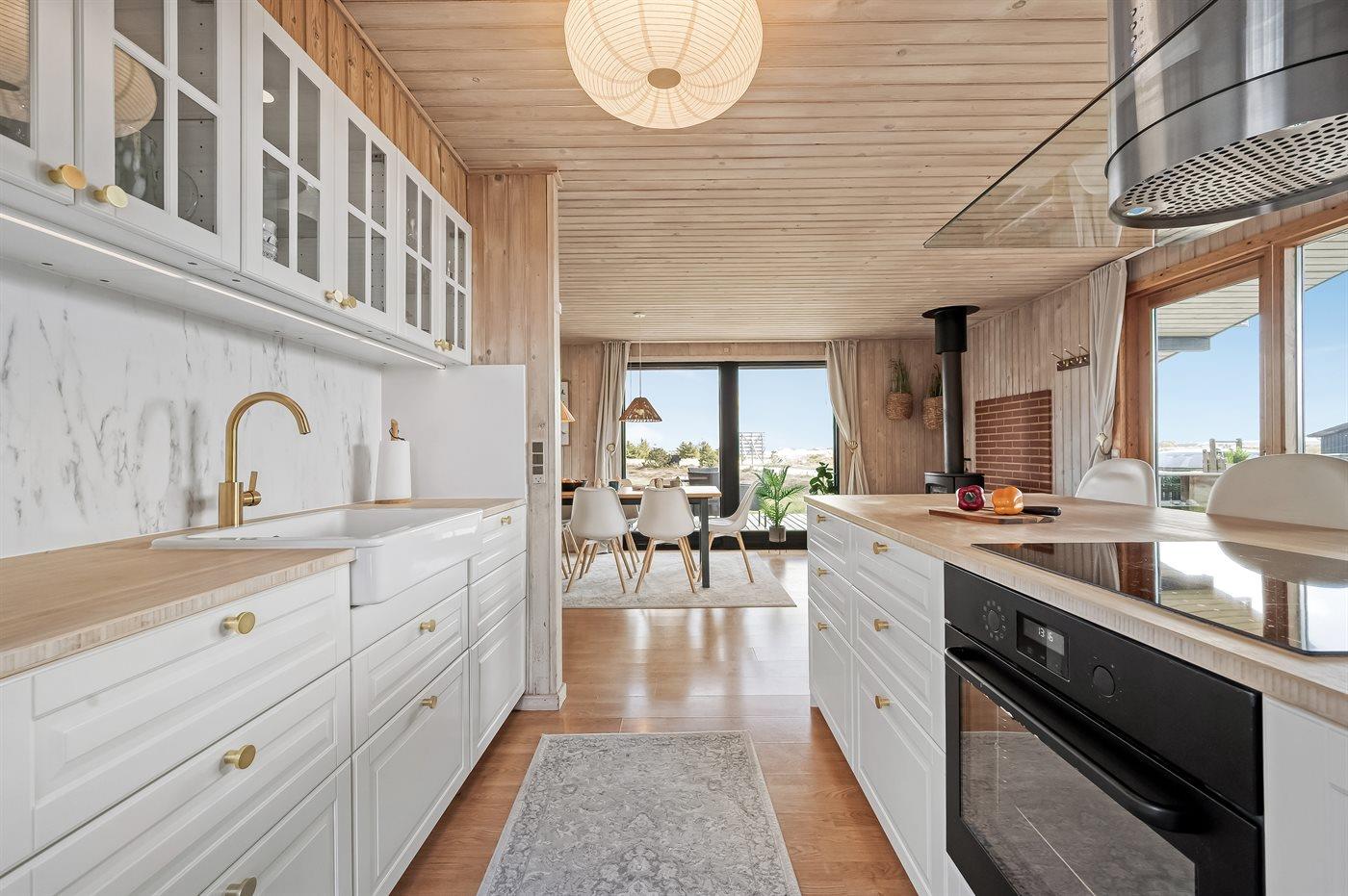 Køkkenet er udstyret med 1 køleskab. Der er 4 keramiske kogeplader, varmluftovn, mikrobølgeovn samt opvaskemaskine.