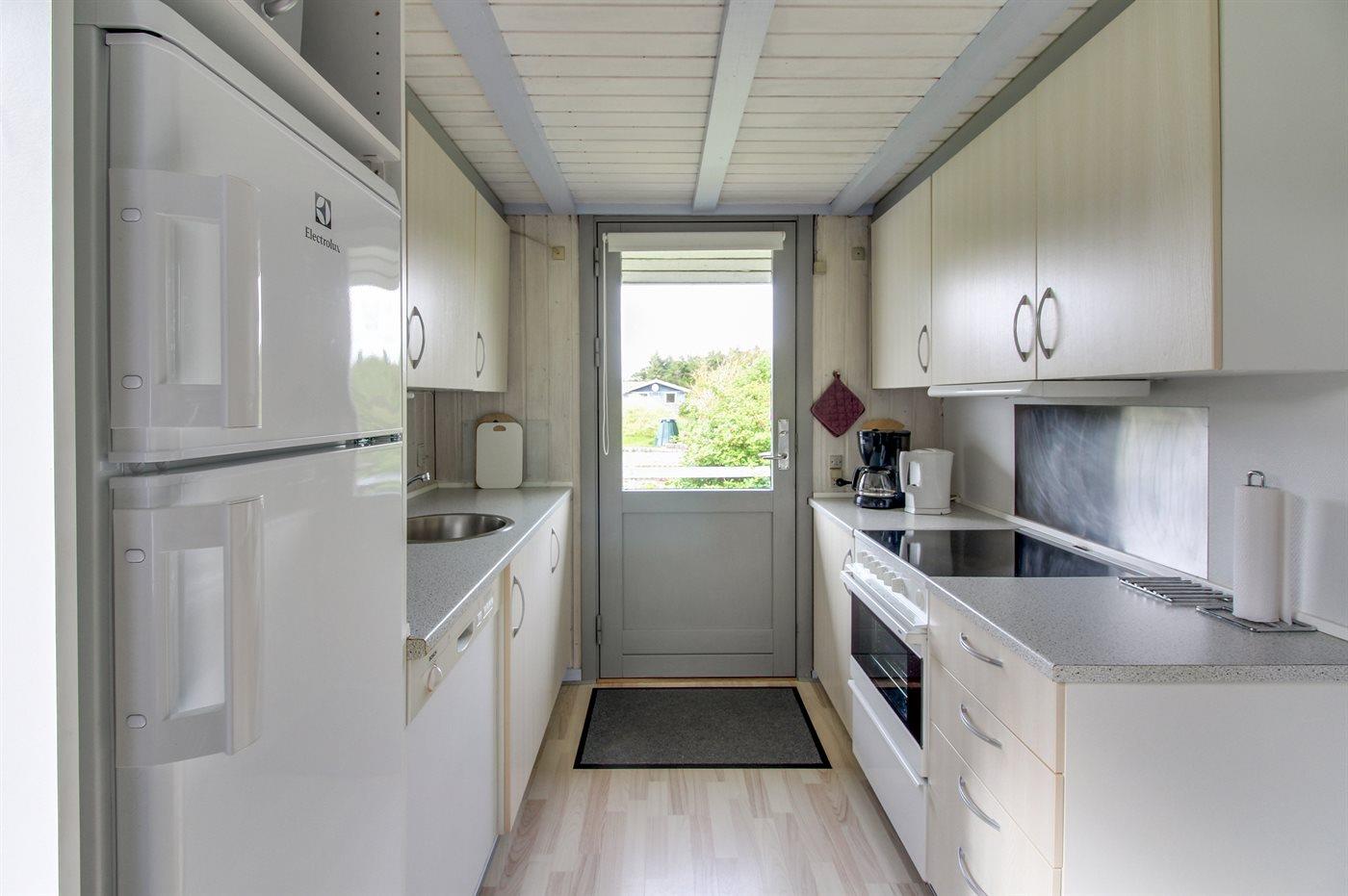 Køkkenet er udstyret med 1 køleskab. Der er 4 keramiske kogeplader, bageovn, mikrobølgeovn samt opvaskemaskine.