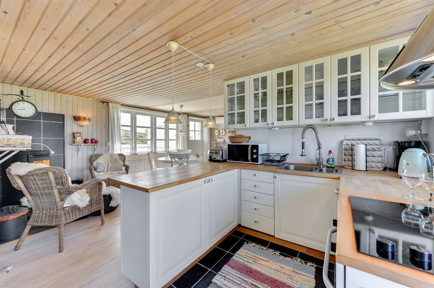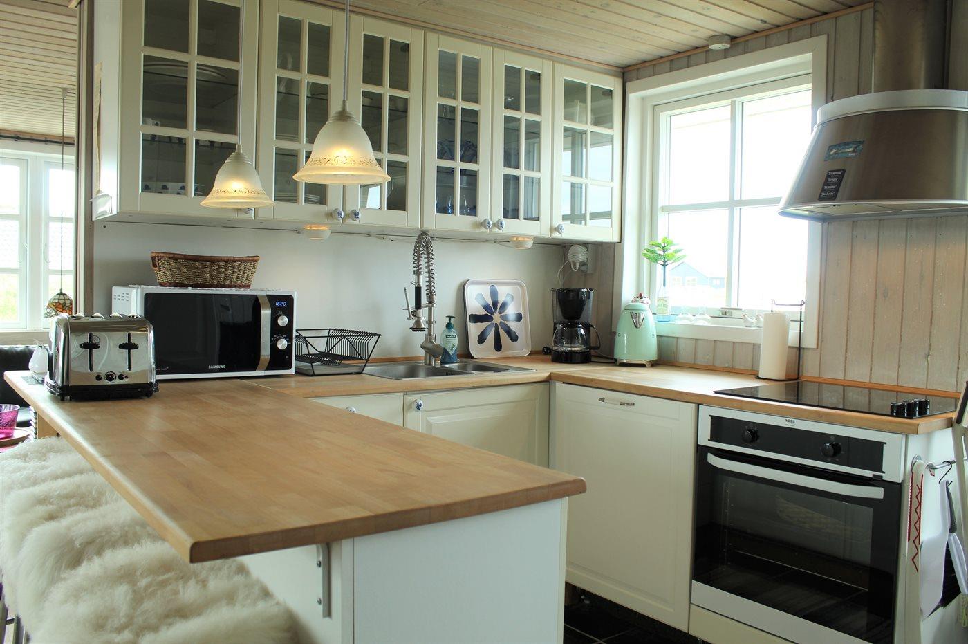 Køkkenet er udstyret med 1 køleskab. Der er 3 keramiske kogeplader, varmluftovn, mikrobølgeovn samt opvaskemaskine.