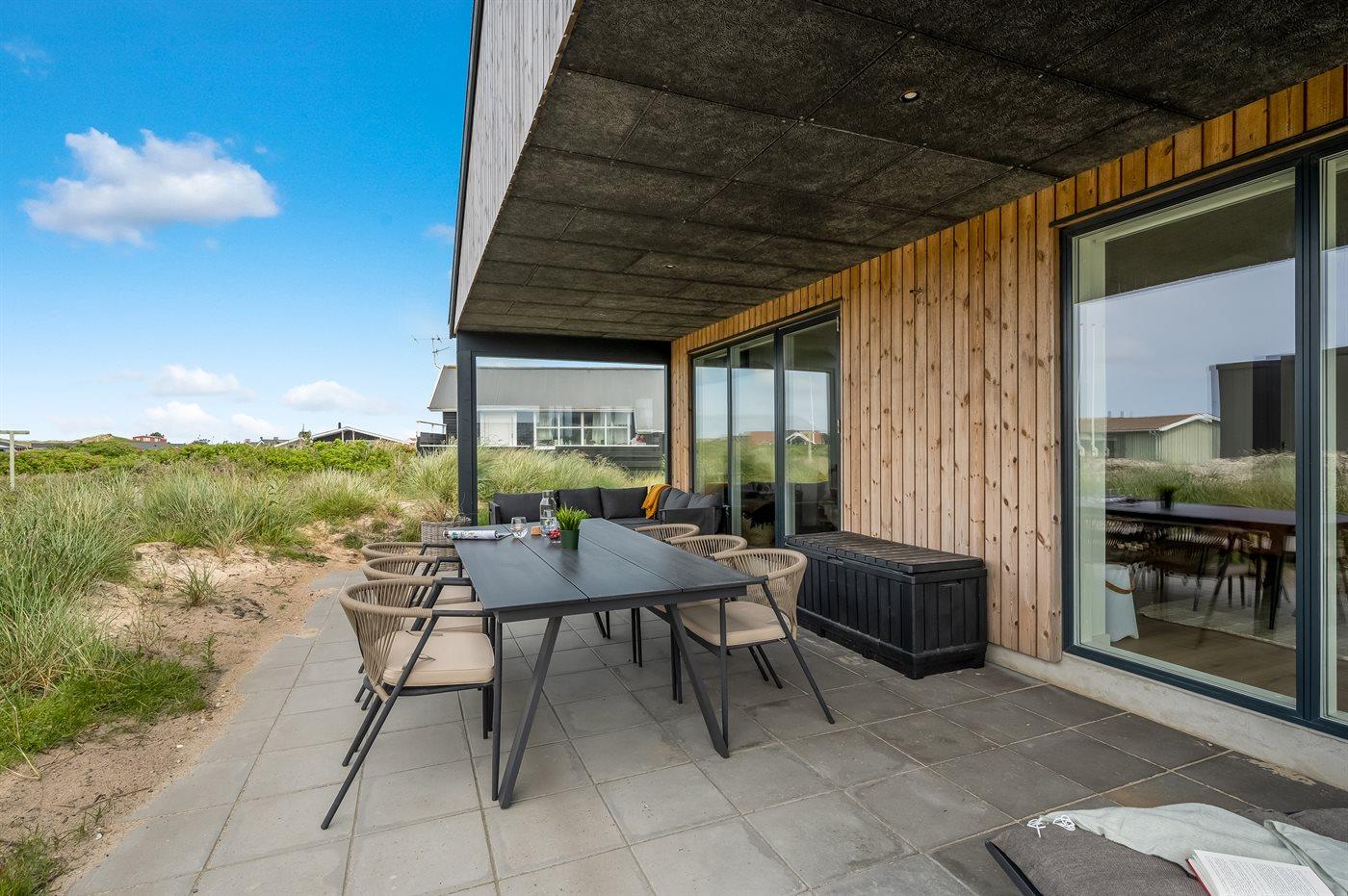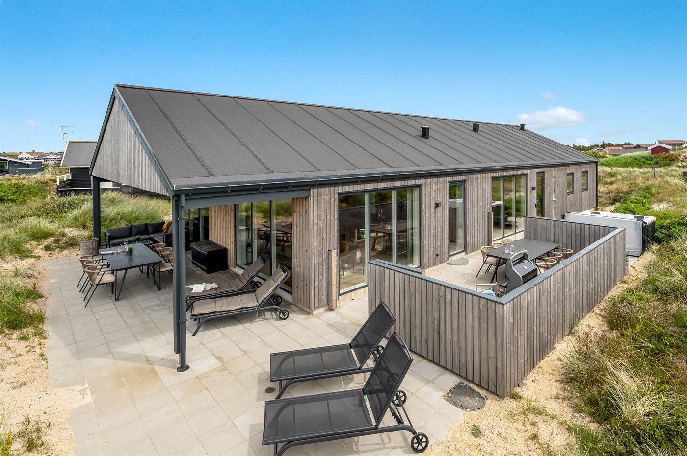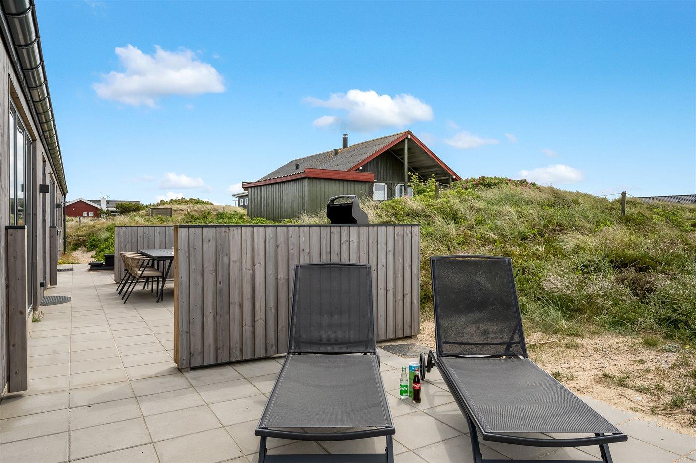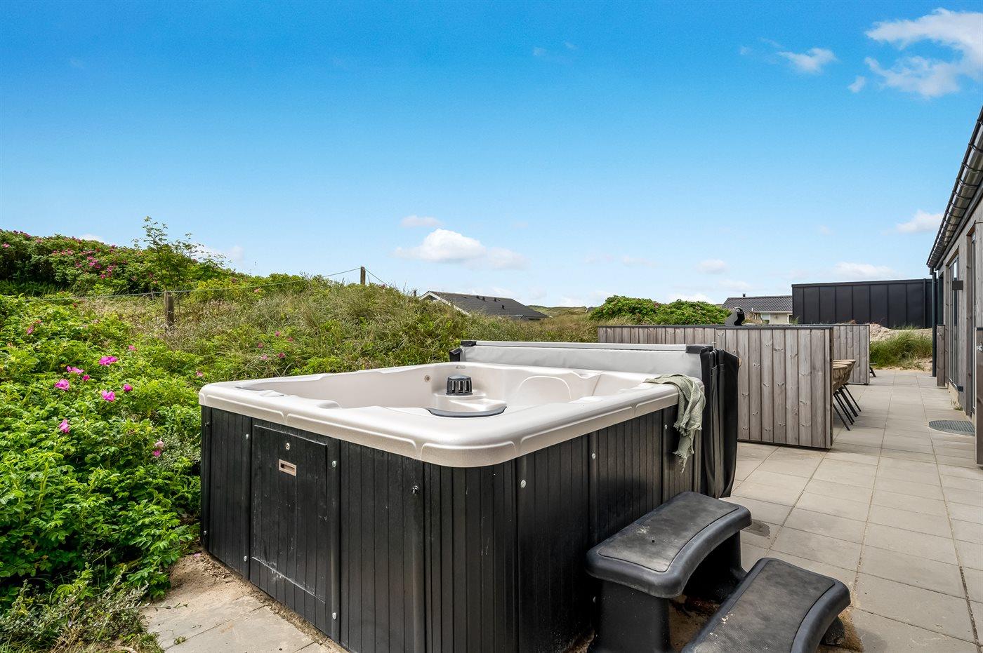 Fra husets lækre terrassemiljø kan du nyde udsigten over klitlandskabet, og vil du for alvor skrue op for luksussen skal du tænde for den udendørs spa og sauna. Dækket af det varme vand kan du slappe fuldstændig af, og om aftenen er der frit udsyn til den smukke, klare stjernehimmel. På terrassen finder du også en udendørs bruser, hvor du kan skylle saltvandet af kroppen og sandet af fødderne, når du har taget en dukkert i Vesterhavet. Du kan også vælge at tage dit morgenbad under åben himmel. Udendørsbruseren kan benyttes fra april til november.