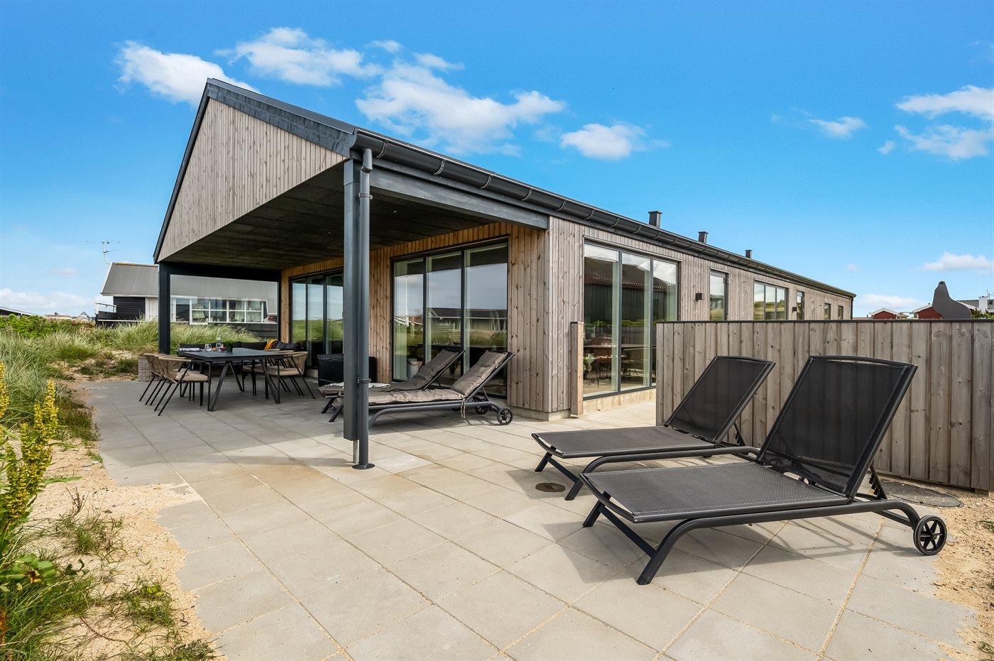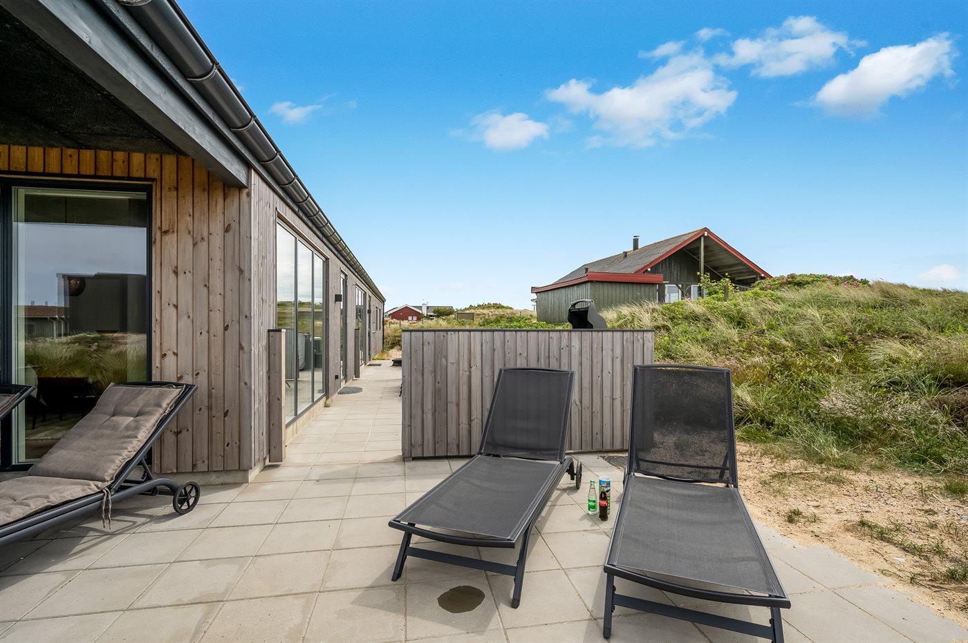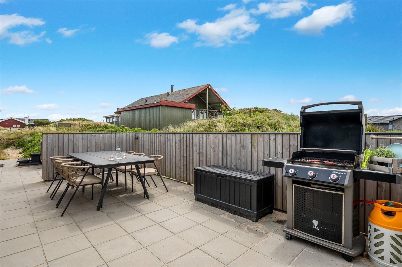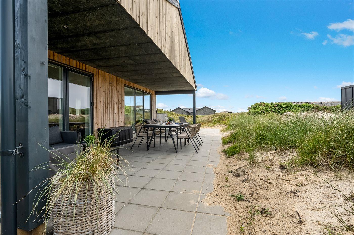 Fra husets lækre terrassemiljø kan du nyde udsigten over klitlandskabet, og vil du for alvor skrue op for luksussen skal du tænde for den udendørs spa og sauna. Dækket af det varme vand kan du slappe fuldstændig af, og om aftenen er der frit udsyn til den smukke, klare stjernehimmel. På terrassen finder du også en udendørs bruser, hvor du kan skylle saltvandet af kroppen og sandet af fødderne, når du har taget en dukkert i Vesterhavet. Du kan også vælge at tage dit morgenbad under åben himmel. Udendørsbruseren kan benyttes fra april til november.