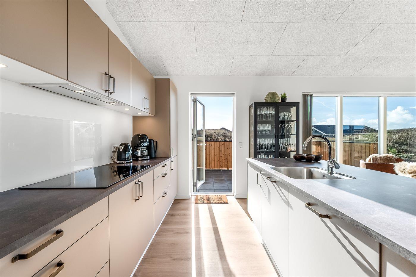 Sommerhusets køkken er velindrettet og her er plads til, at flere kan hjælpes ad og hygge sig sammen om madlavningen, og fra køkkenområdet er der adgang til en lukket terrasse, hvor hunde og små børn trygt kan bevæge sig frit.