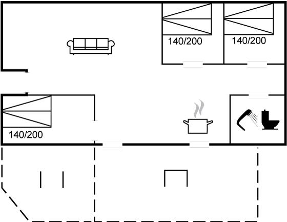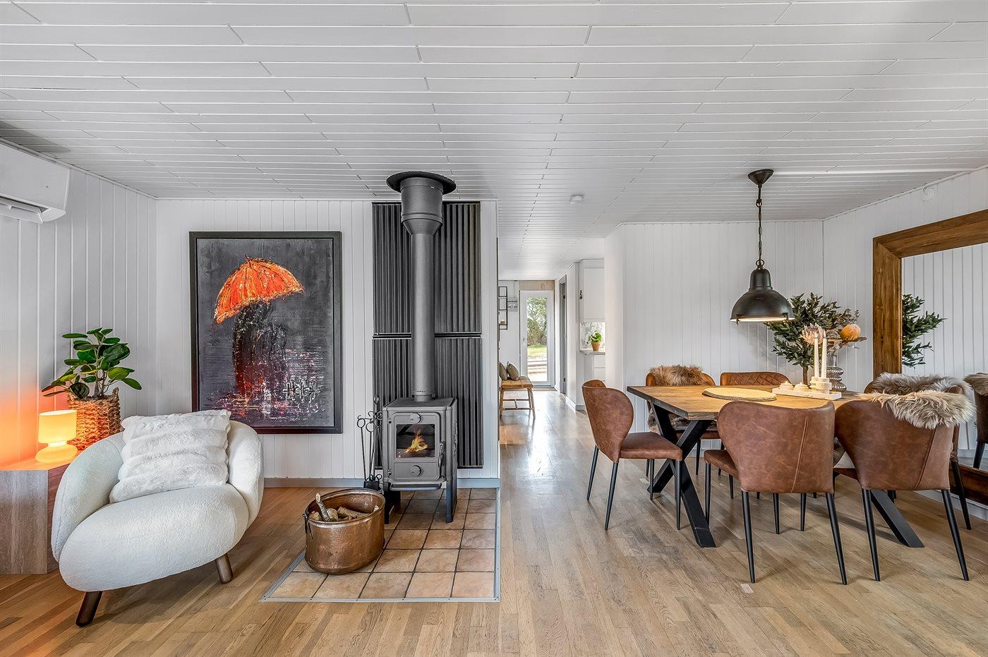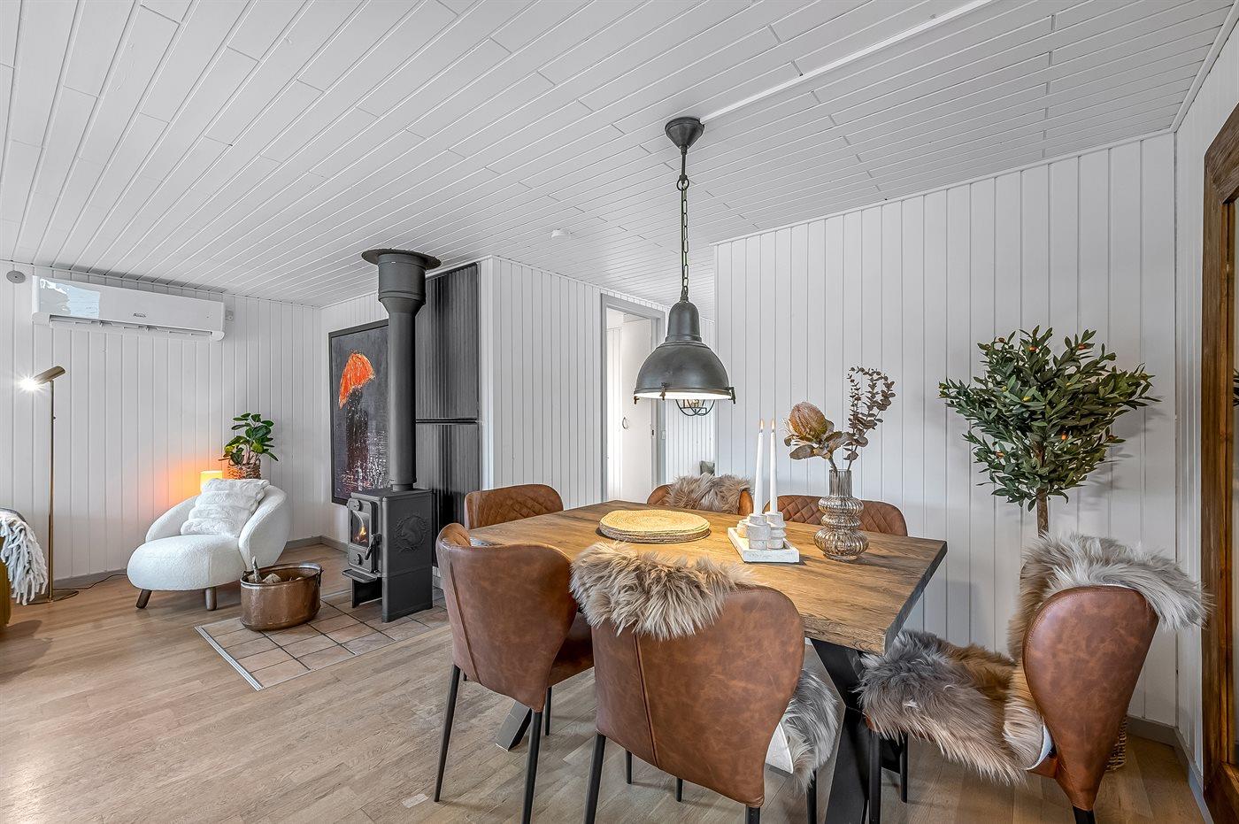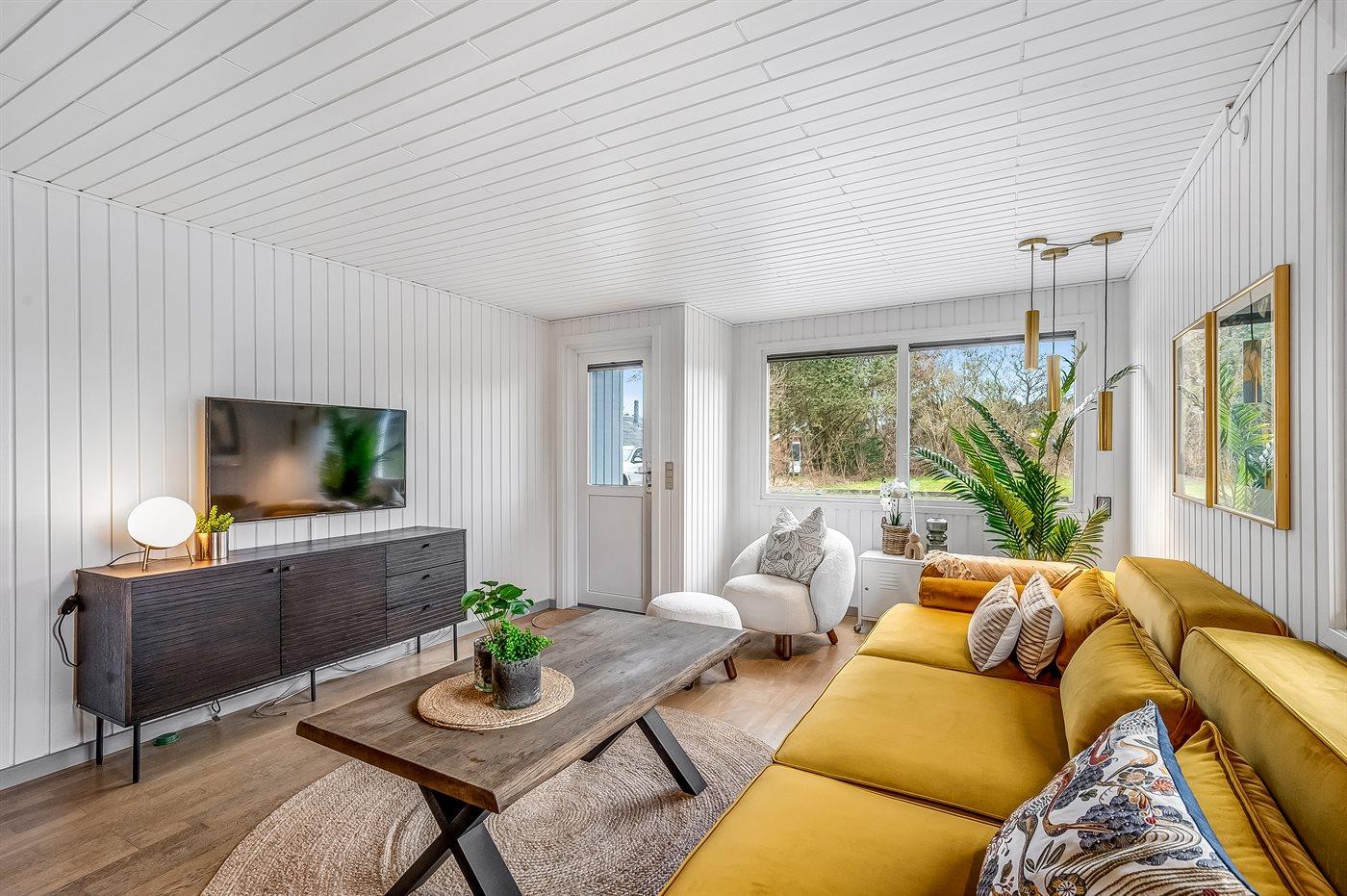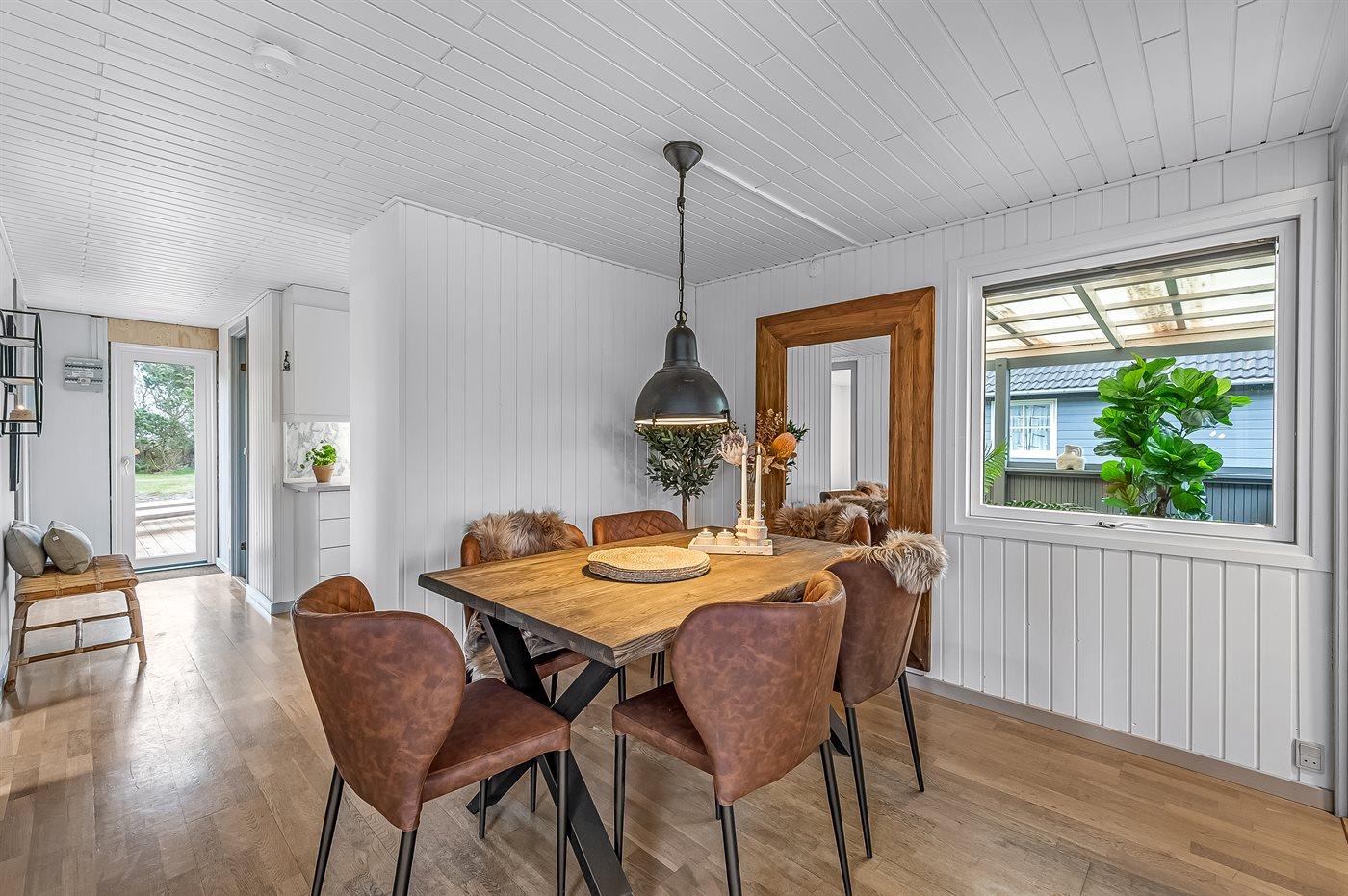 Fra køkkenalrummet, der indbyder til afslapning med en god bog foran brændeovnen, er der adgang til den hyggelige udestue, hvor I vil føle jer midt i naturen. Her kan I trække ud og gøre de lange sommernætter endnu længere. Selv på en regnvejrsdag er det hyggeligt at sidde indenfor i tørvejr og høre regnens trommen på taget, og bliver her køligt, kan I varme jer i de lækre plaider eller tænde for varmelampen.