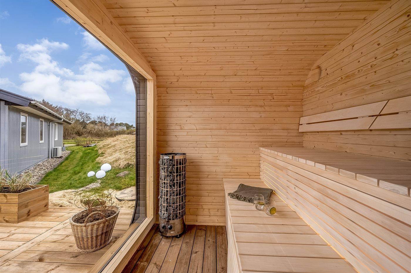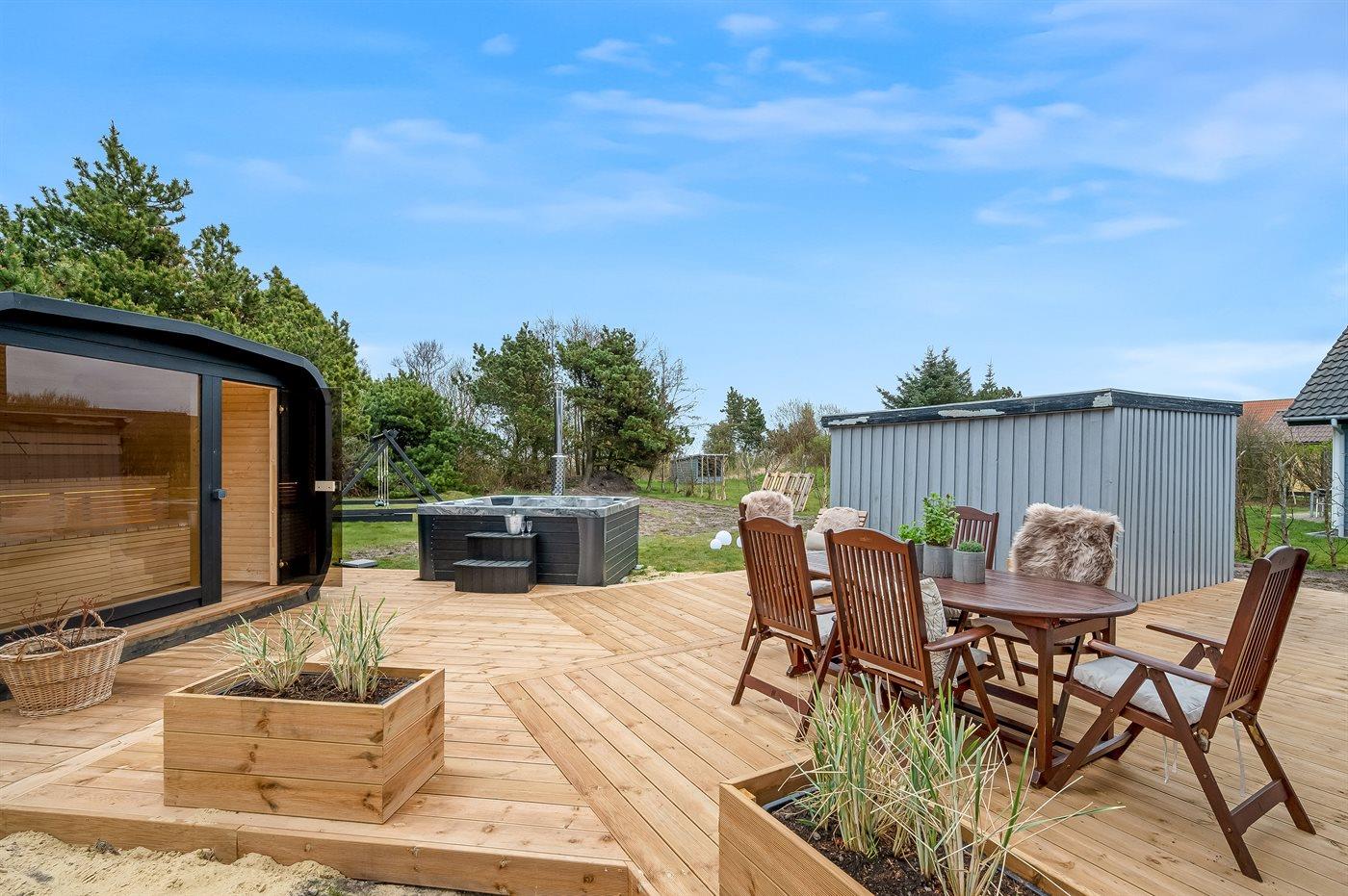 Vil I for alvor skrue op for luksus og selvforkælelse, kan I nyde sommerhusets lækre terrassemiljø og tænde for den udendørs sauna og fyre op i vildmarksbadet. Dækket af det varme vand kan I slappe fuldstændig af, og om aftenen er der frit udsyn til den smukke, klare stjernehimmel. På terrassen finder I også en udendørs bruser, hvor I kan skylle saltvandet af kroppen og sandet af fødderne, når I har taget en dukkert i Vesterhavet. I kan også vælge at tage jeres morgenbad under åben himmel. Udendørsbruseren kan benyttes fra april til november.
