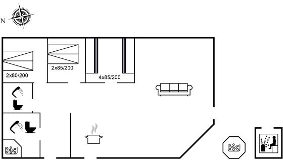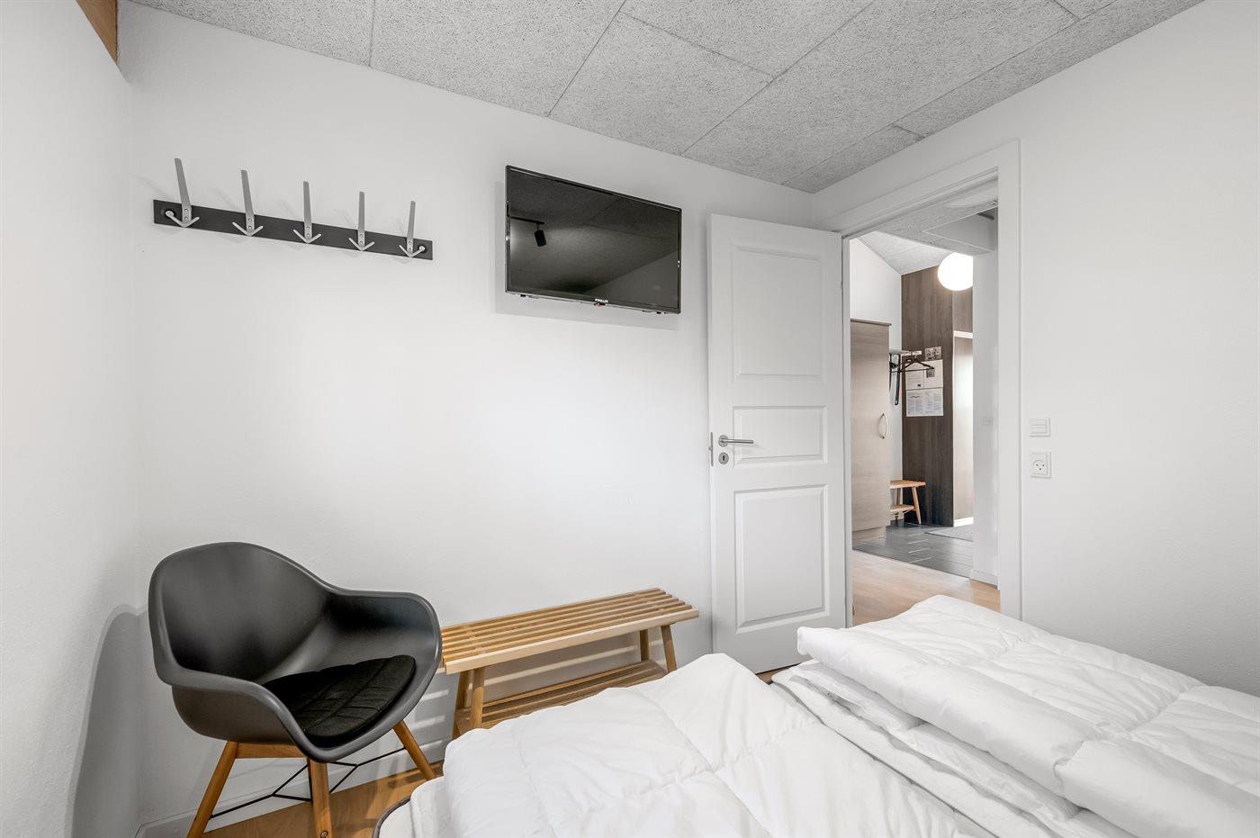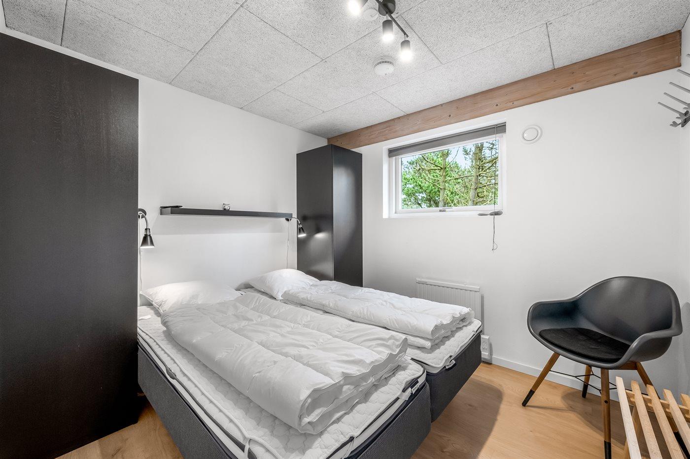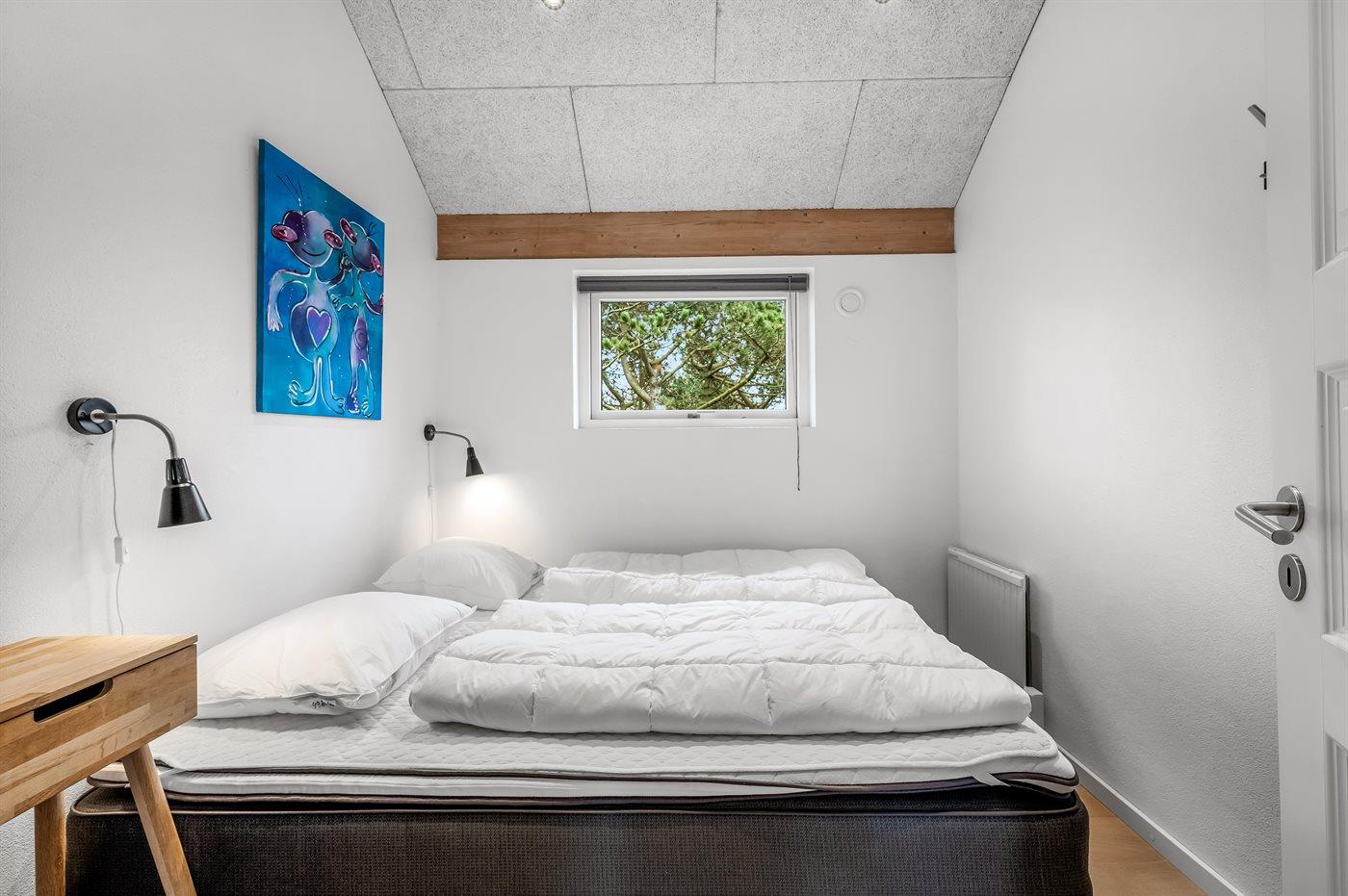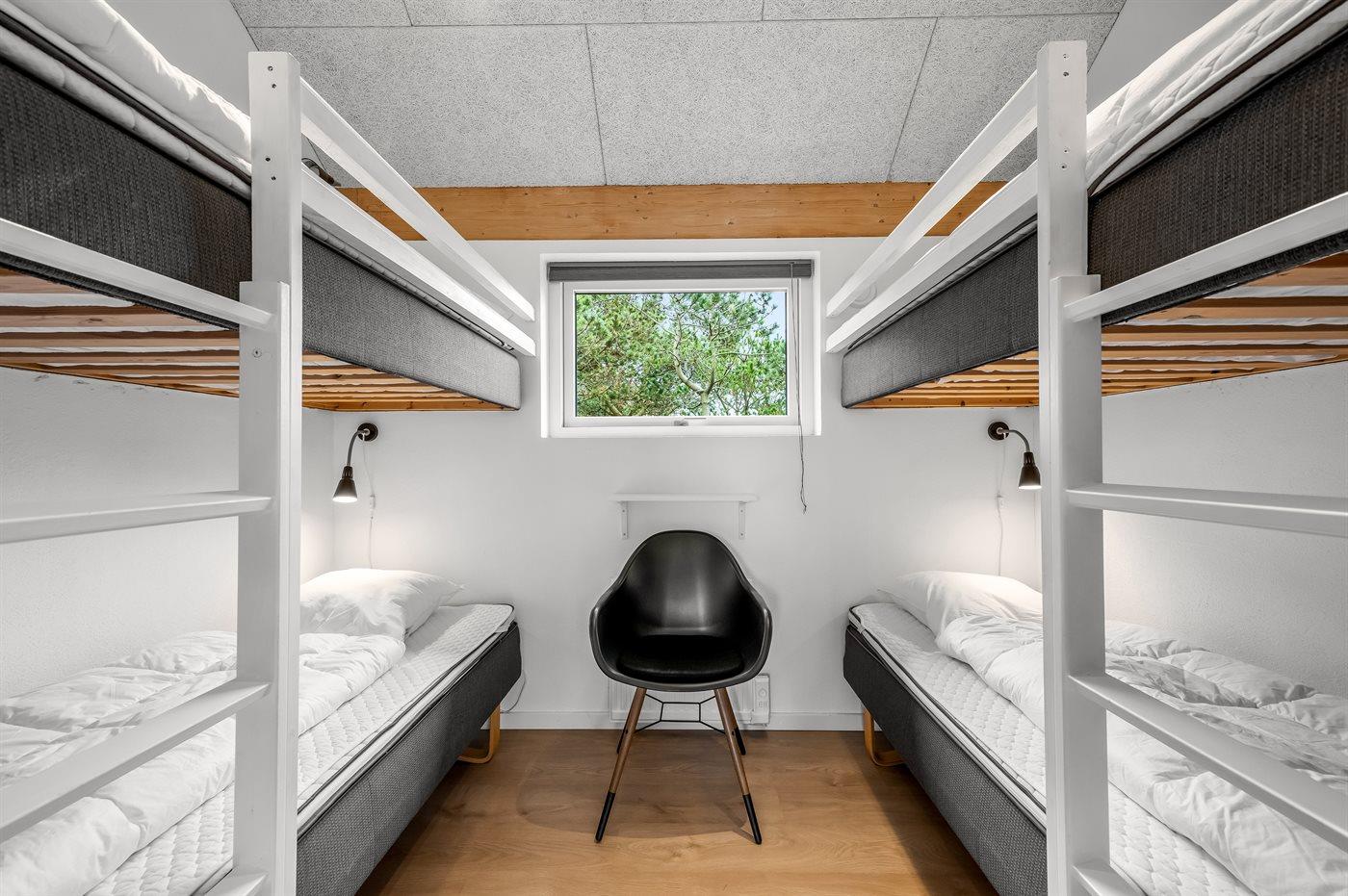 Der er i alt 3 soveværelser. Sovepladserne fordeler sig på: 4 sovepladser i dobbeltsenge. 4 sovepladser i køjesenge. Derudover er der 1 stk. barneseng.