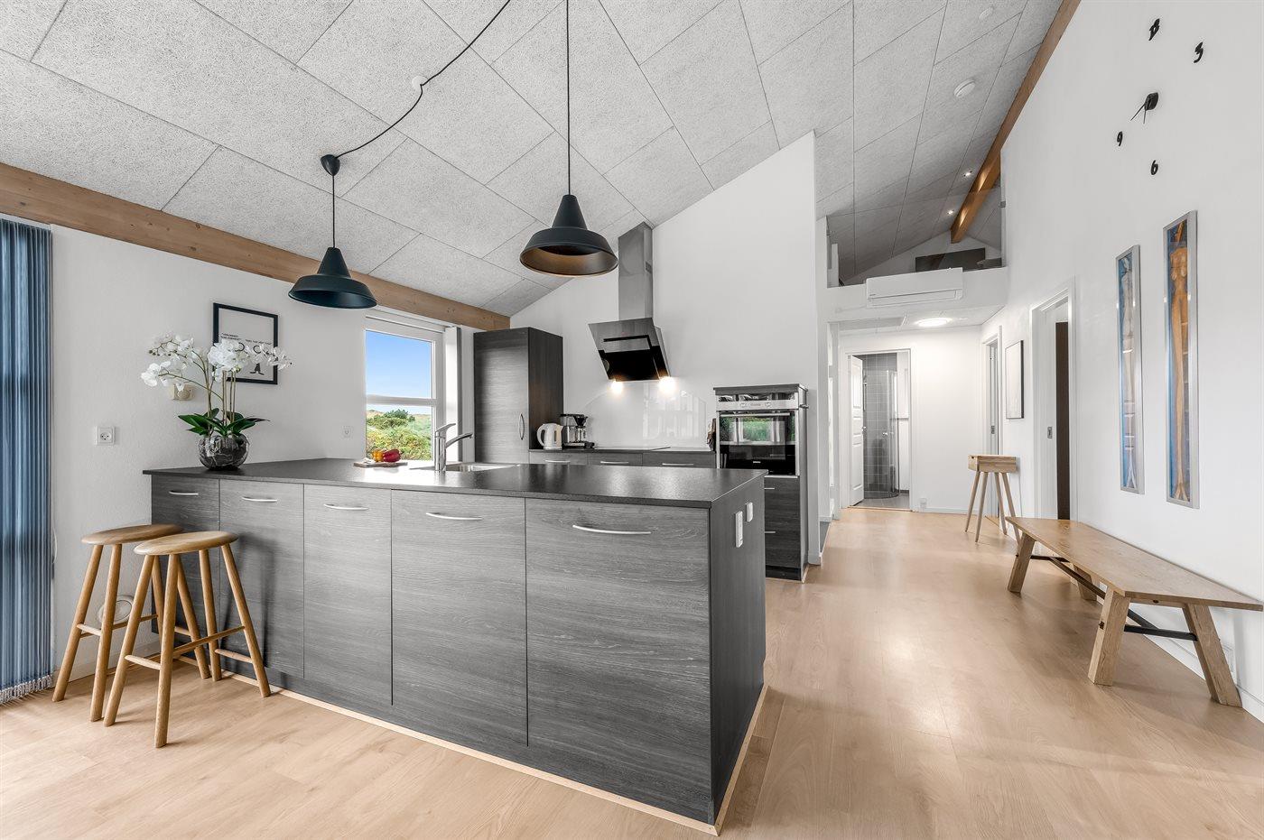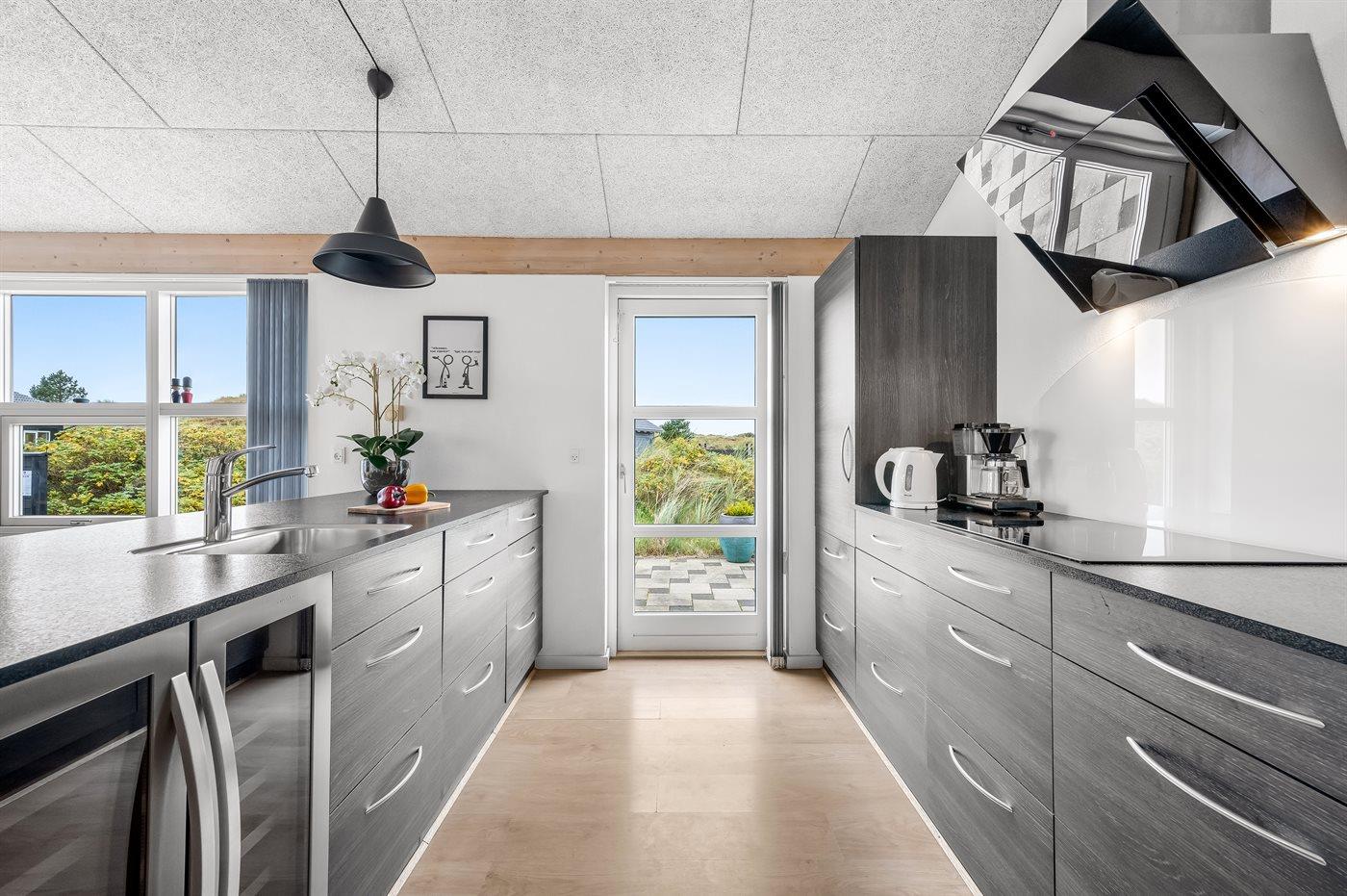 Køkkenet er udstyret med 1 køleskab. Der er 4 induktionskogeplader, varmluftovn, mikrobølgeovn samt opvaskemaskine.