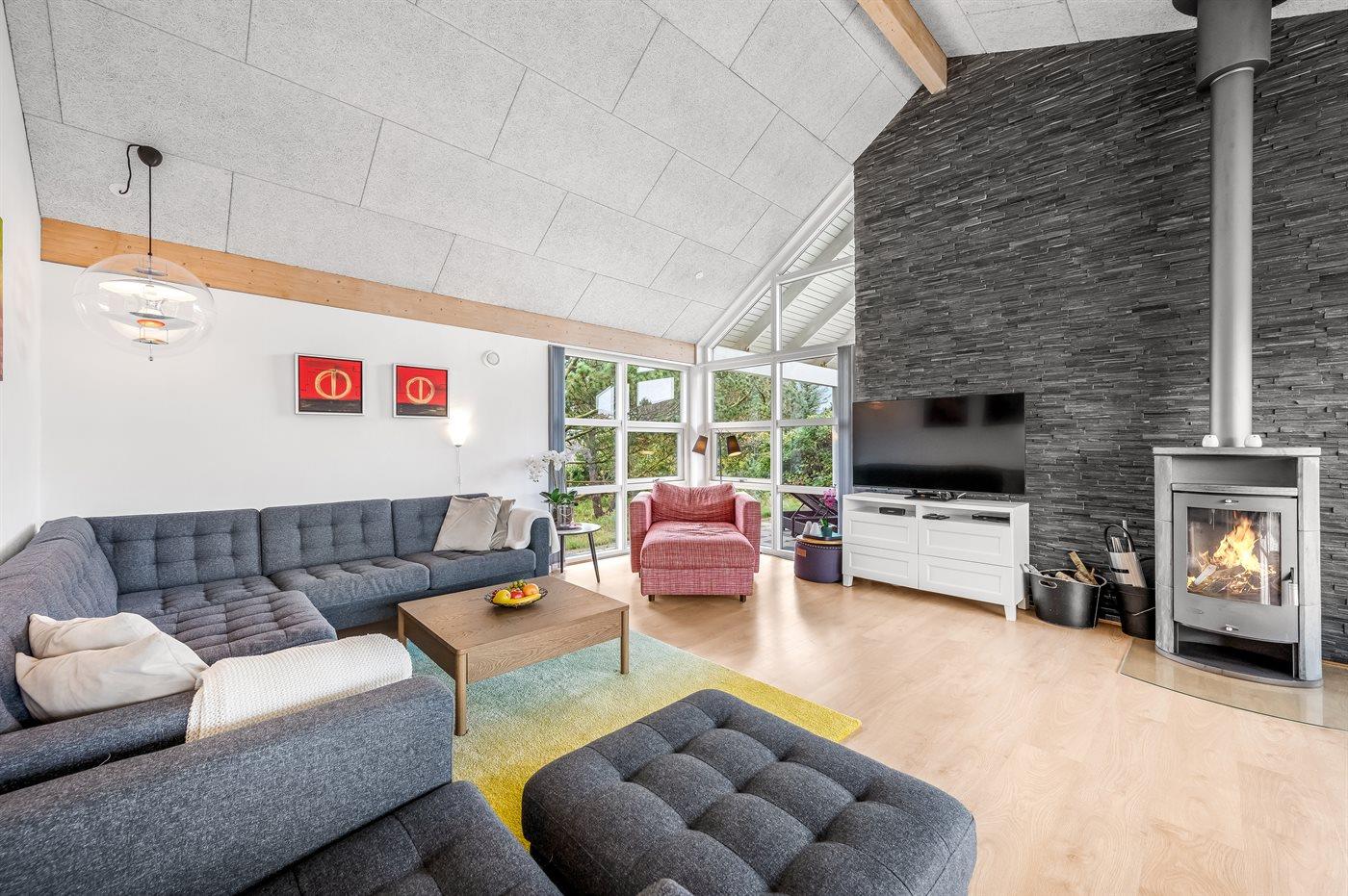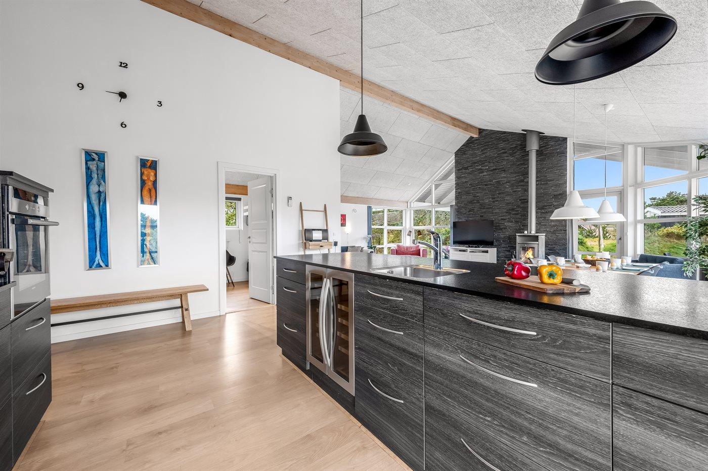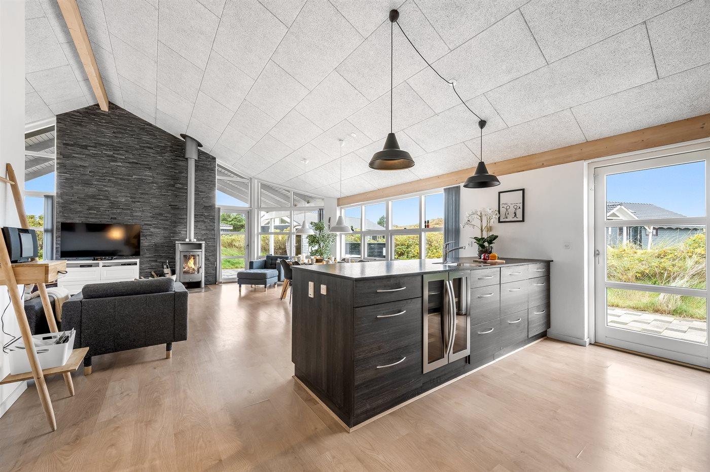 Når I træder ind i det store køkkenalrum, mærker I straks den lyse og luftige stemning. Loft til kip og store vinduer sørger for et smukt lysindfald, så rummet føles indbydende og behageligt. I kan slappe af i de komfortable sofaer i stuen med en god bog eller blot nyde brændeovnens knitren. Køkkenet er veludstyret og indrettet, så flere kan hygge sig sammen om madlavningen.