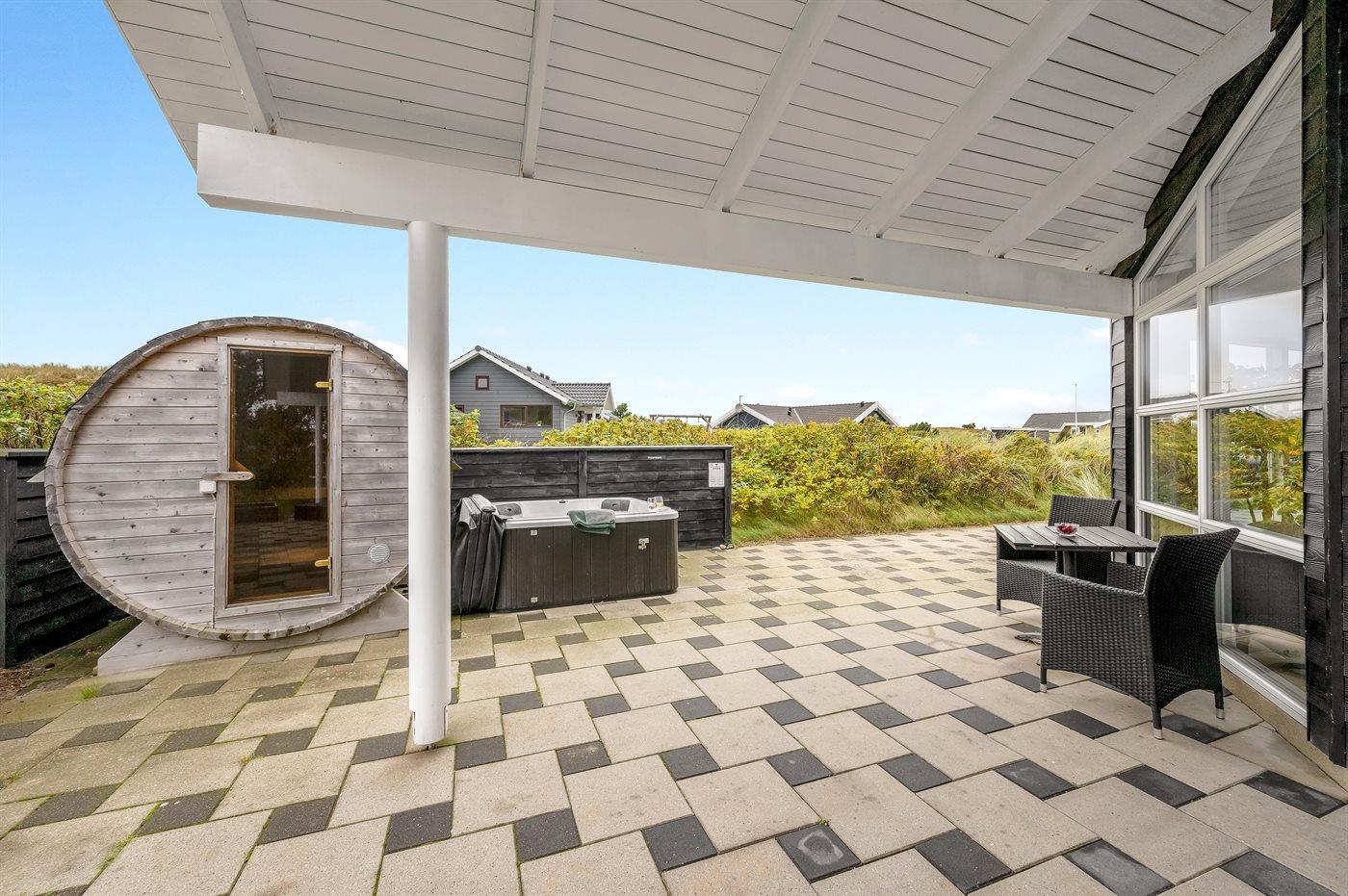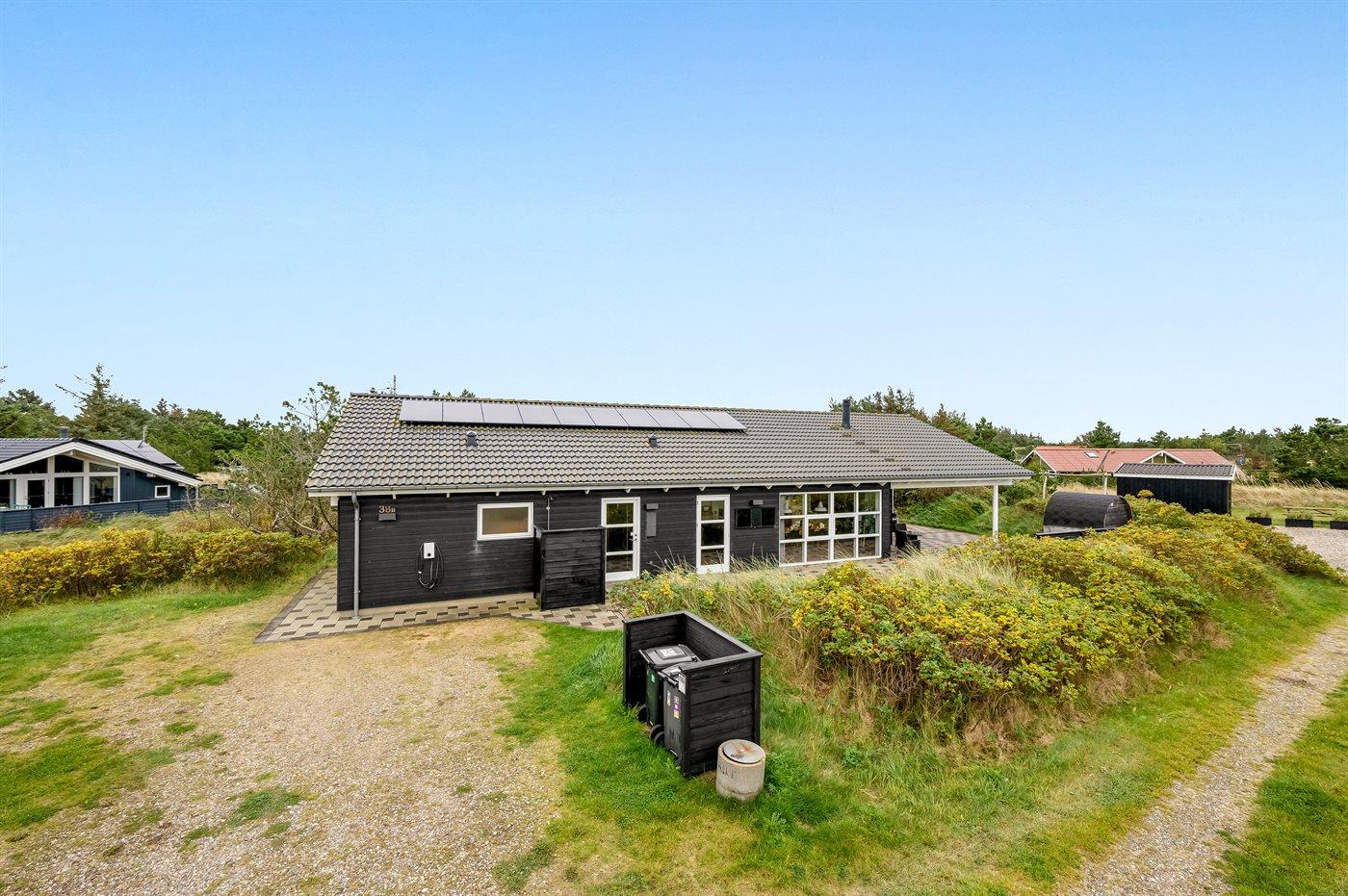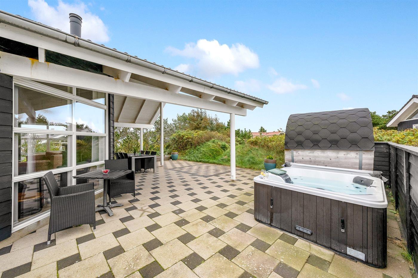 Moderne sommerhus ved Vesterhavet med spabad, sauna og naturgrund for afslapning og hygge.
