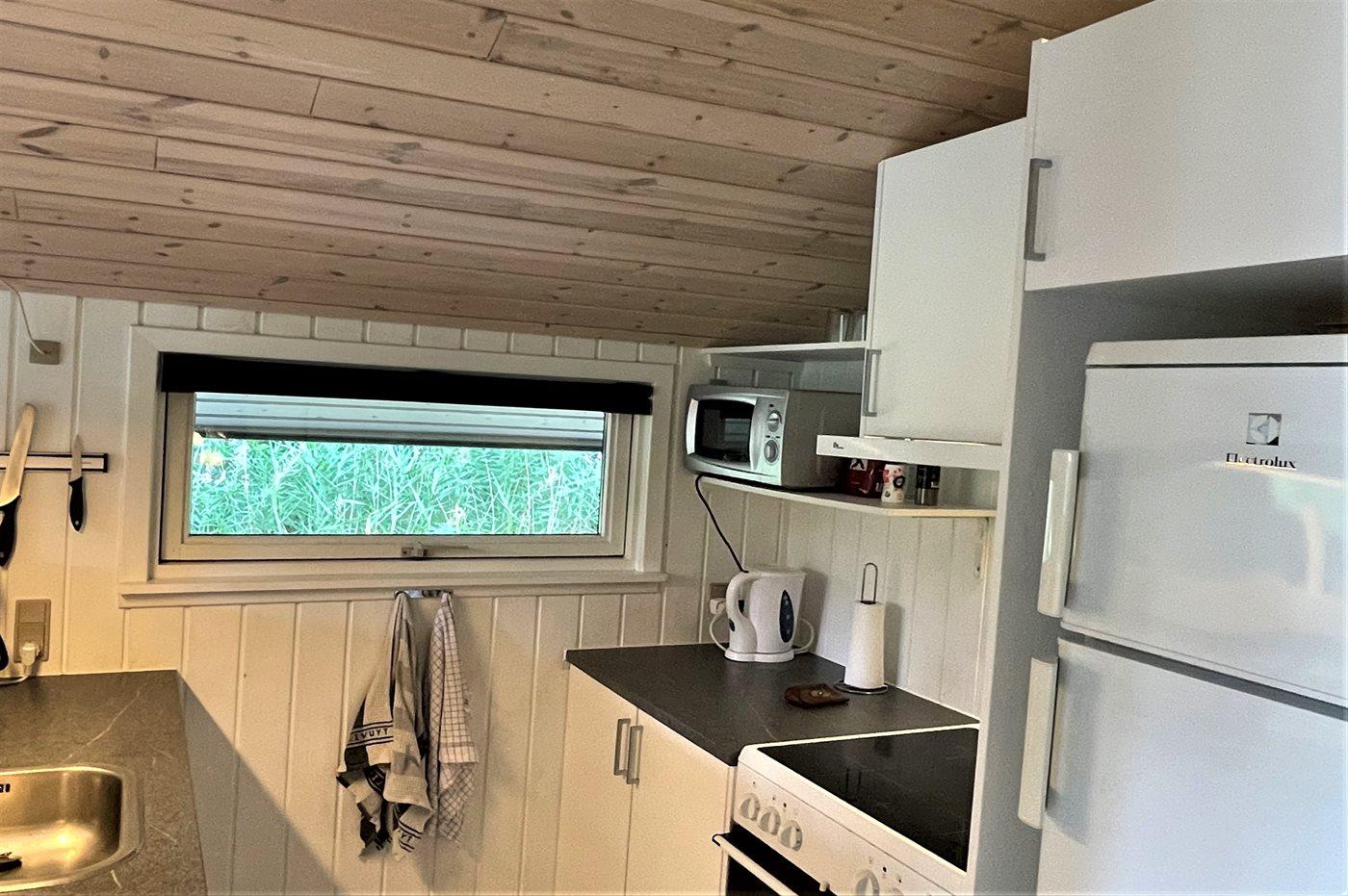 Køkkenet er udstyret med 1 køleskab. Der er 4 elkogeplader, varmluftovn, mikrobølgeovn samt opvaskemaskine.